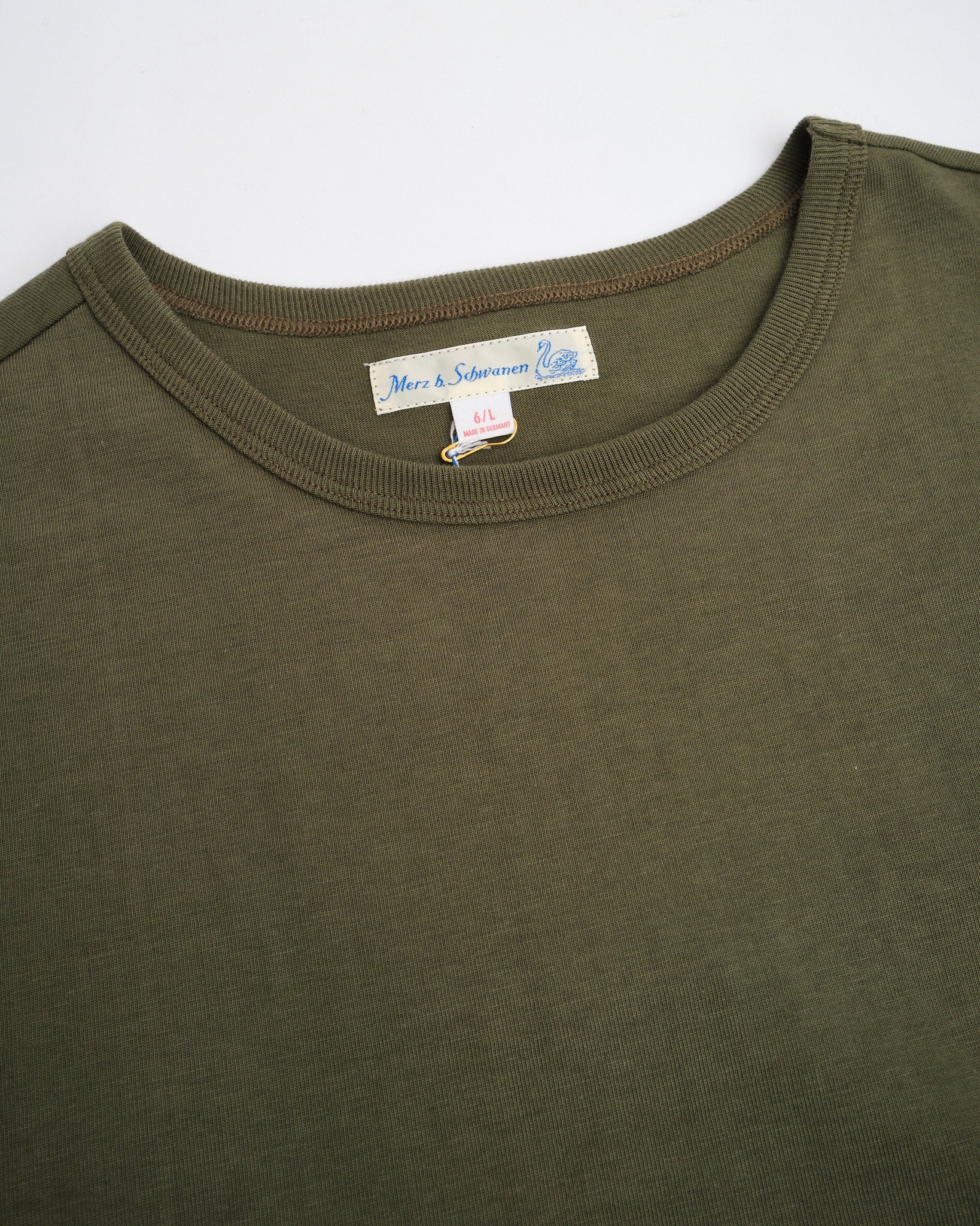 Le Merz b. SCHWANEN 215.40 T-shirt à boucle masculine dans l’armée verte illustre l’artisanat allemand traditionnel. Produit sur des machines à roues à boucle vintage, ce tee-shirt classique est fabriqué à partir de coton 100% biologique, offrant un tissu doux, durable et sans couture. La couleur « 40 armée » ajoute une touche polyvalente et robuste à n’importe quelle garde-robe, ce qui le rend adapté à diverses occasions.