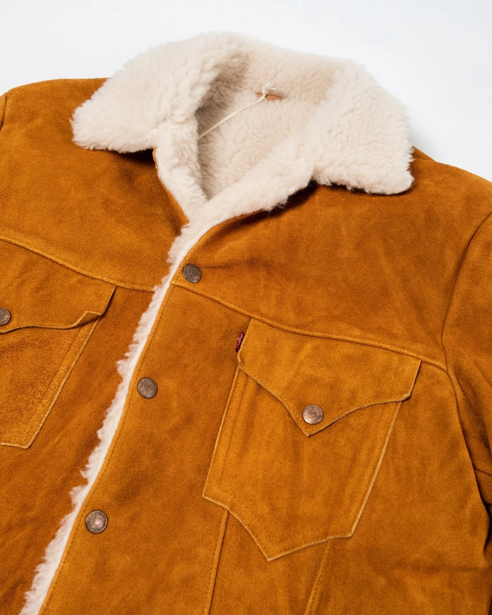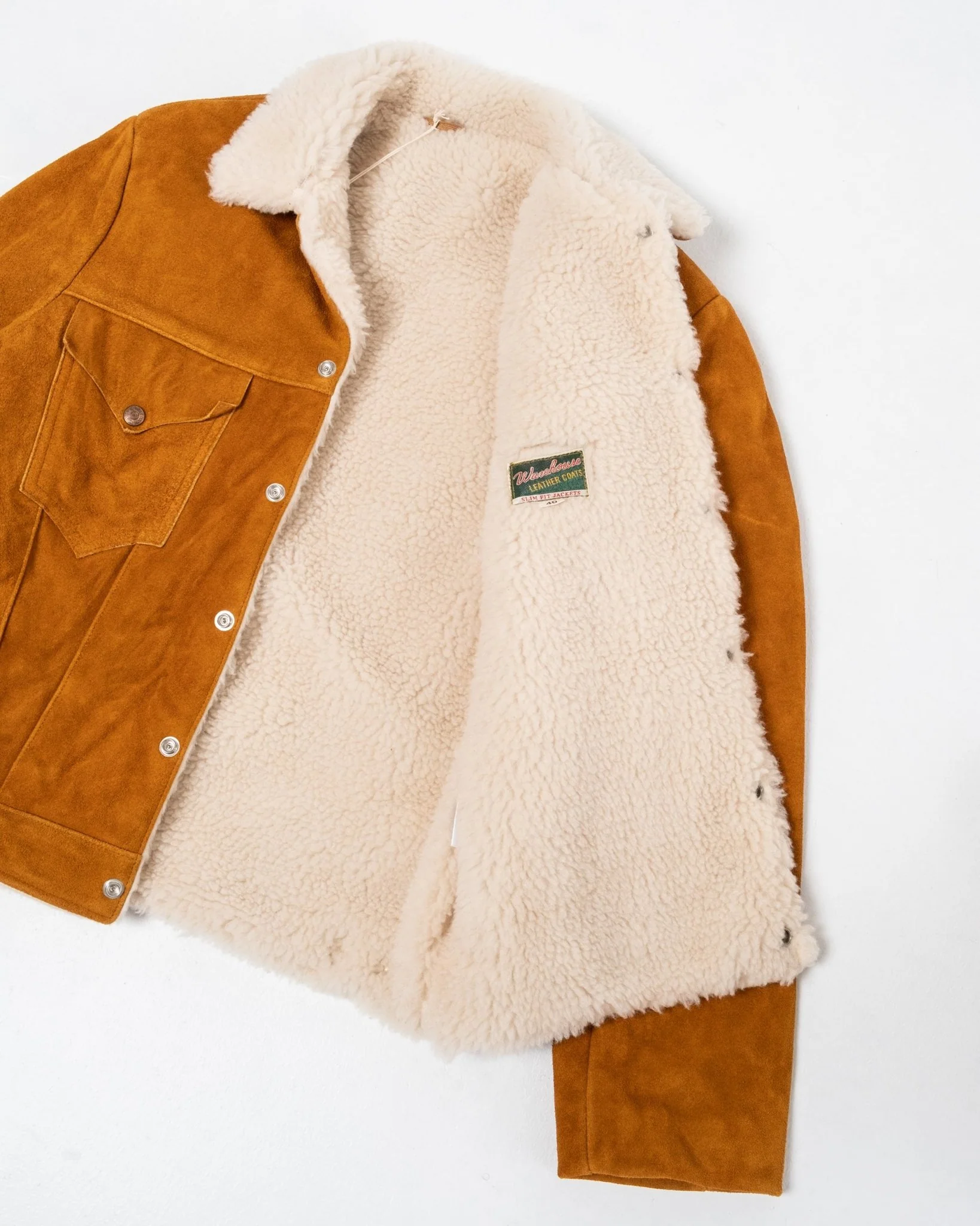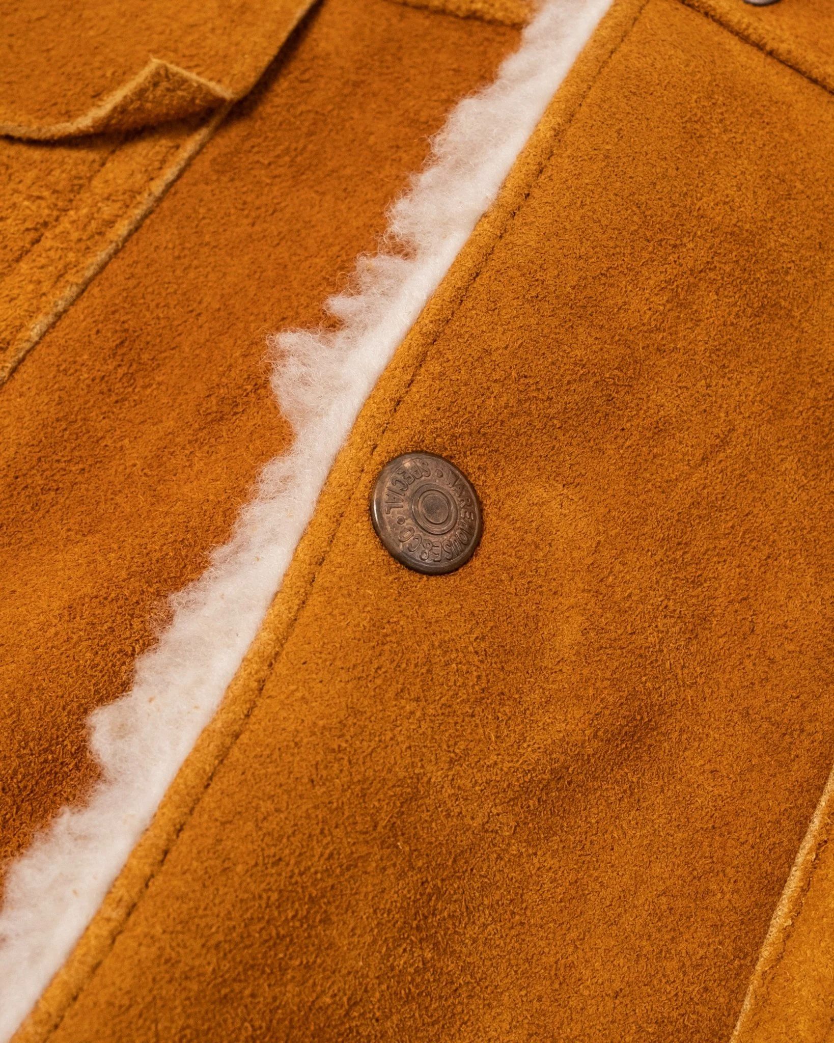 Belle veste de ranch en daim dans une belle cuve de vache. Avec un front de bouton slim classique et de bouton-instant. Terminé avec deux poches de poitrine, un ourlet réglable et une languette de logo sur la poche gauche. Le corps est entièrement bordé d’une toison boa en acrylique moelleuse pour vous garder au chaud. Fait au Japon.