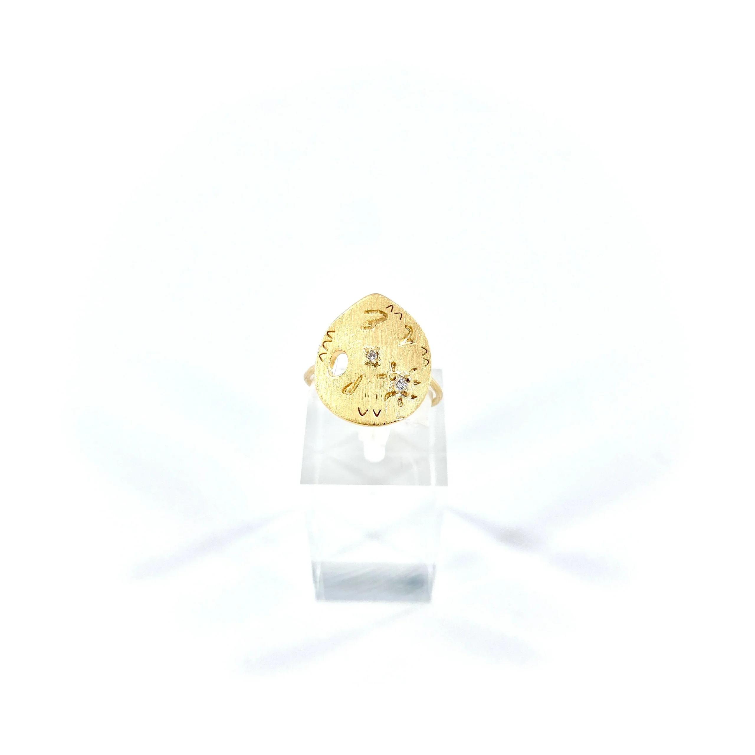 Bague médaille gravée, brossée, ajourée, sertie de deux zircons blancs. La médaille à la fois ethnique et précieuse se pose parfaitement sur les doigts. Diamètre Médaille : 1.5cm Plaqué Or 18 carats
