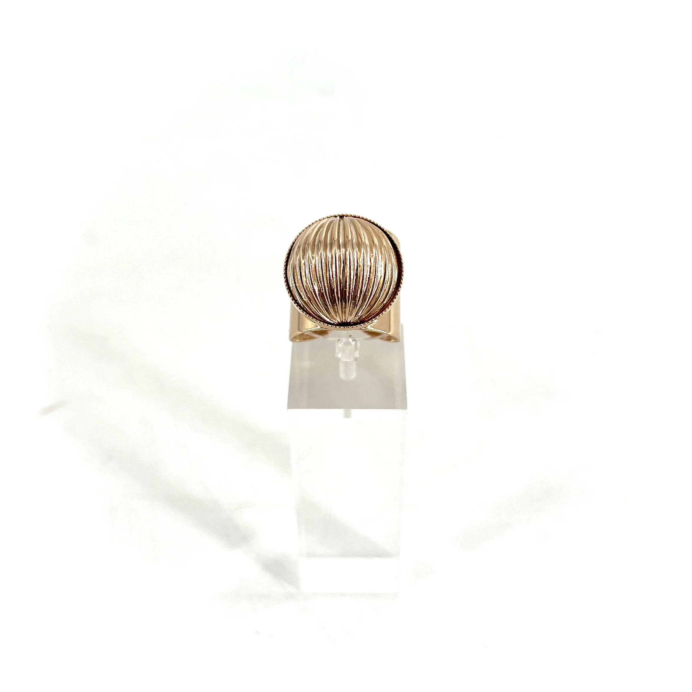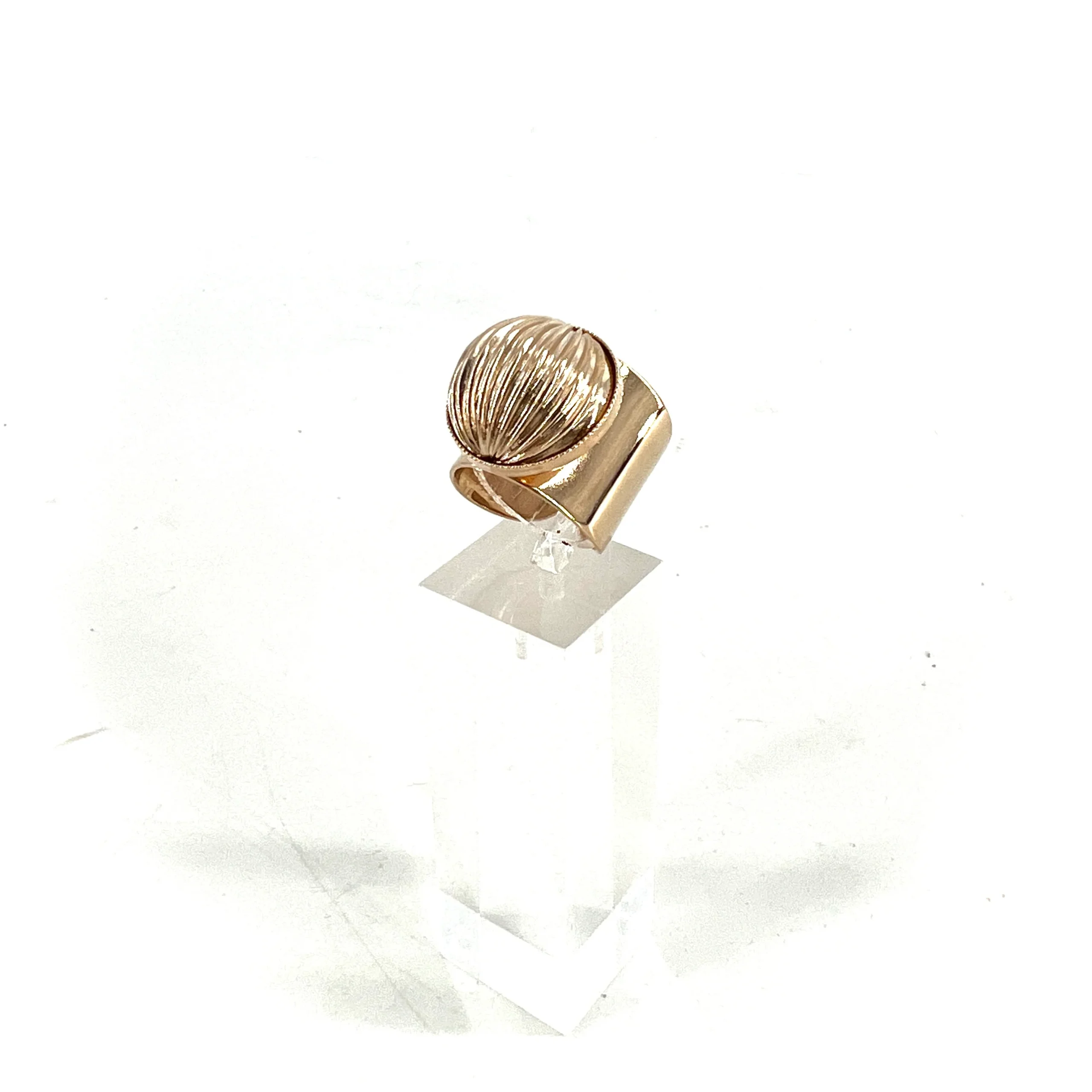 Cette bague, en plaqué Or, est composée d’un anneau large, agrémenté d’une bille ciselée.
