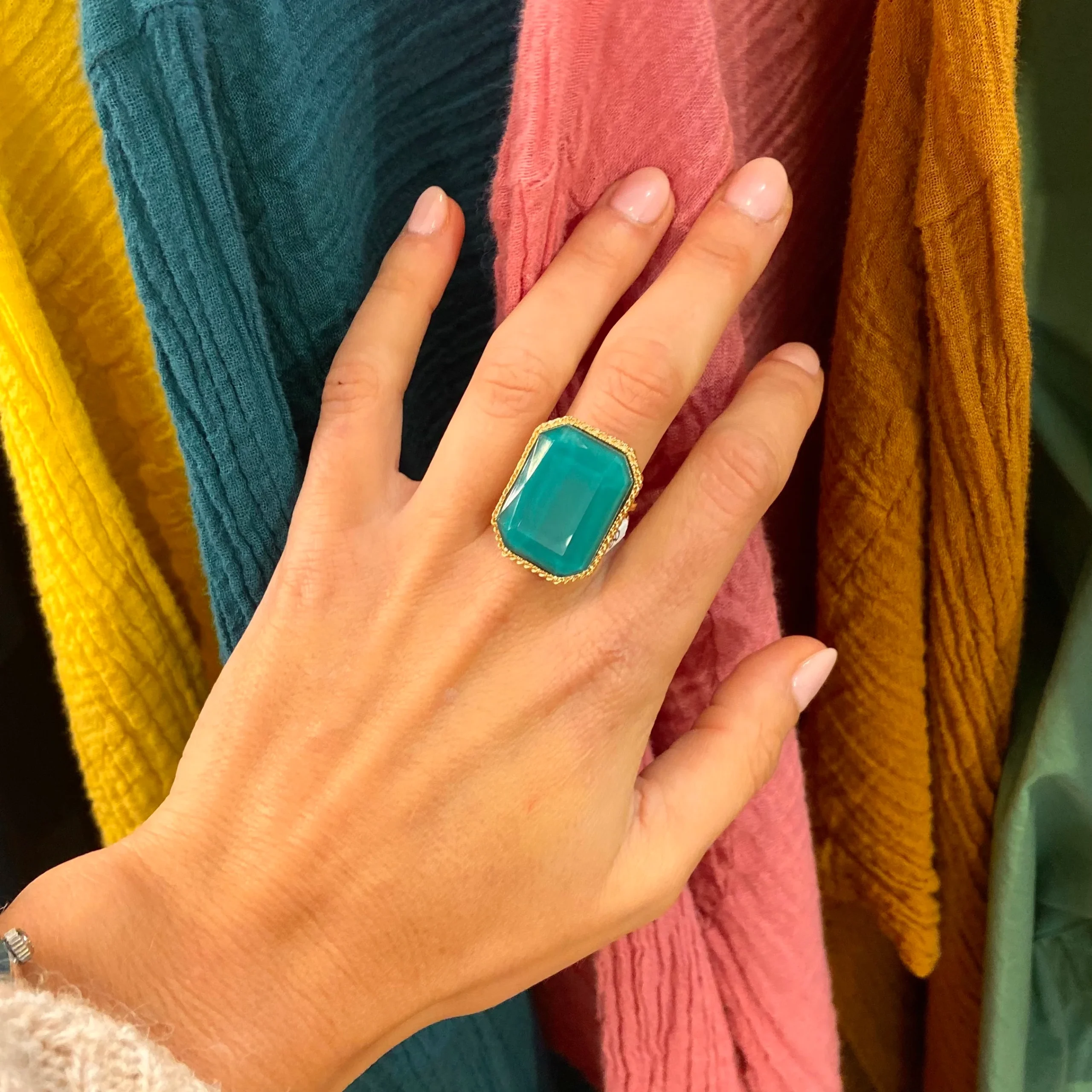 Cette bague, en métal doré à l’Or fin 14 carats, se compose d’un imposant cabochon en pâte de verre turquoise.Élégante, présente, et forte en couleur à porter seule ou en association. Existe aussi en pâte de verre violet. Dimensions: 2.5cm x 1.2cm