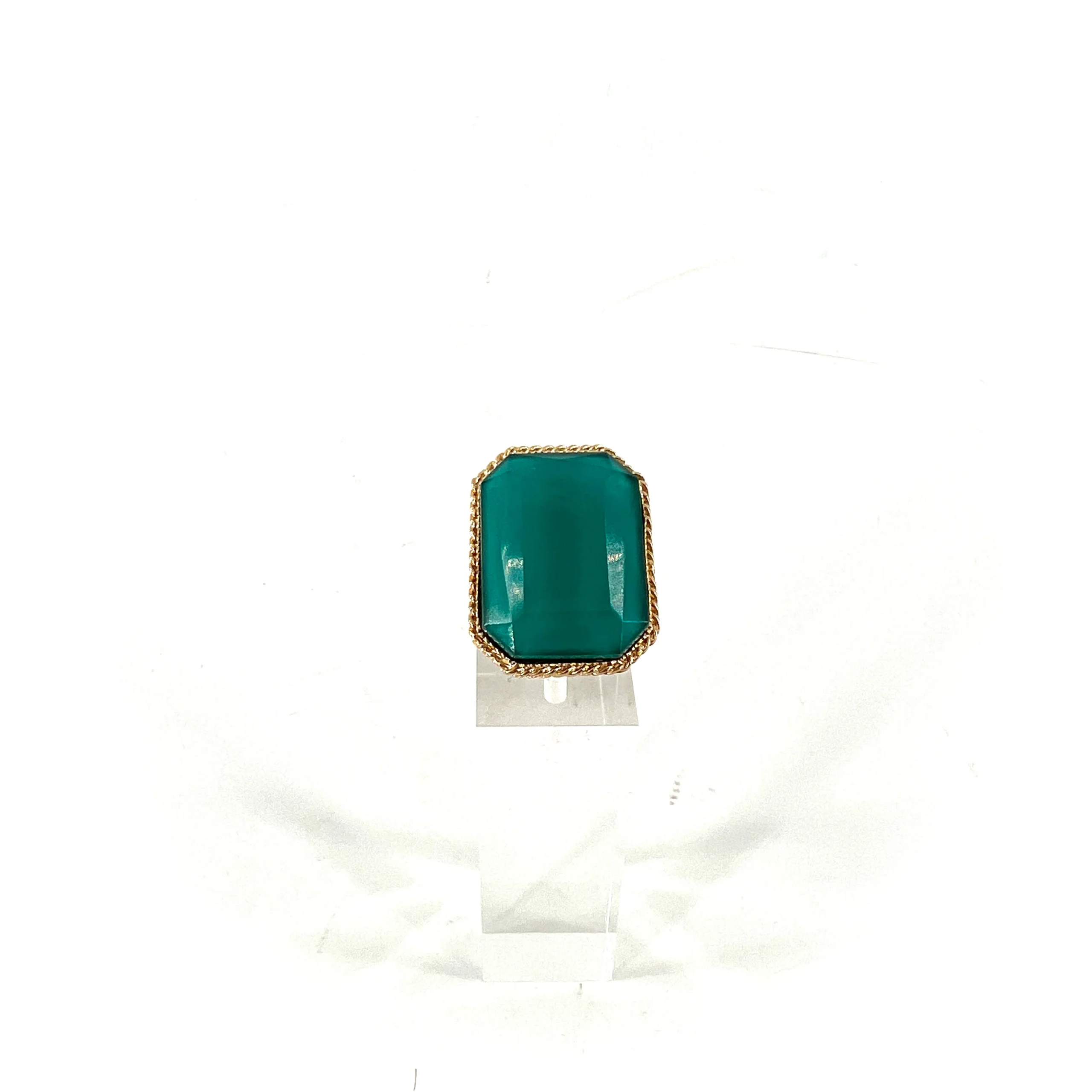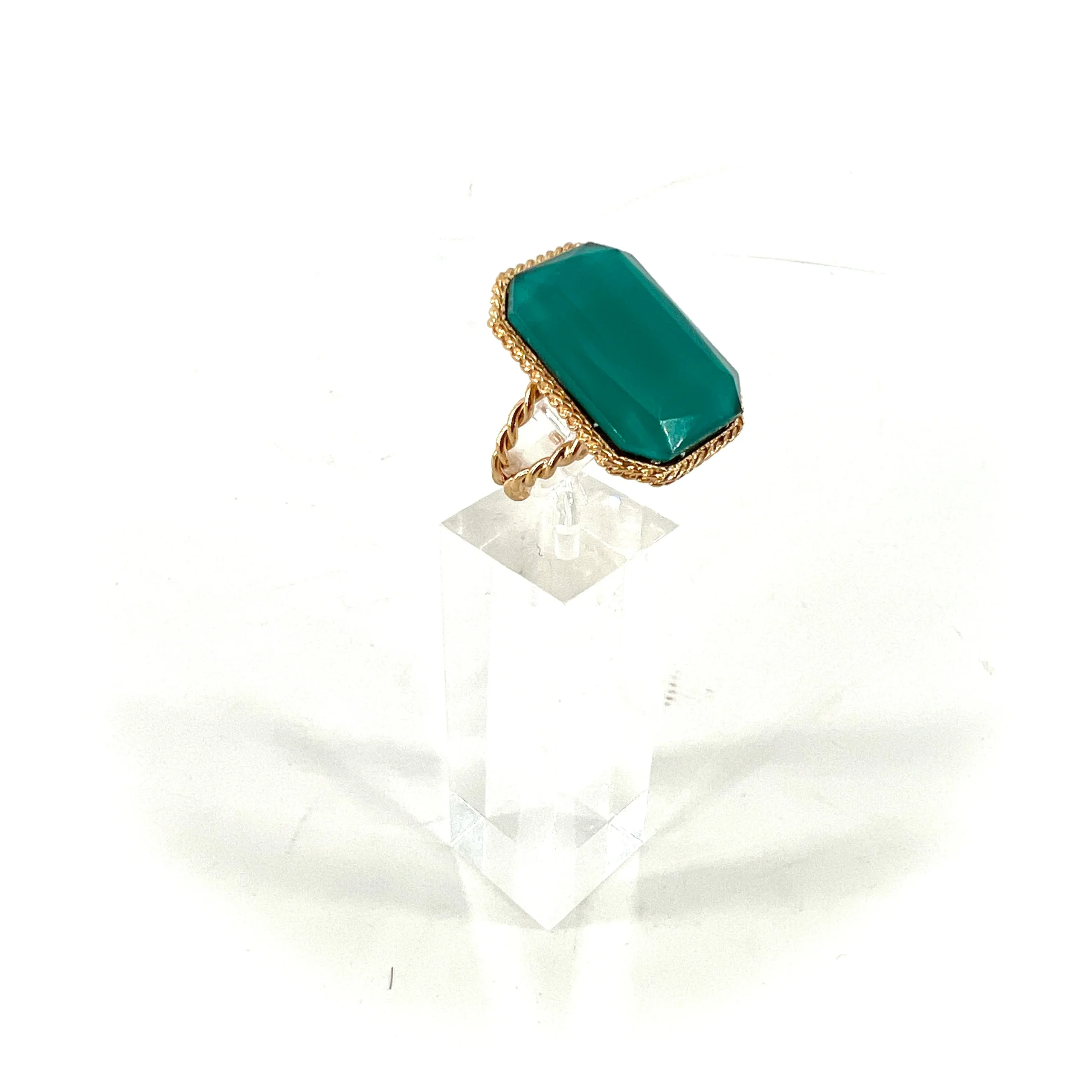 Cette bague, en métal doré à l’Or fin 14 carats, se compose d’un imposant cabochon en pâte de verre turquoise.