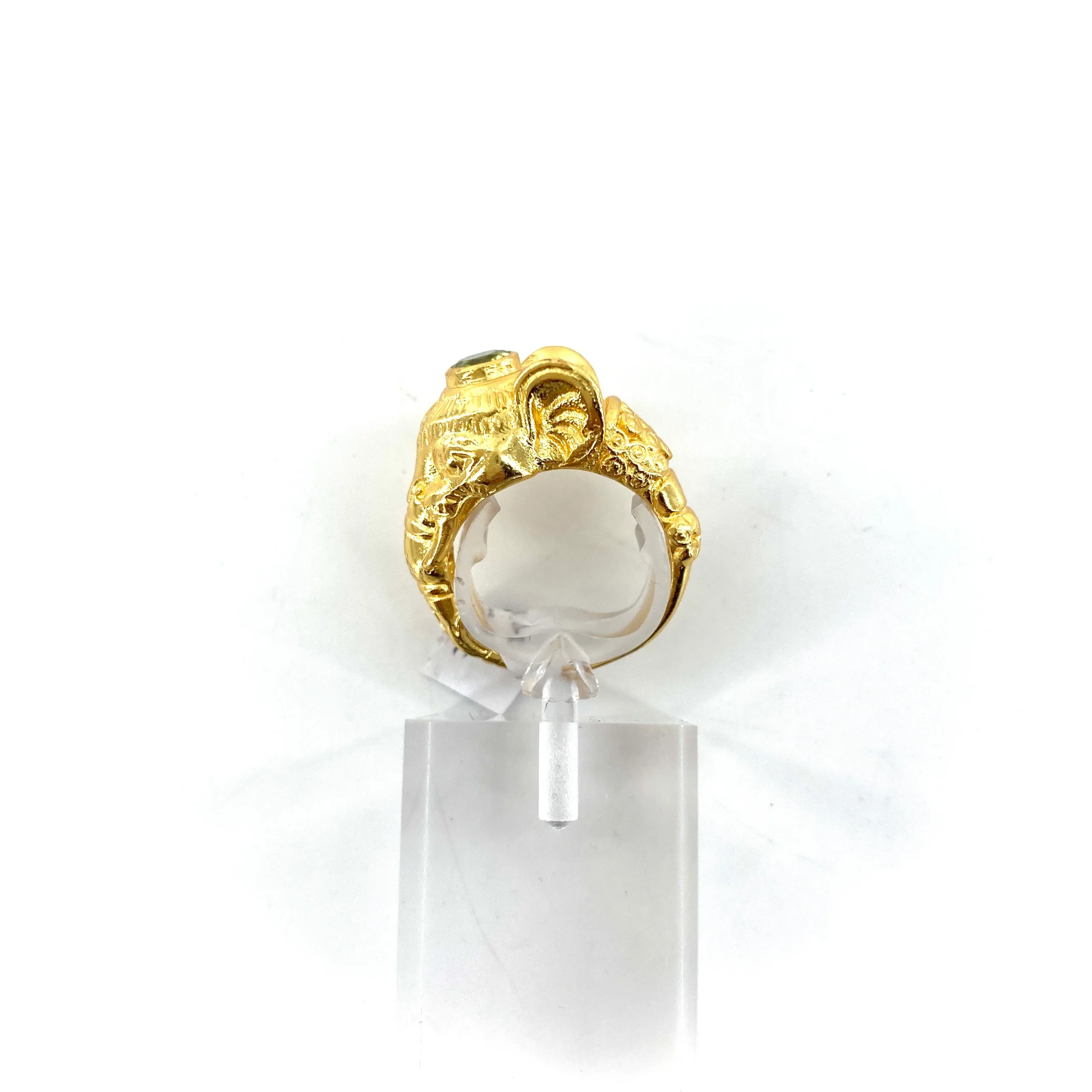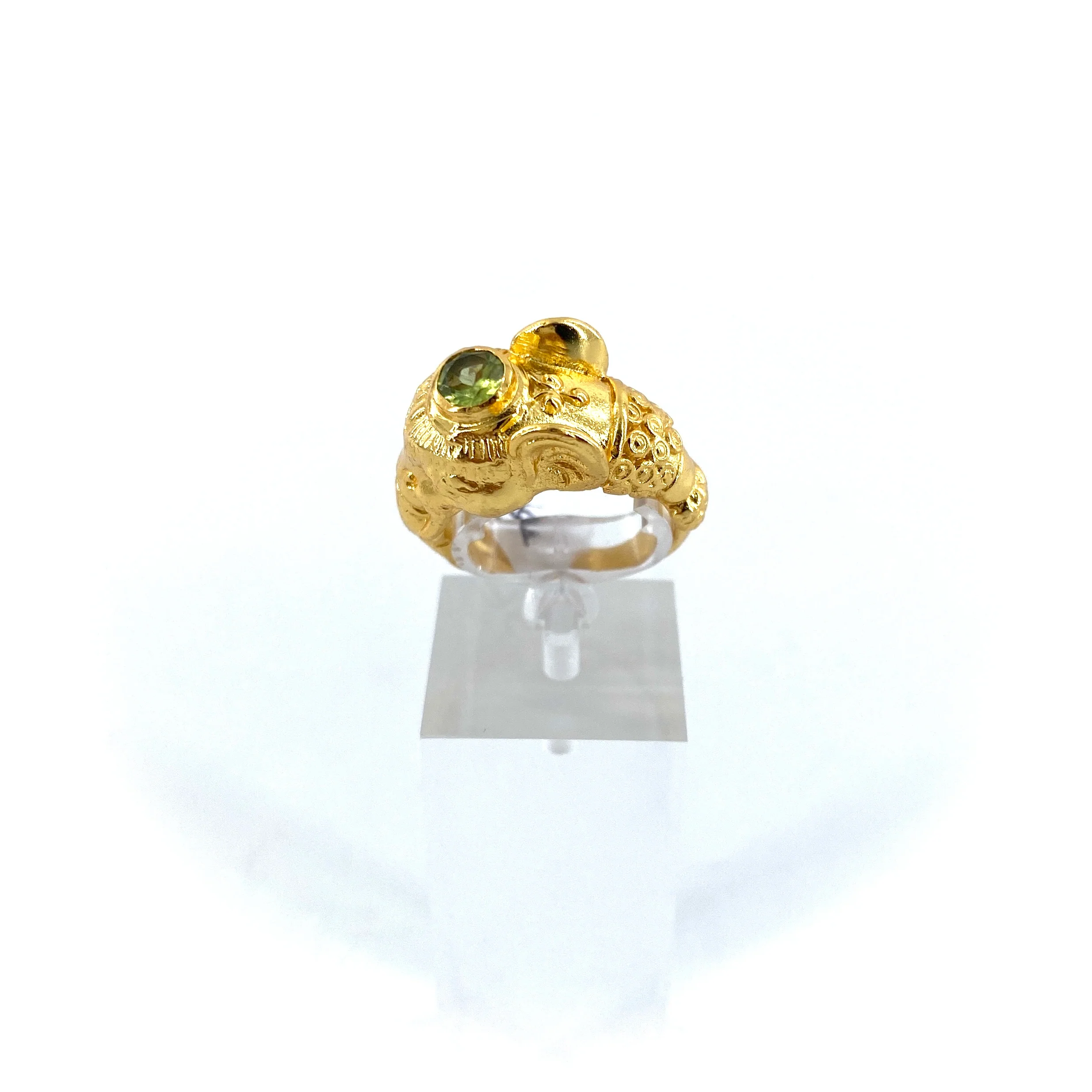 Cette bague « Éléphant », en Plaqué Or, symbole de sagesse, douceur et prospérité, est ornée d’un Péridot facetté.