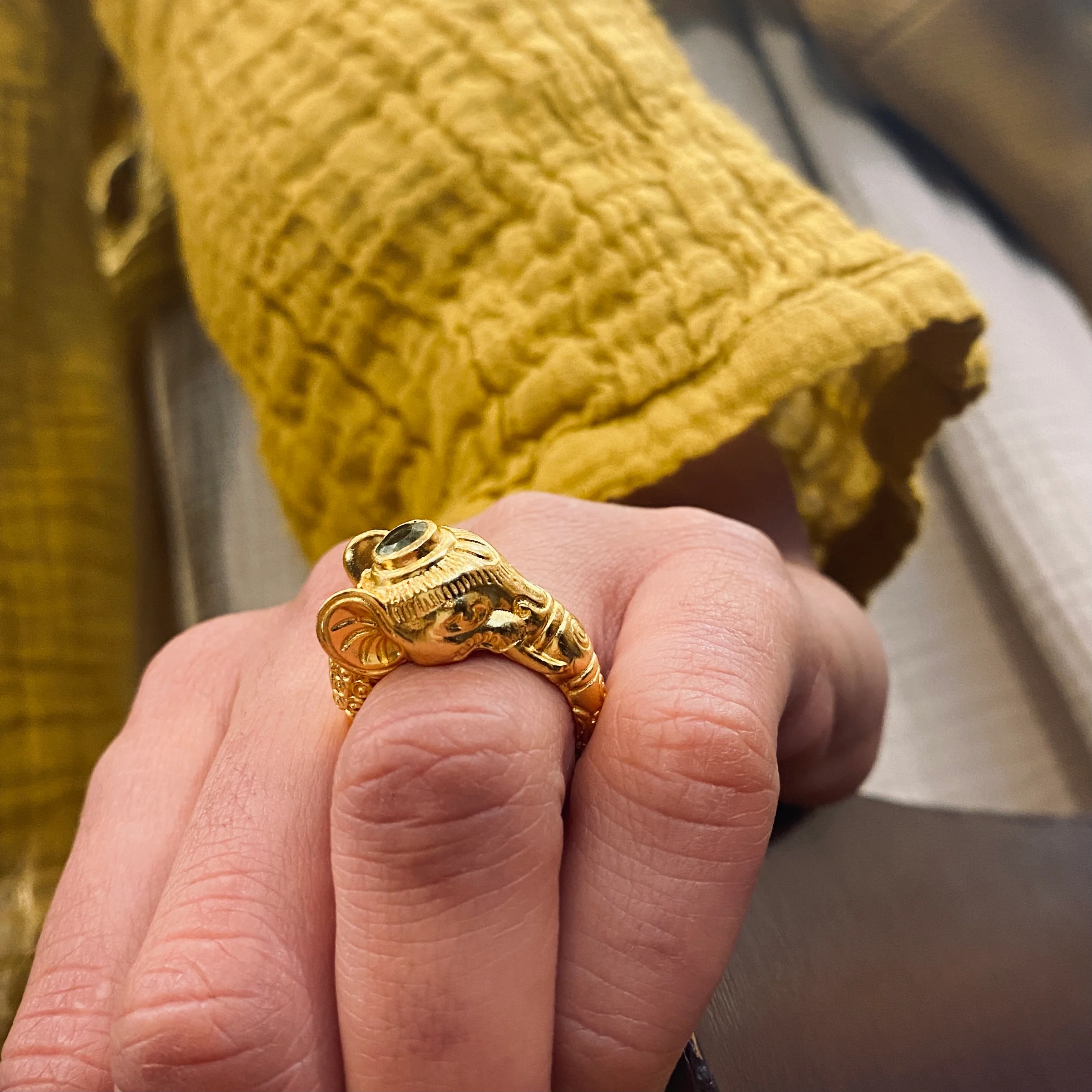 Cette bague « Éléphant », en Plaqué Or, symbole de sagesse, douceur et prospérité, est ornée d’un Péridot facetté.Aussi drôle qu’élégante, inattendue que classique, on adore.Existe aussi en Turquoise et en Améthyste.Chaque pierre est unique, sa couleur peut varier ce qui en fait sa rareté.