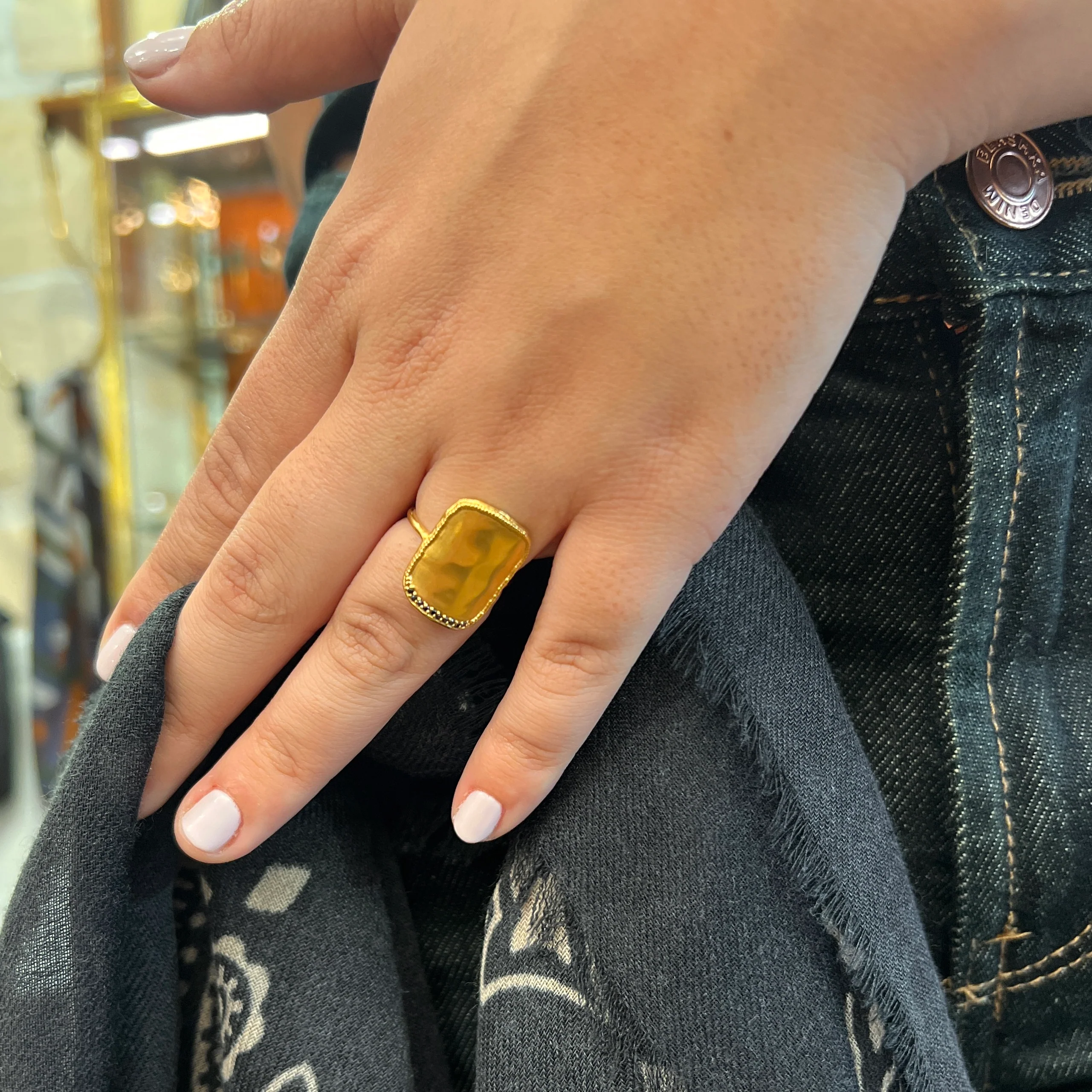 Cette bague se compose d’un anneau fin, et d’une rectangulaire arrondie sur les angles et légèrement martelée en plaqué or 3mc sertie de zircons noirs.