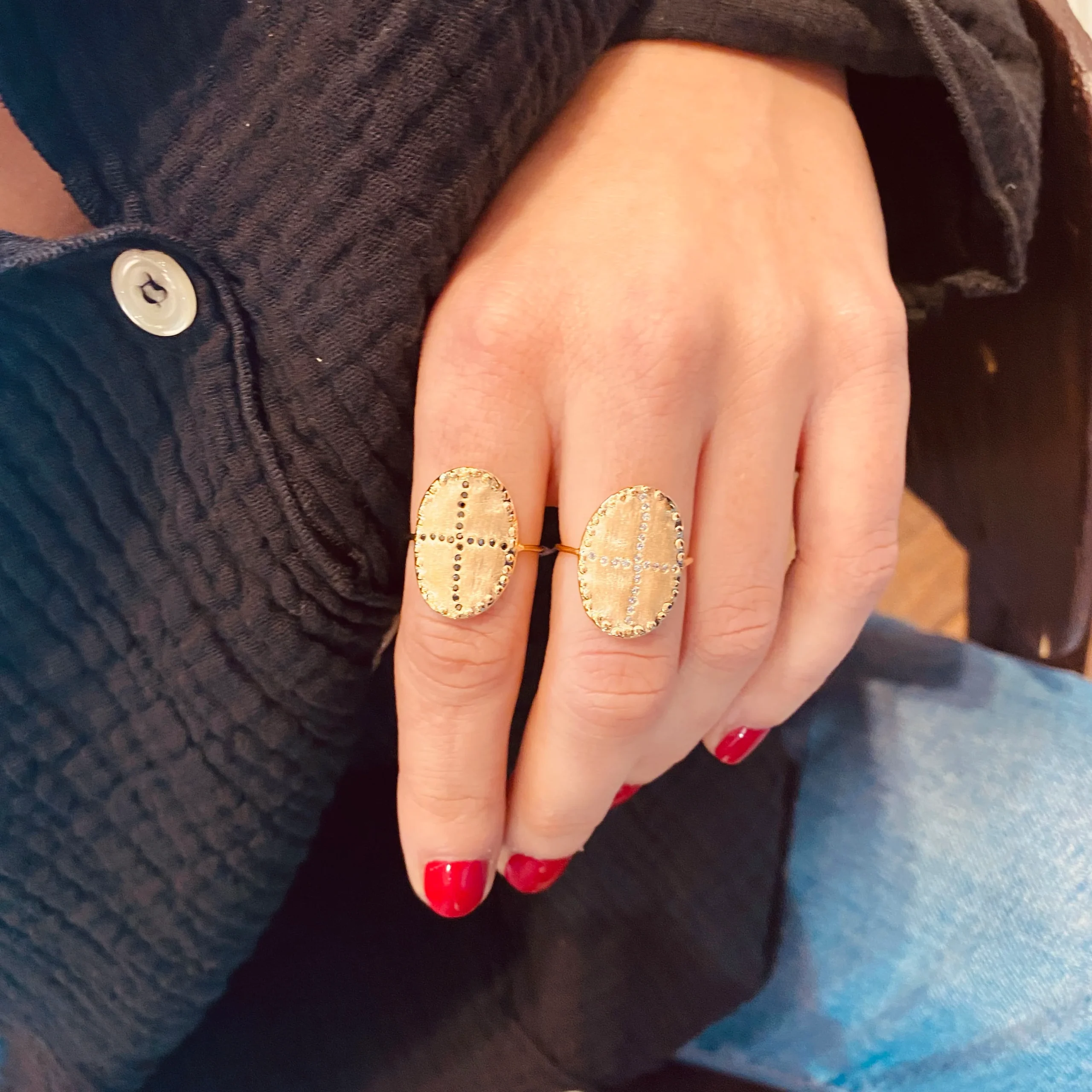 Bague ovale, doré brossé, sertie de zircons blancs.Cette bague épouse parfaitement le doigt, à porter à l’index, l’annulaire ou sur le majeur!Existe en zircons noirs. Taille de la Médaille : 2cm x 1cm Plaqué Or 18 carats
