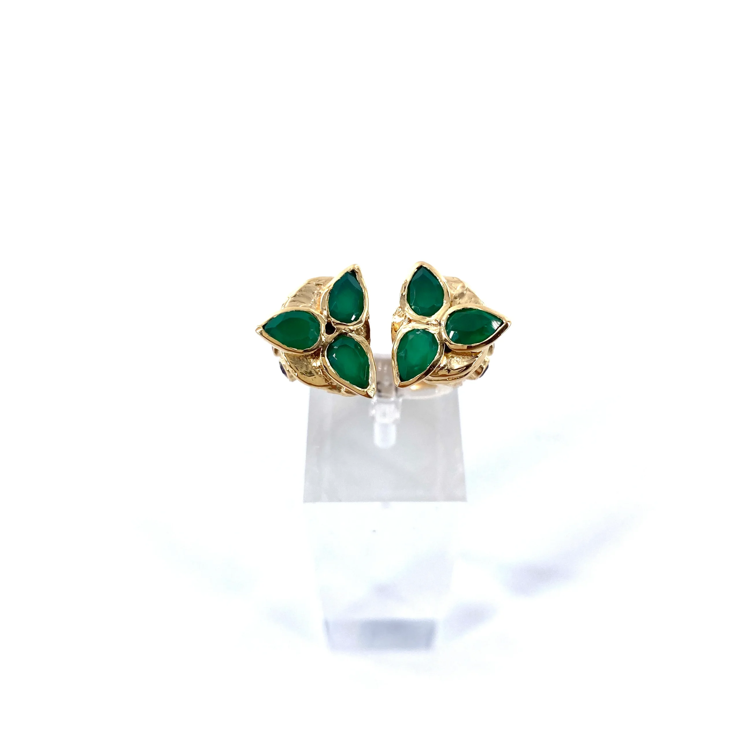Cette bague jonc, en plaqué Or, est ornée de Tourmalines aux couleurs différentes sur les côtés, et de deux fleurs en Onyx vert sur les deux extrémités. Plus qu’un bijou, un accessoire. Plaqué Or.Pierres semi-précieuses sélectionnées en Inde.Chaque pierre étant unique sa couleur peut varier, ce qui en fait sa rareté.