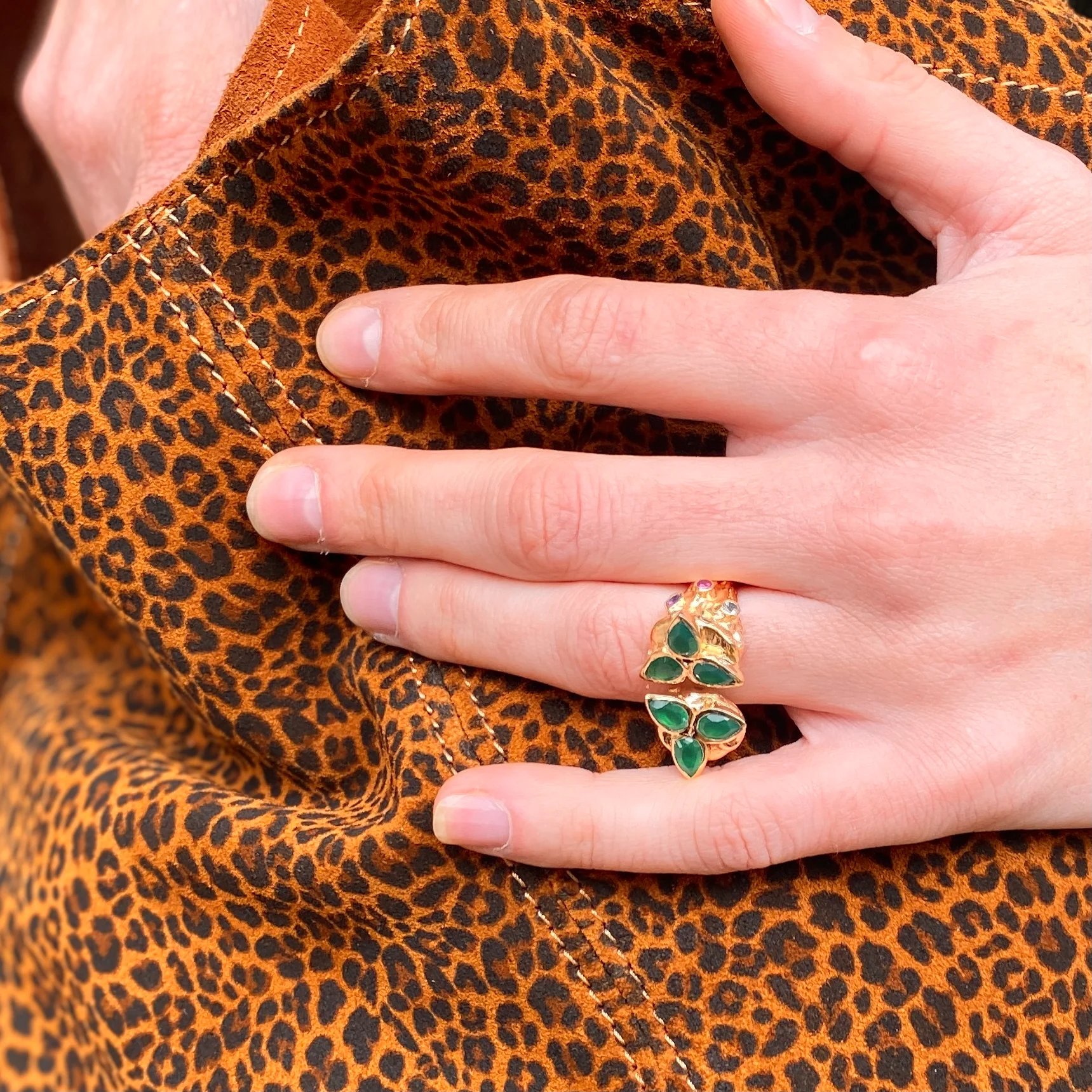 Cette bague jonc, en plaqué Or, est ornée de Tourmalines aux couleurs différentes sur les côtés, et de deux fleurs en Onyx vert sur les deux extrémités.