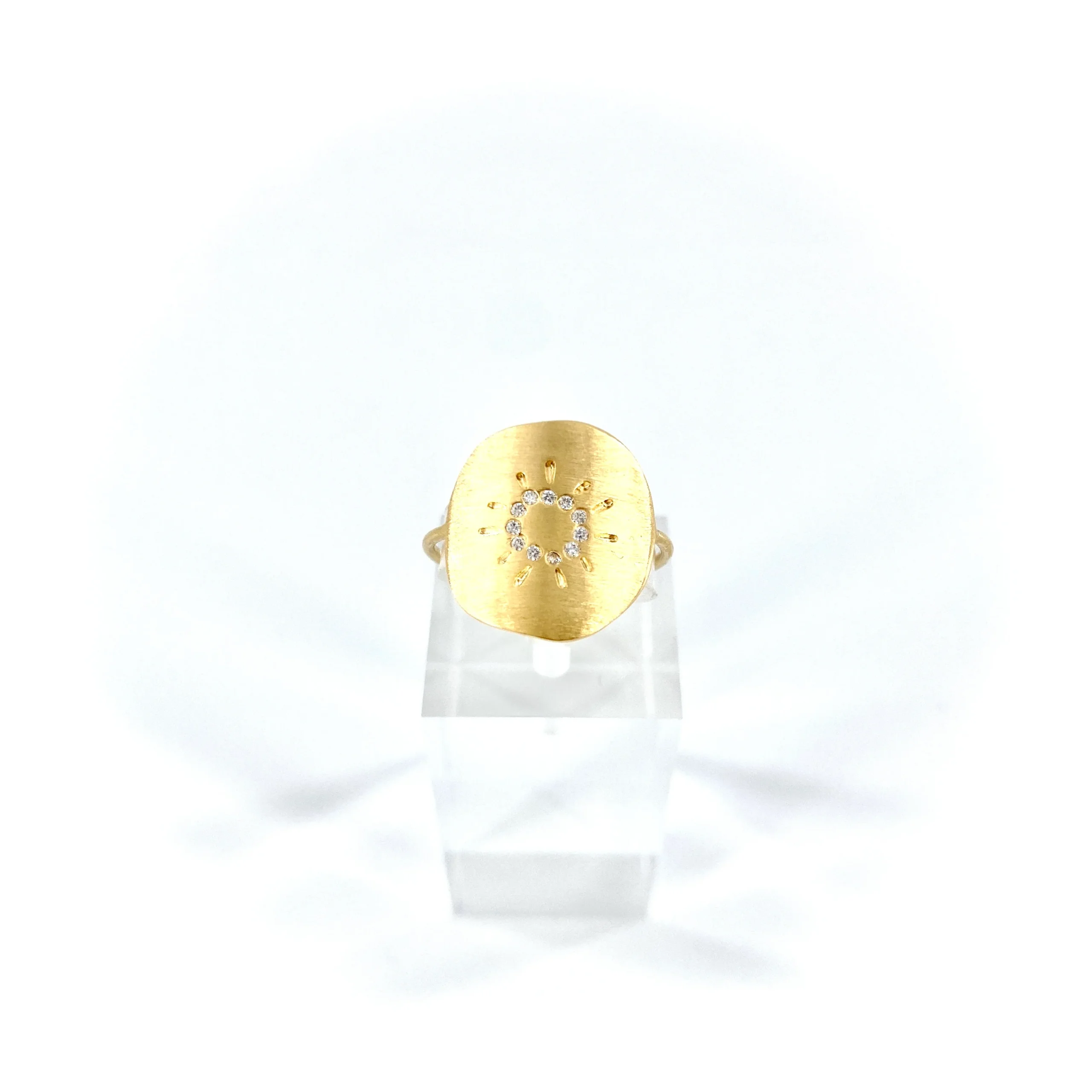 Cette bague se compose d’un anneau fin et délicat et d’une pastille, doré brossé, sertie de zircons blancs.