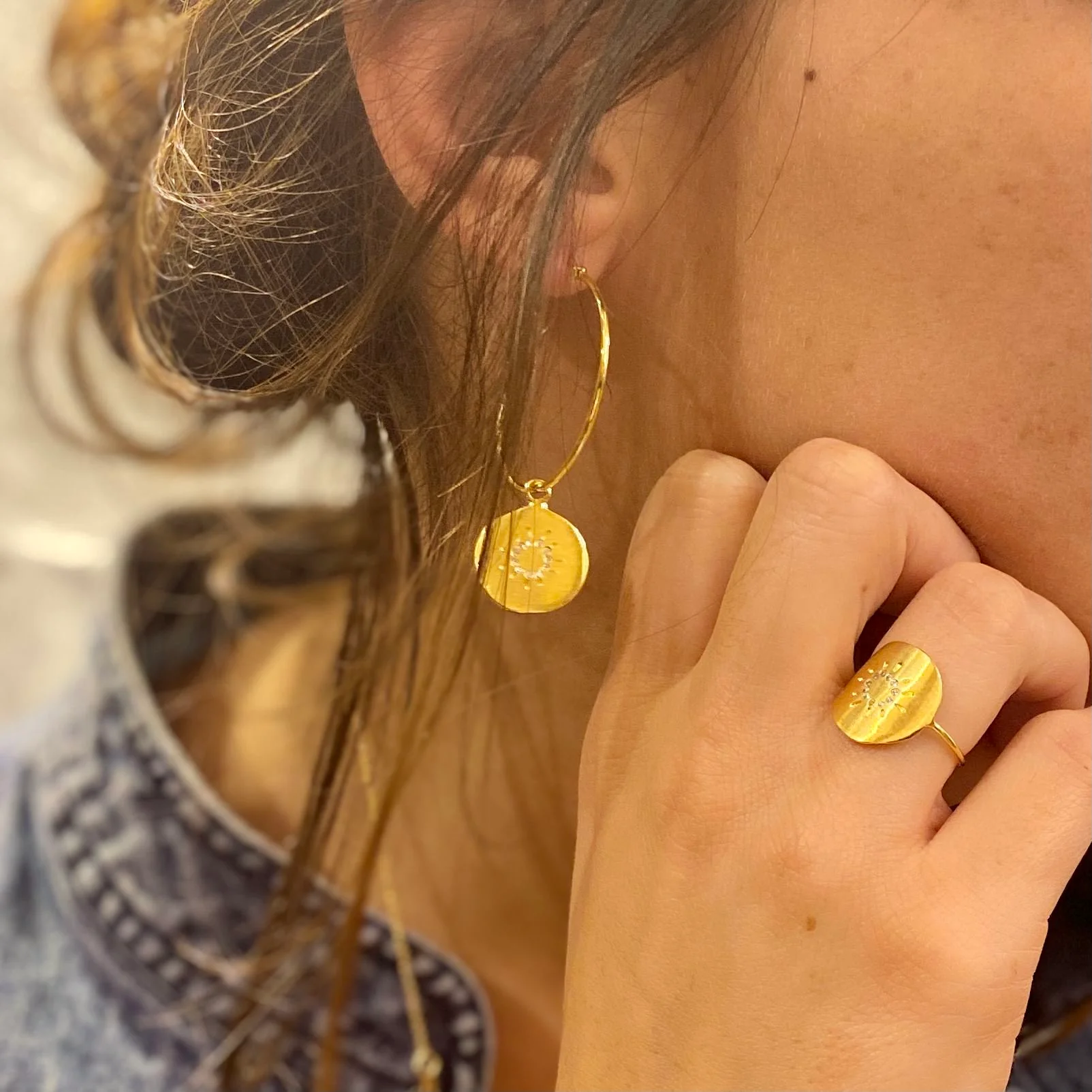 Cette bague se compose d’un anneau fin et délicat et d’une pastille, doré brossé, sertie de zircons blancs. Incurvée, la médaille se pose particulièrement bien sur les doigts. Diamètre Médaille : 1.5cm Plaqué Or 18 carats