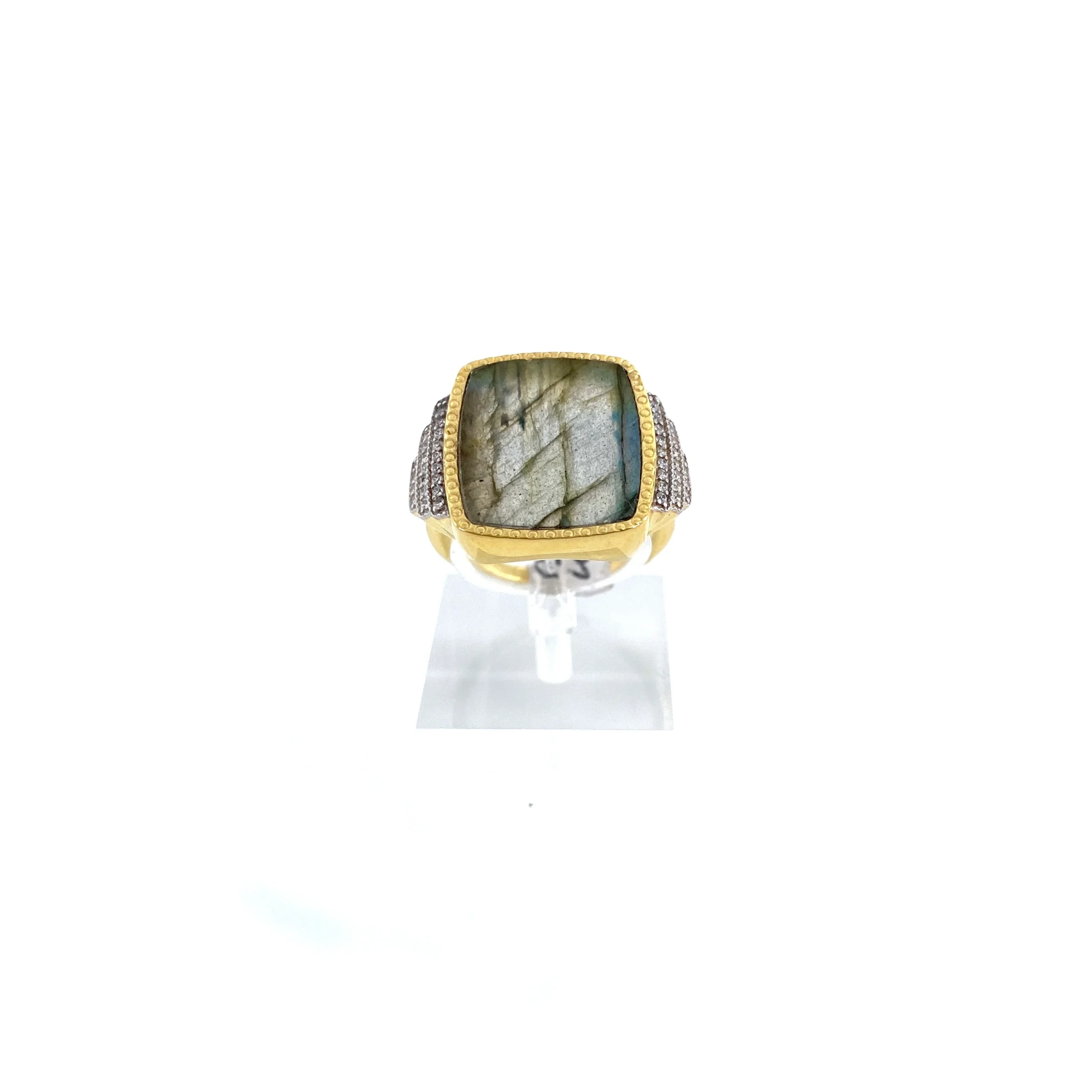 Cette bague, en plaqué Or, est ornée d’une Labradorite Carrée, agrémentée de zircons blancs.