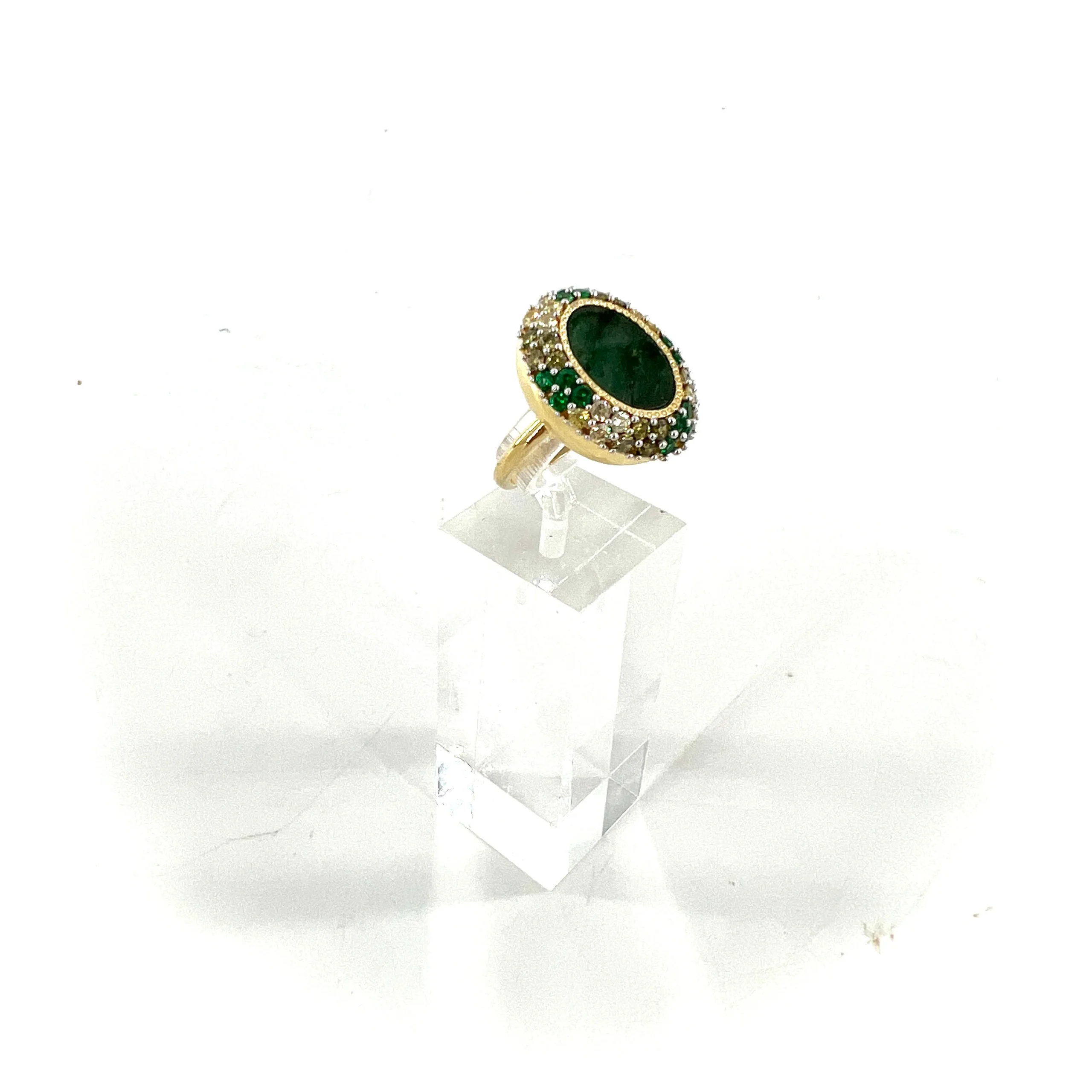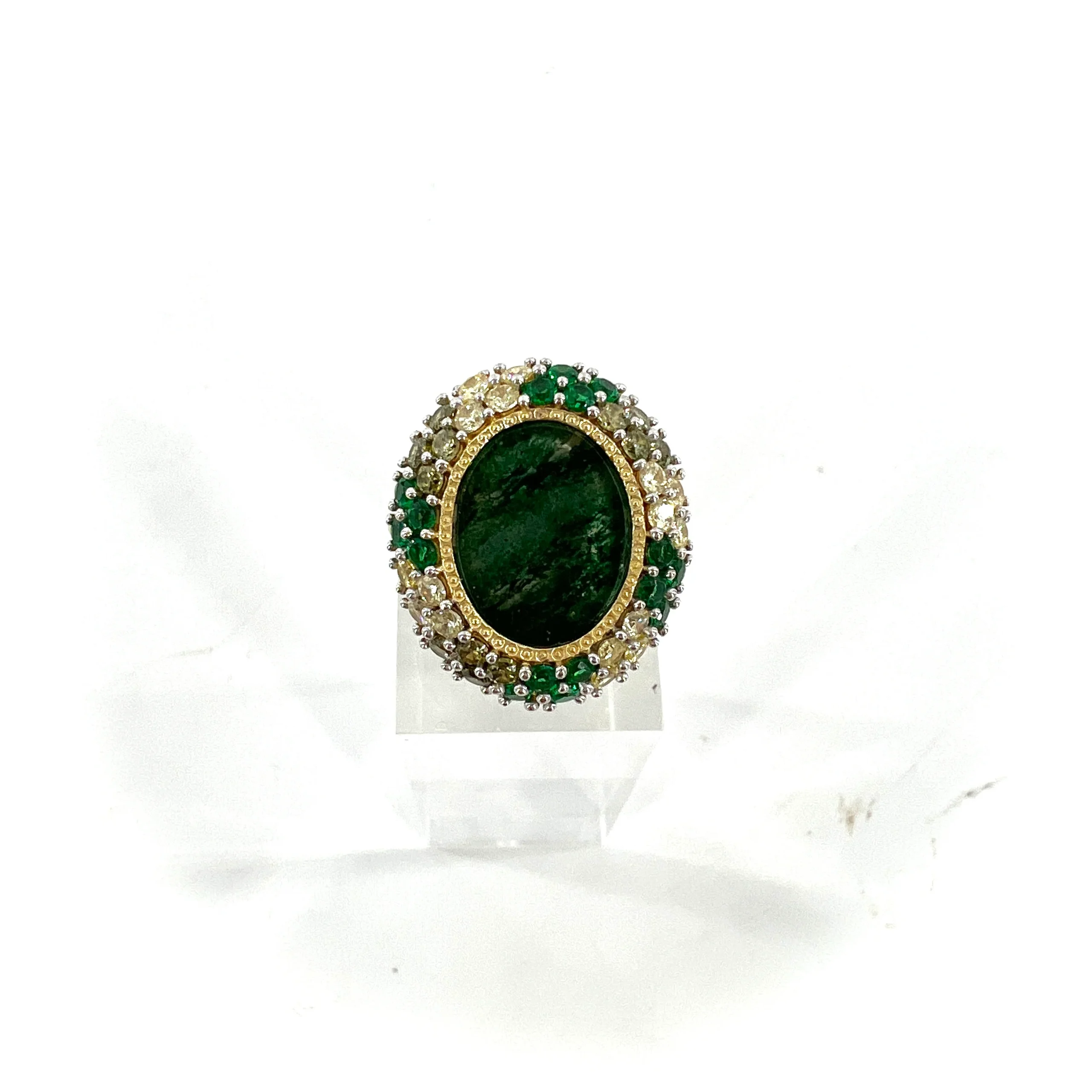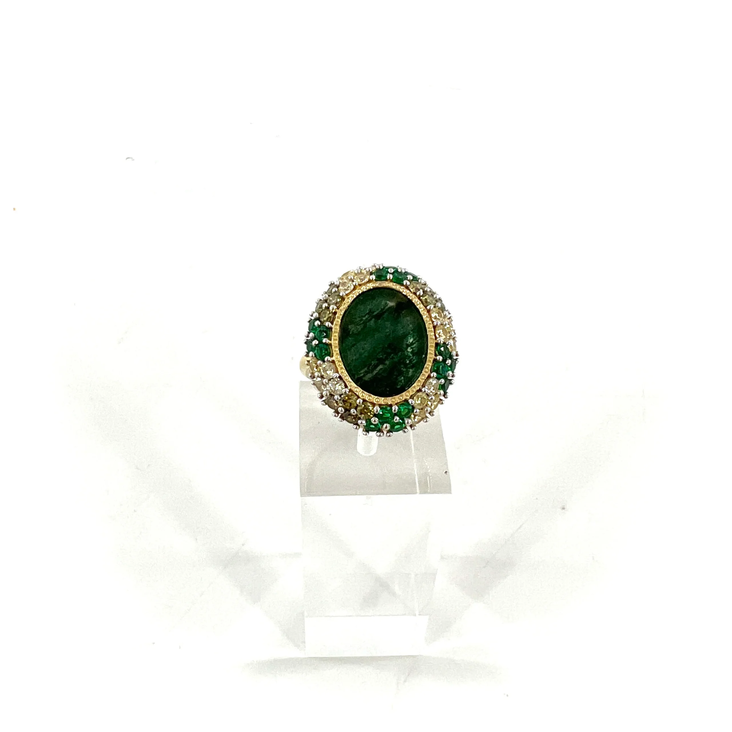 Cette bague, en Plaqué Or, se compose d’une Aventurine assortie de nombreux zircons colorés.