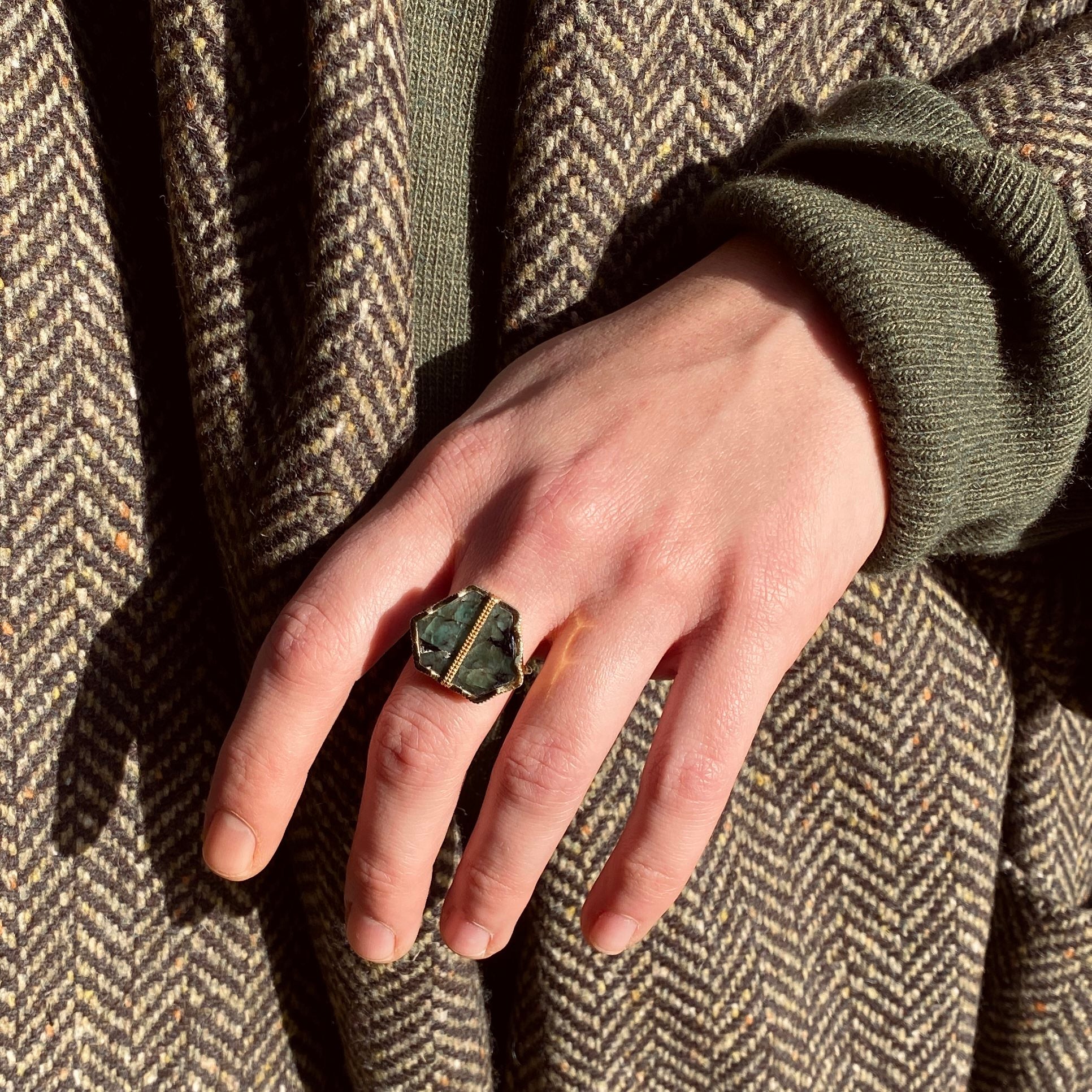 On aime le montage surprenant de cette bague, à la fois géométrique et irrégulier.