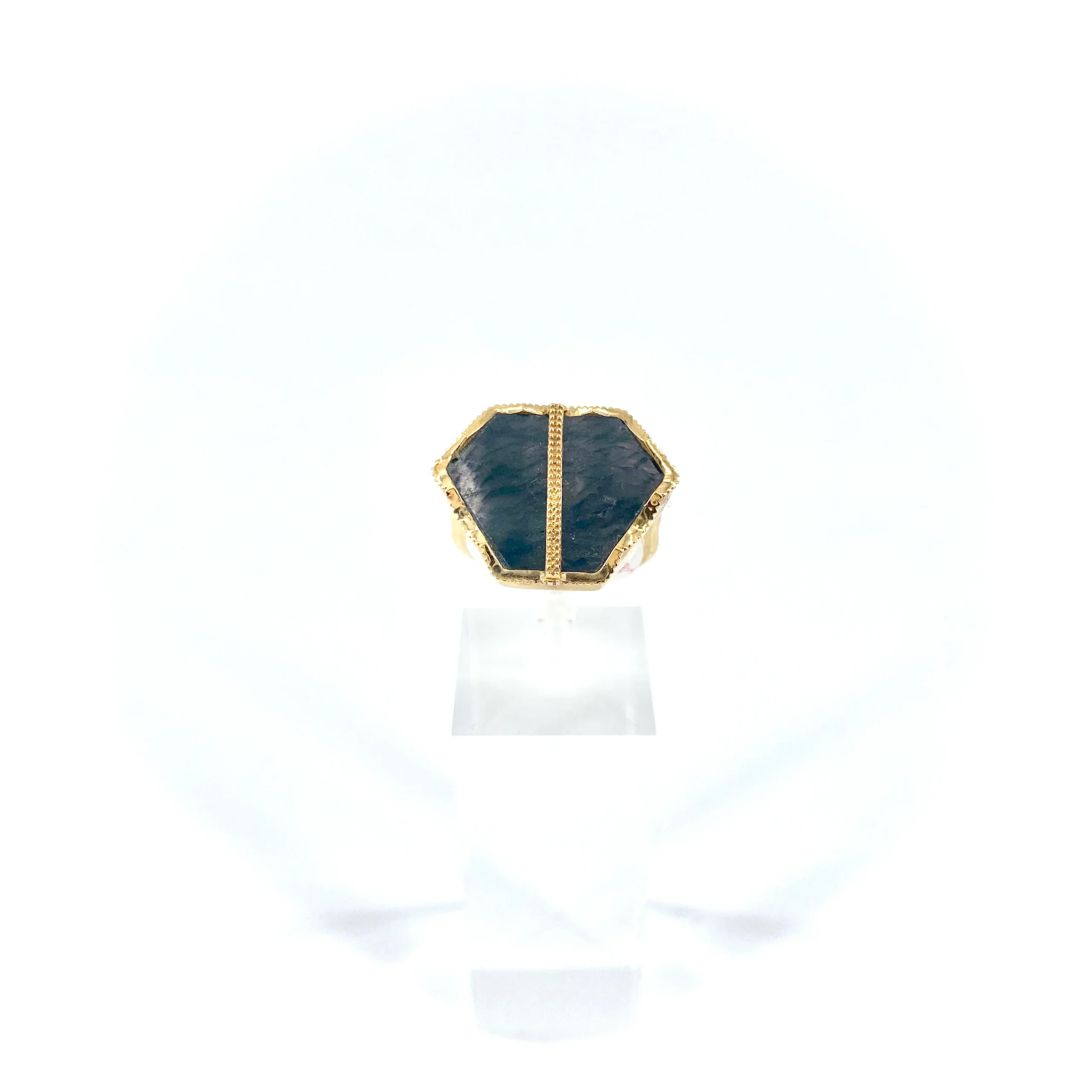 Cette bague, fabriquée artisanalement à la main, est sertie d’un Onyx Noir texturé véritable. On aime le montage surprenant de cette bague, à la fois géométrique et irrégulier. Existe aussi en Aventurine. Dorée à l’Or fin 18 carats. Chaque pierre est unique, sa couleur peut varier ce qui en fait sa rareté.