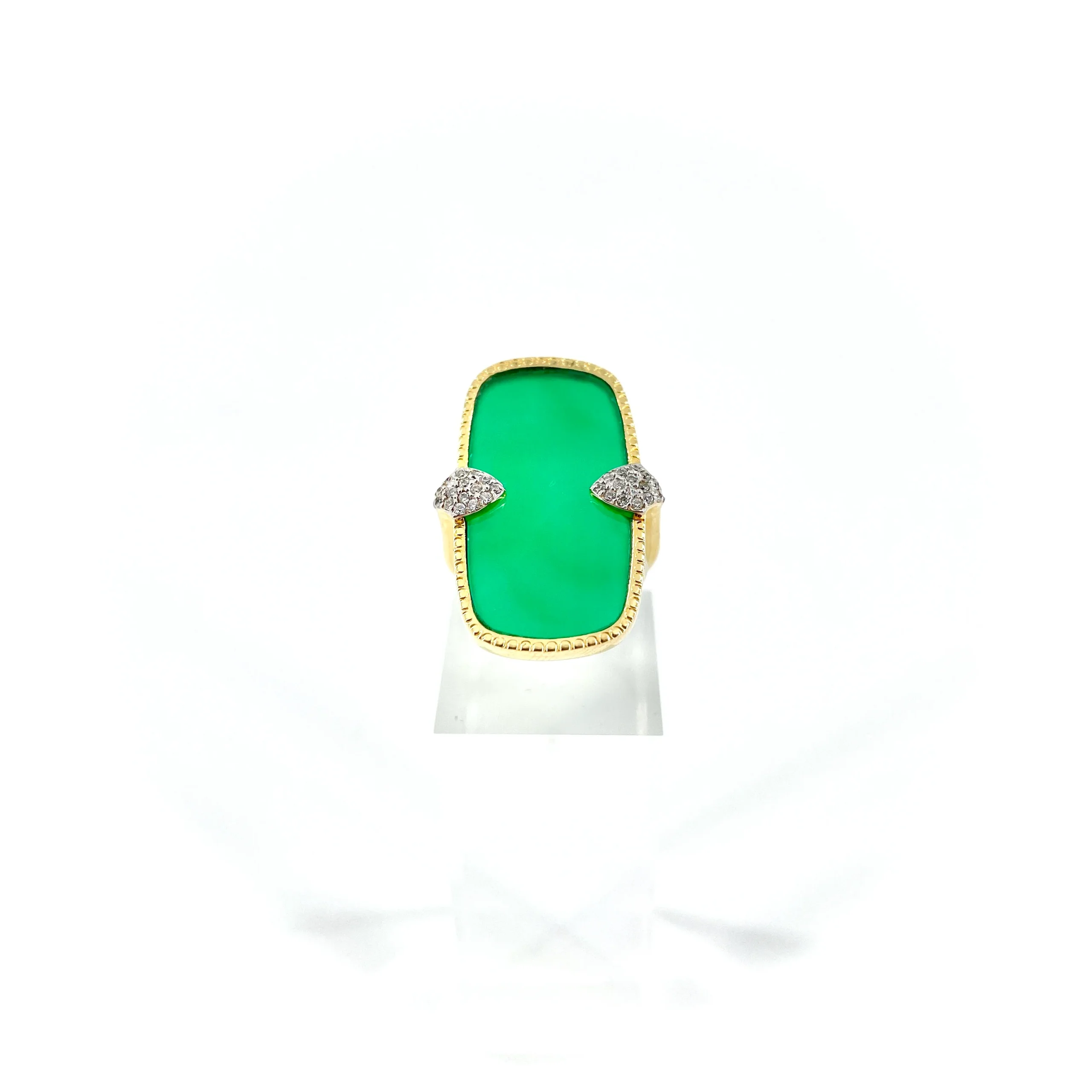 Cette bague rectangulaire, fabriquée artisanalement à la main, est sertie d’un Onyx Vert véritable et de zircons blancs.