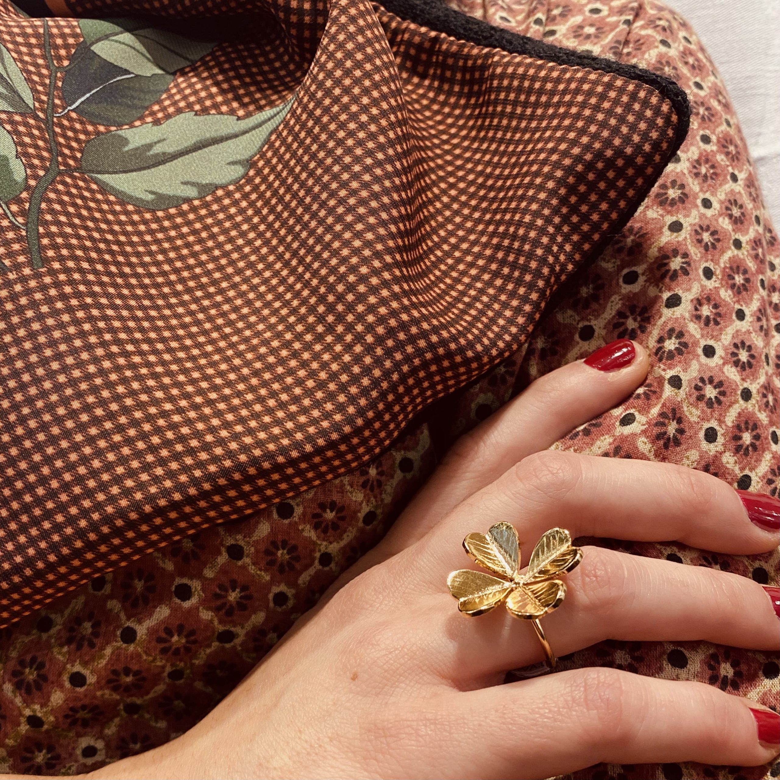Jolie bague « trèfle à quatre feuilles », porte-bonheur. Laiton doré à l’Or 24 carats. Fabriquée à la main, à Paris.