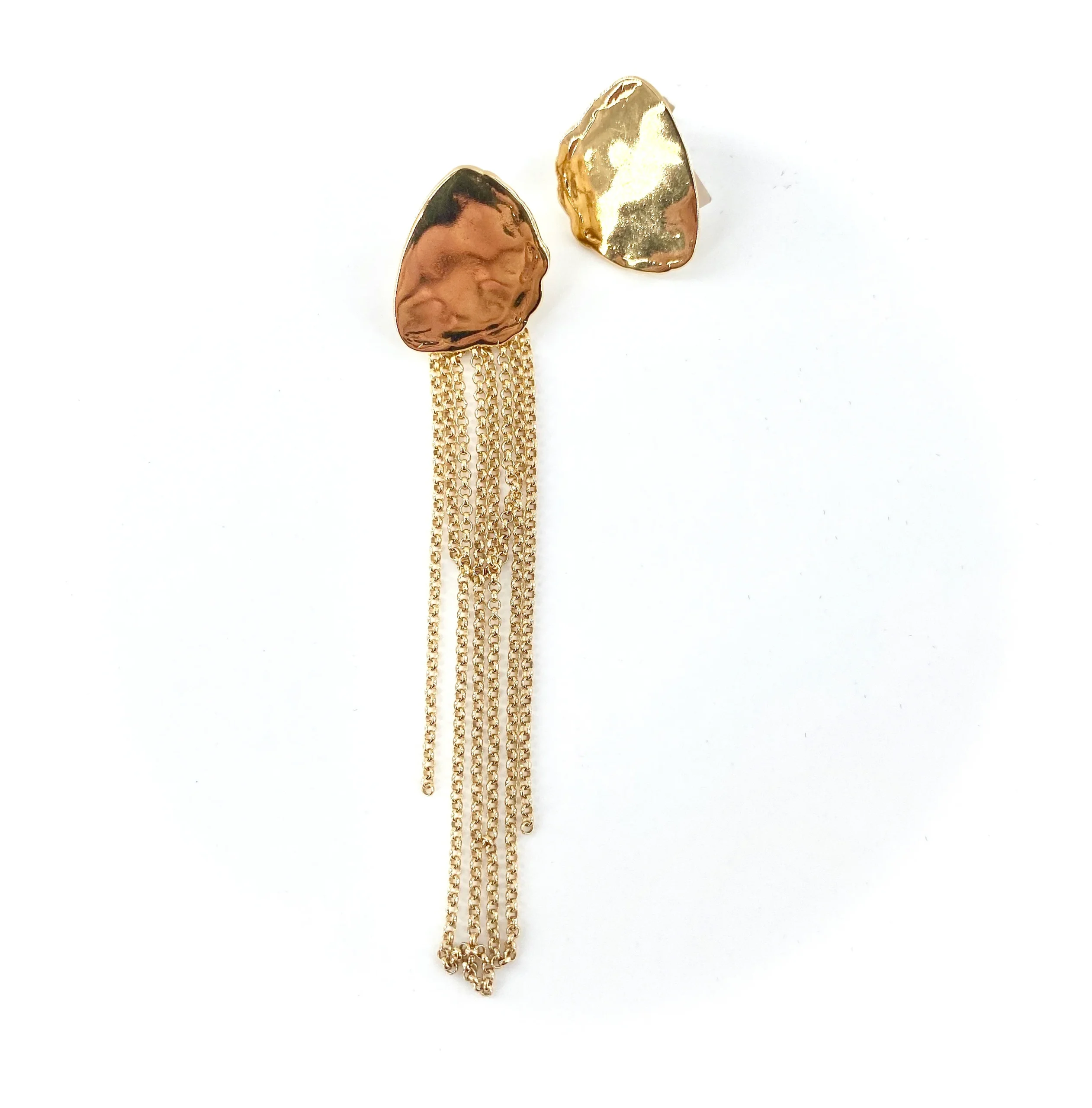 Spectaculaires et originales boucles d’oreilles asymétriques : d’un côté une médaille irrégulière dorée, de l’autre côté la même médaille agrémentée d’une cascade de longues chaînes « forçat ».