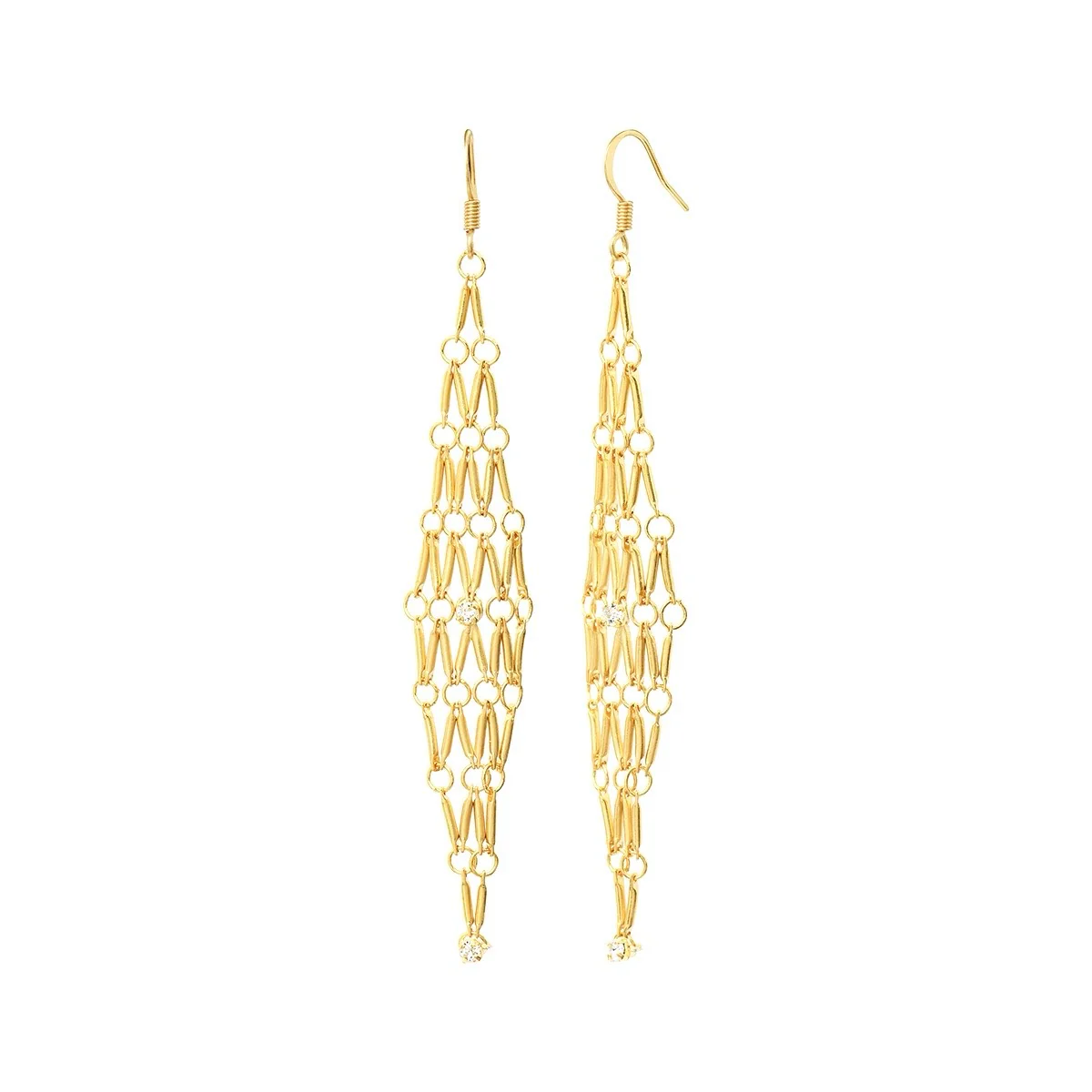 Ces boucles, dorĆ©es Ć l’or fin 24 carats se composent d’une maille tissĆ©e agrĆ©mentĆ©e d’un discret cristal blanc. Longueur Totale de la Boucle: 9.5cm.