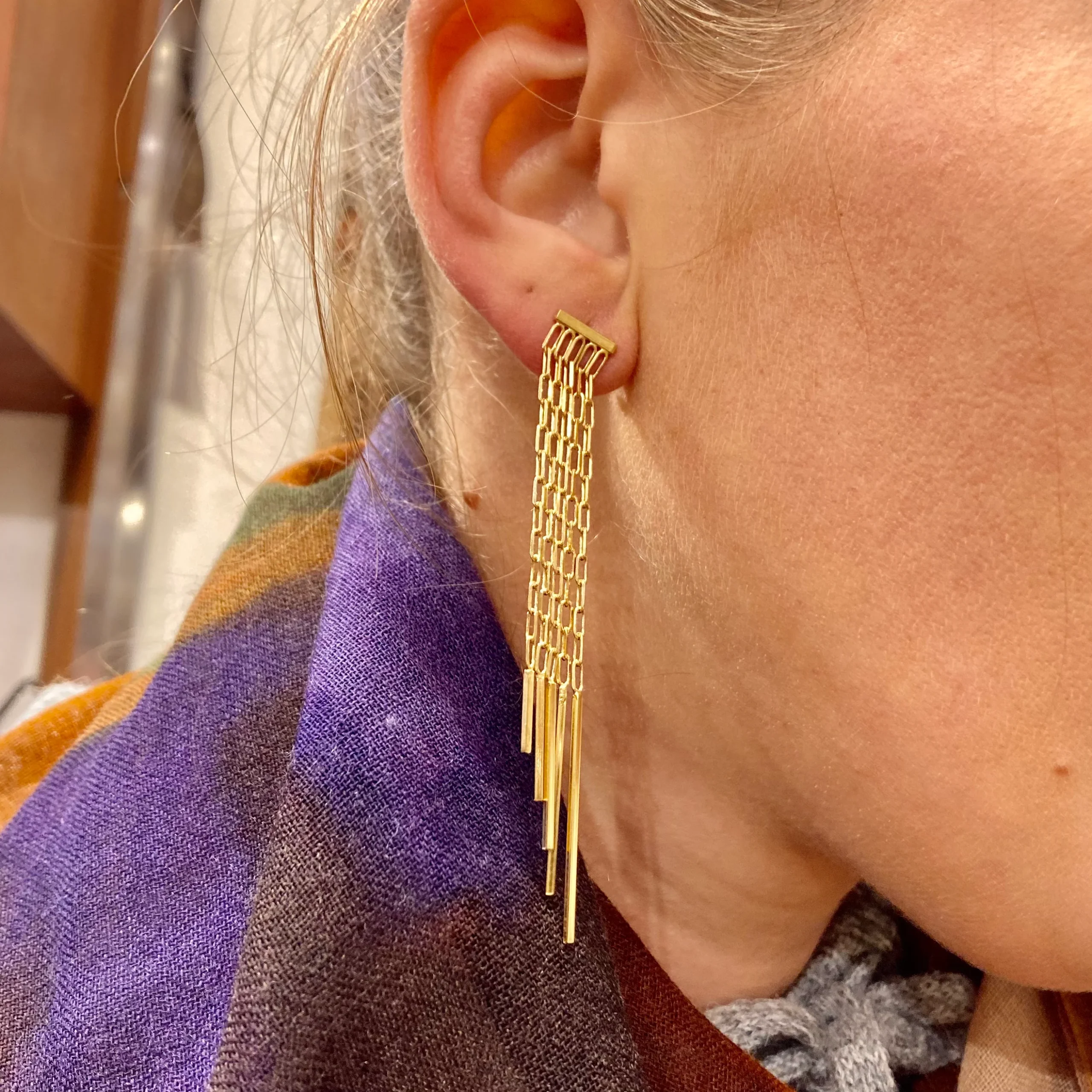 Ces boucles, tige oreille percée, se composent d’une barrette agrémentée de cinq chaînes.Fluide, lumineux, présent, indémodable, on adore. Longueur max: 8cm. Vermeil : Argent 925 plaqué Or 3 micronsFabriquées à la main à Paris.