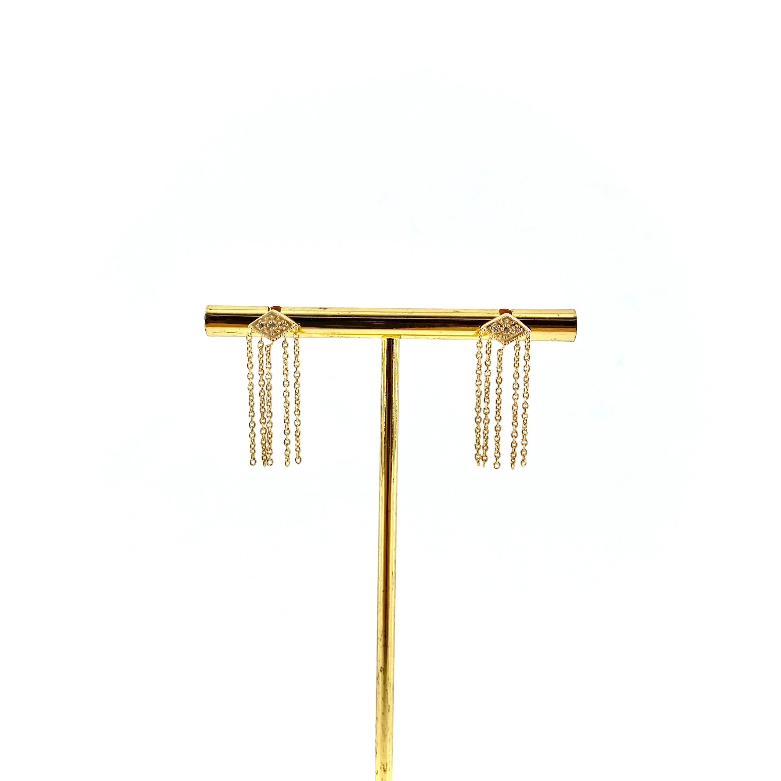 Ces boucles, tiges oreilles percées, se composent d’une puce martelée, ornée de 3 mini-zircons, assortie de 5 chaînes.