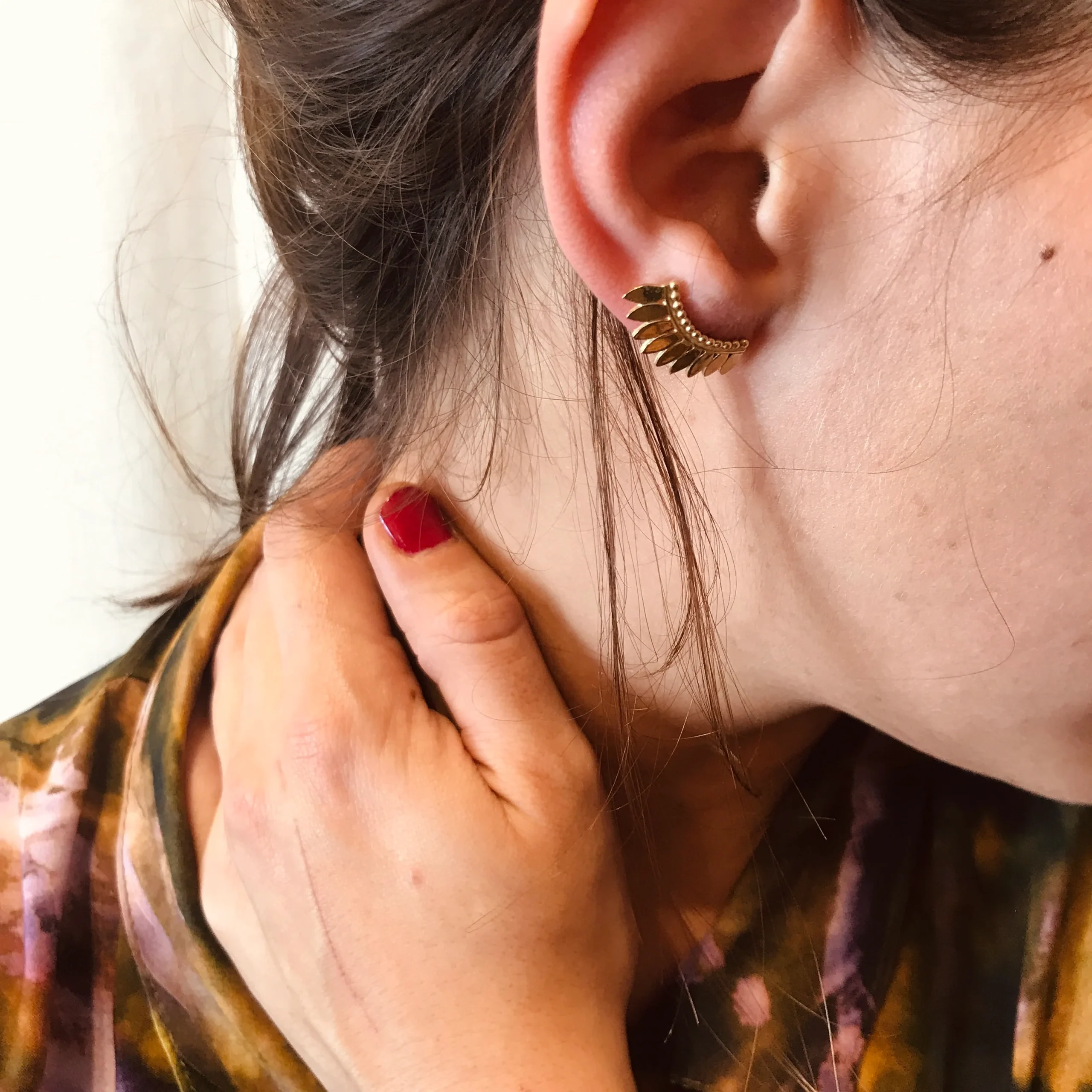 Ces boucles d’oreilles, earcuffs, composées de minis billes et pétales dorées lisses, se posent parfaitement sur l’oreille.