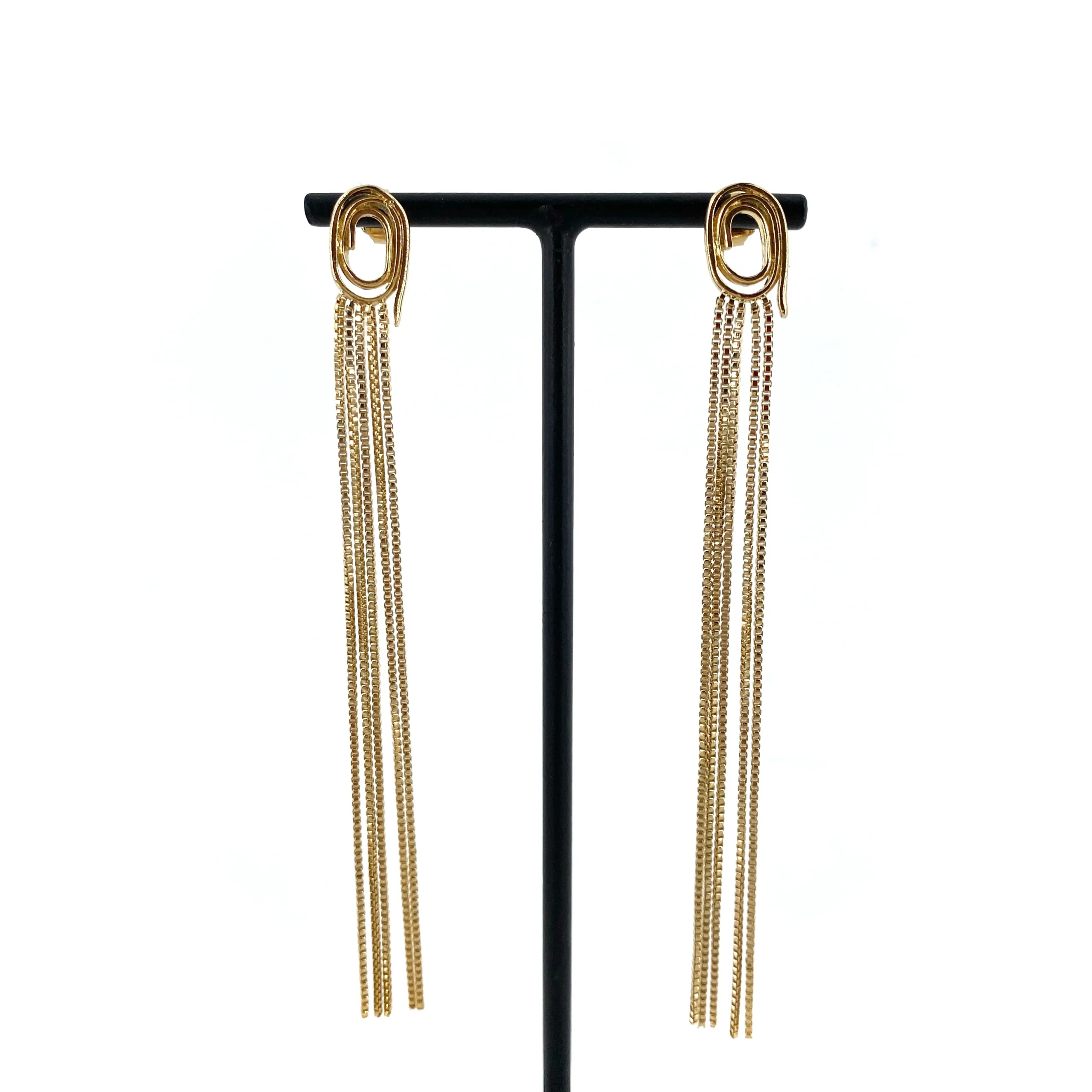 Ces boucles, tige oreille percĆ©e, se compose d’un tourbillon irrĆ©gulier agrĆ©mentĆ© de 5 longues chaines.