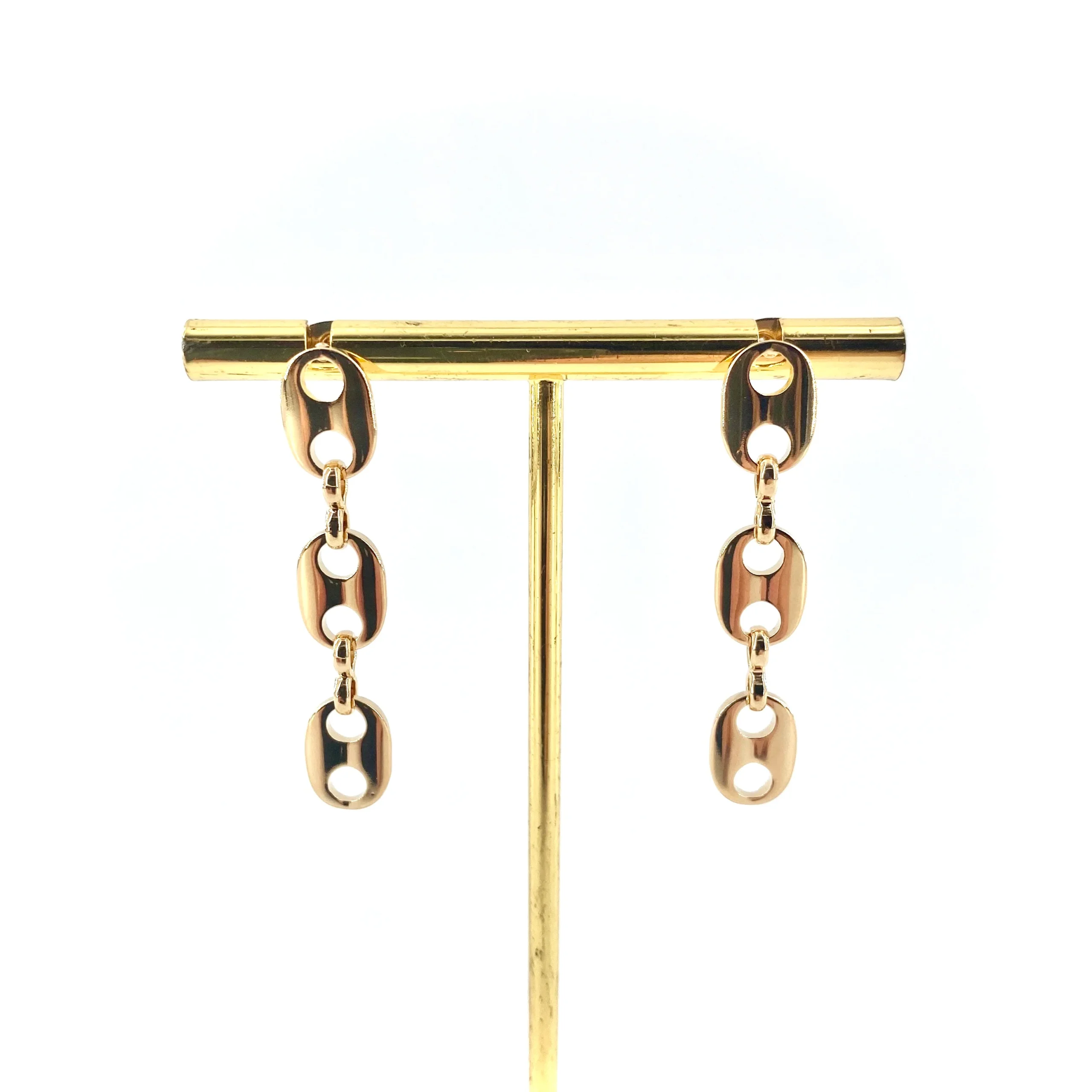 Ces boucles d’oreilles, pendantes, montées sur clous, reprennent l’intemporel et indémodable motif « grain de café ».
