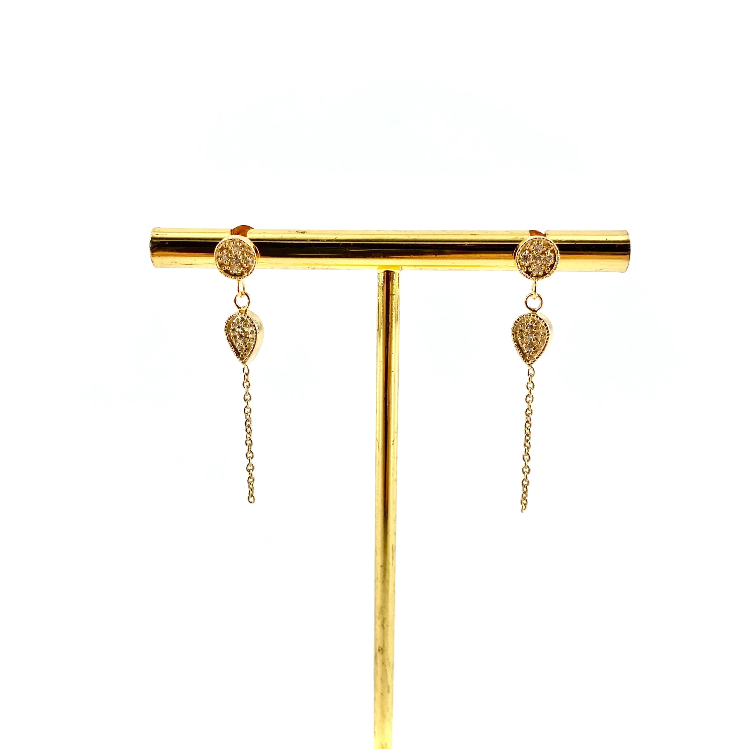 Ces boucles pendantes associent une puce ronde, une goutte, dorées martelées serties de zircons blancs, et une fine chaîne. Le résultat est subtil et aérien. Longueur Totale de la Boucle : 3cm Plaqué Or 18 carats