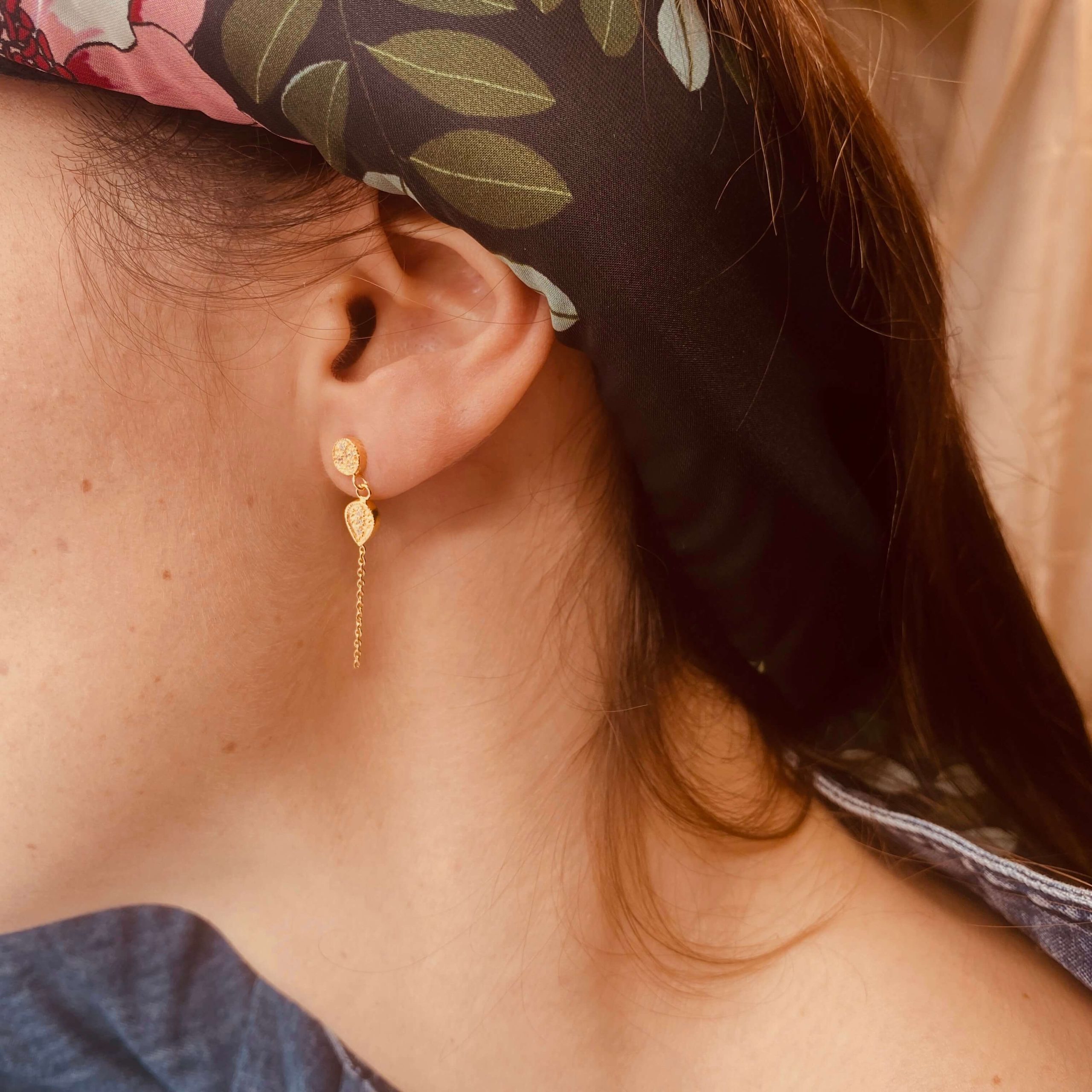 Ces boucles pendantes associent une puce ronde, une goutte, dorées martelées serties de zircons blancs, et une fine chaîne.