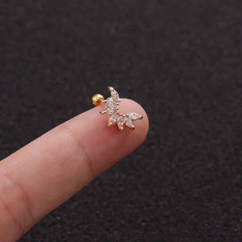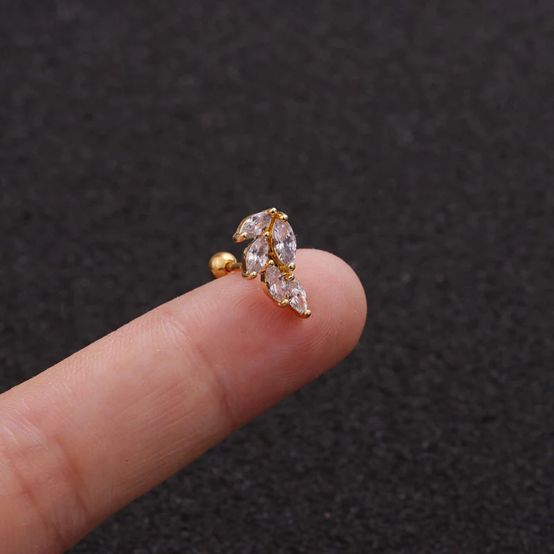 Boucles d’oreilles en acier inoxydable avec motifs feuilles et zircons incrustés. Disponibles en 18 variations de couleurs.