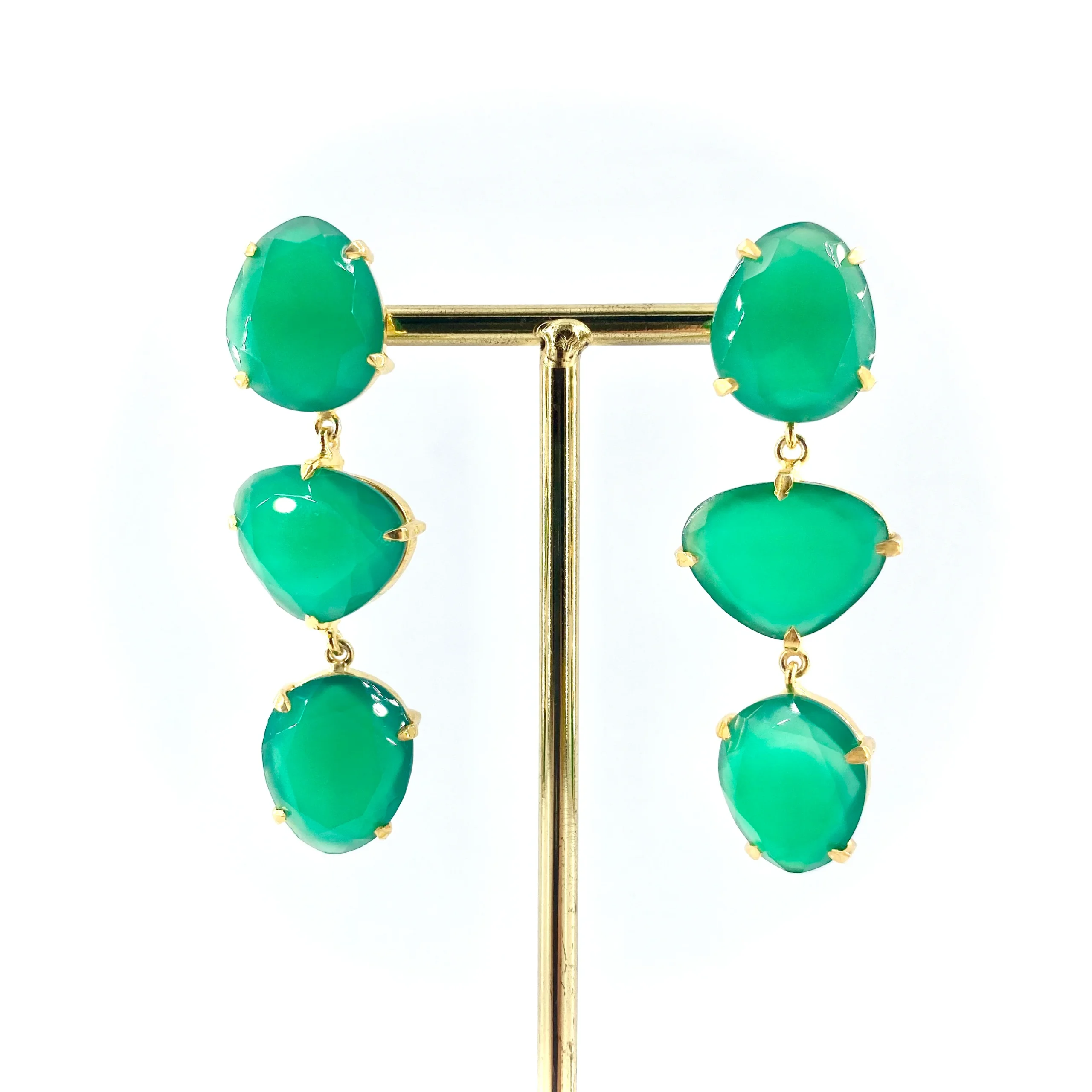 Ces longues boucles, en Plaqué Or, se composent de trois Onyx Verts facettés sertis.