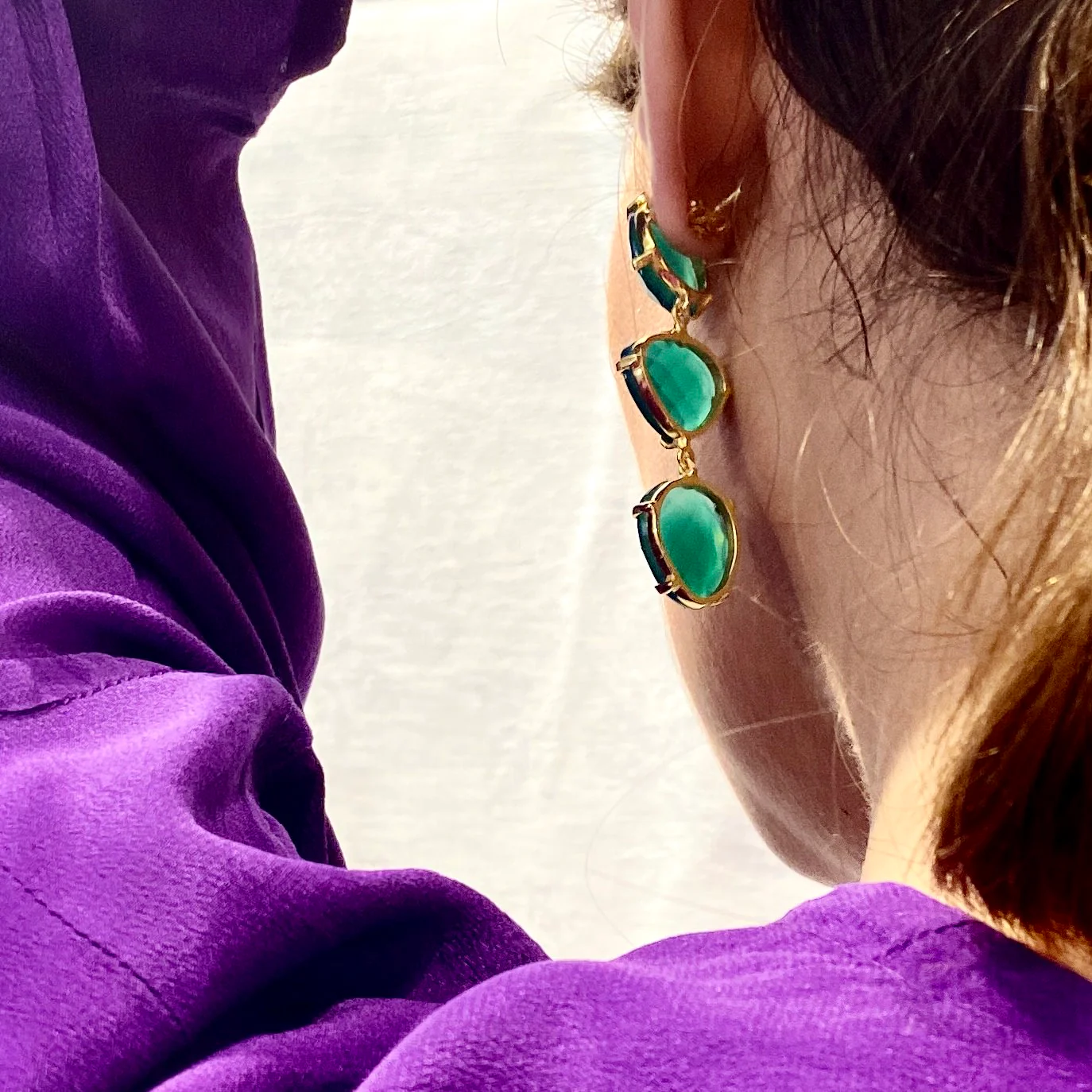 Ces longues boucles, en Plaqué Or, se composent de trois Onyx Verts facettés sertis.Ultra élégantes et présentes, à porter selon ses envies !Existe aussi en Onyx Noir Longueur Totale de la Boucle : 6cm Chaque pierre est unique, sa couleur peut varier ce qui en fait sa rareté.