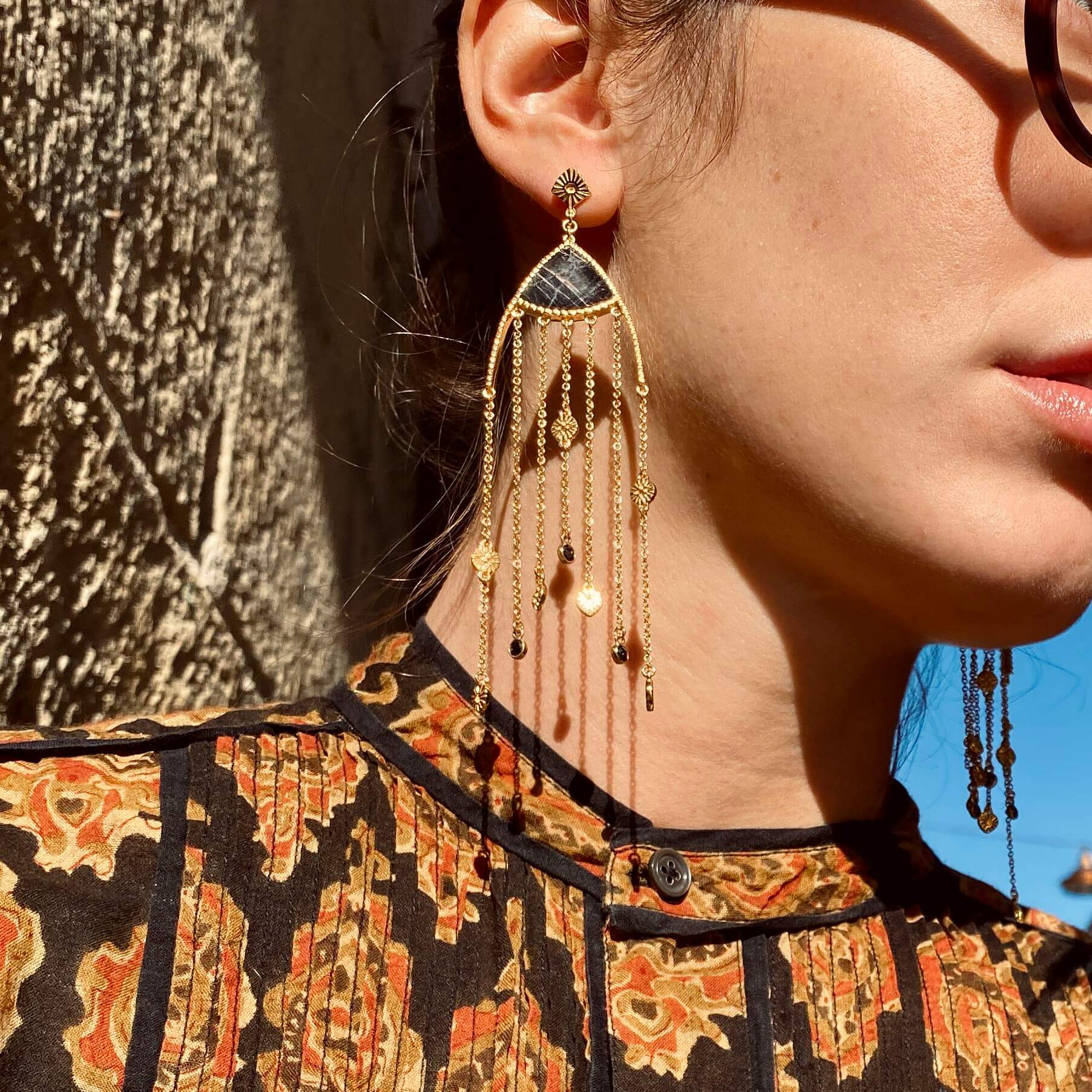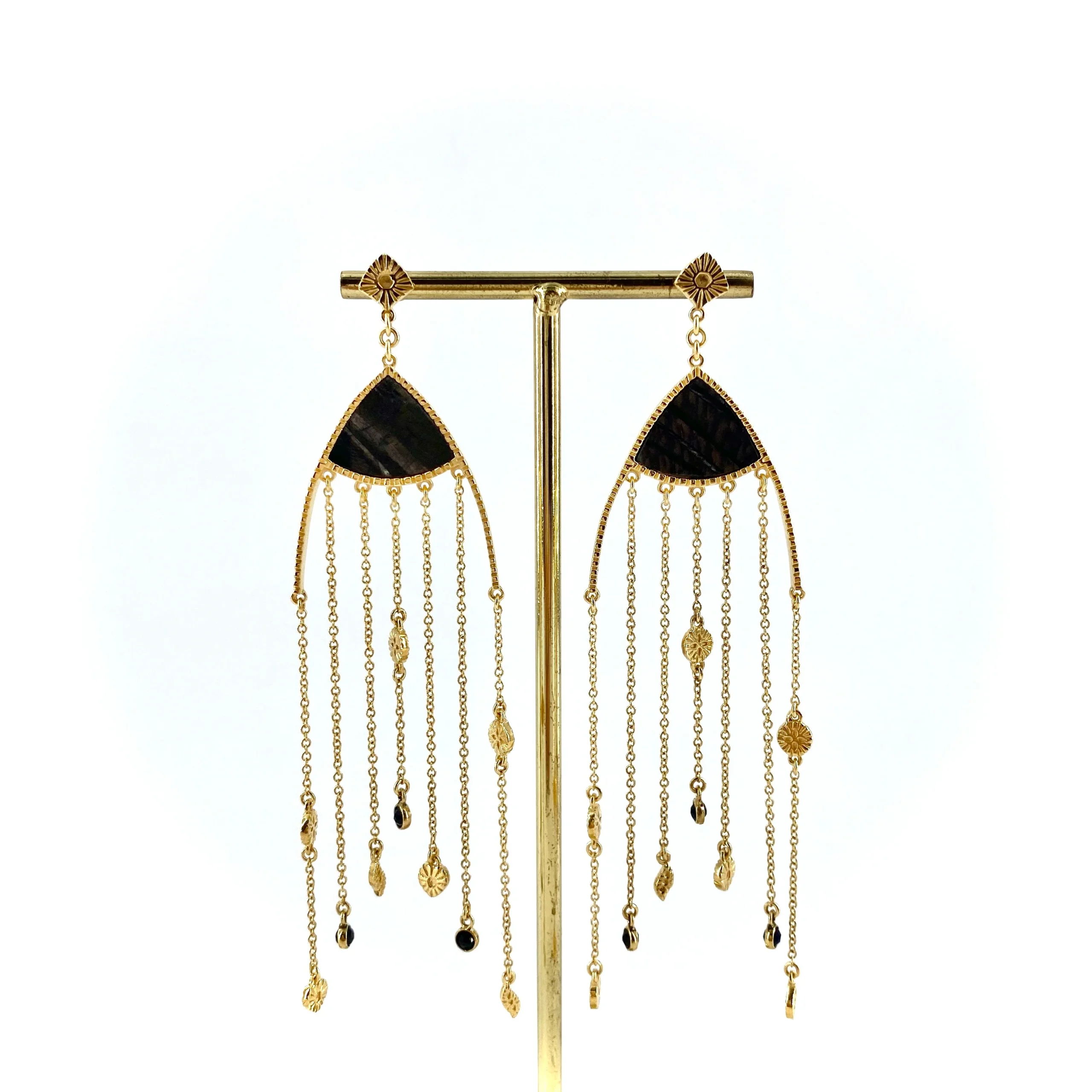 Ces boucles d’oreilles spectaculaires, fabriquées artisanalement à la main, sont serties d’un Onyx Noir texturé en forme de triangle (2cm x 1.5cm) agrémenté d’une cascade de chaines finition pampille dorée ou onyx.