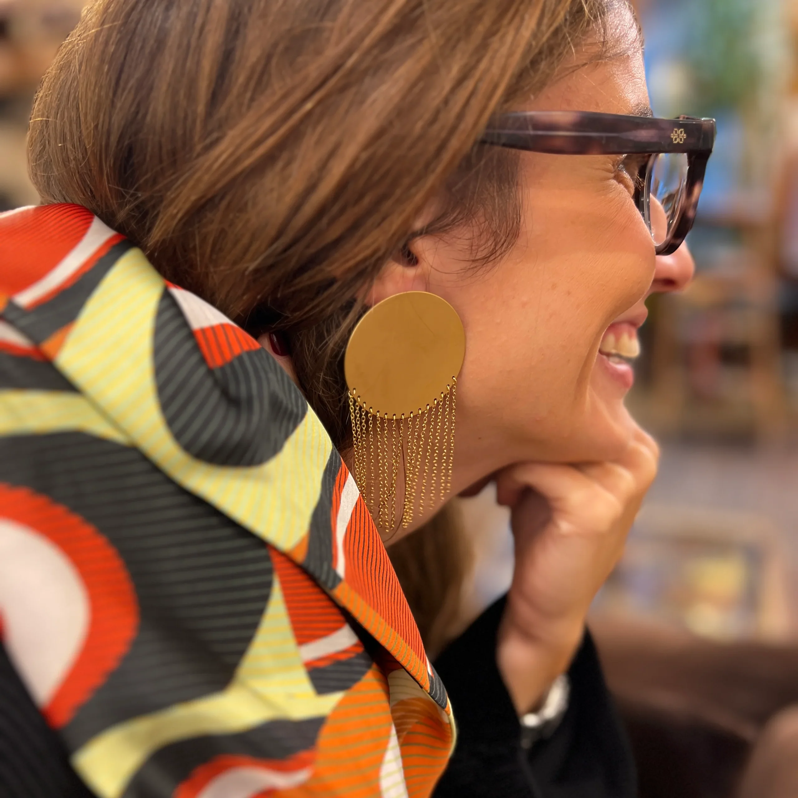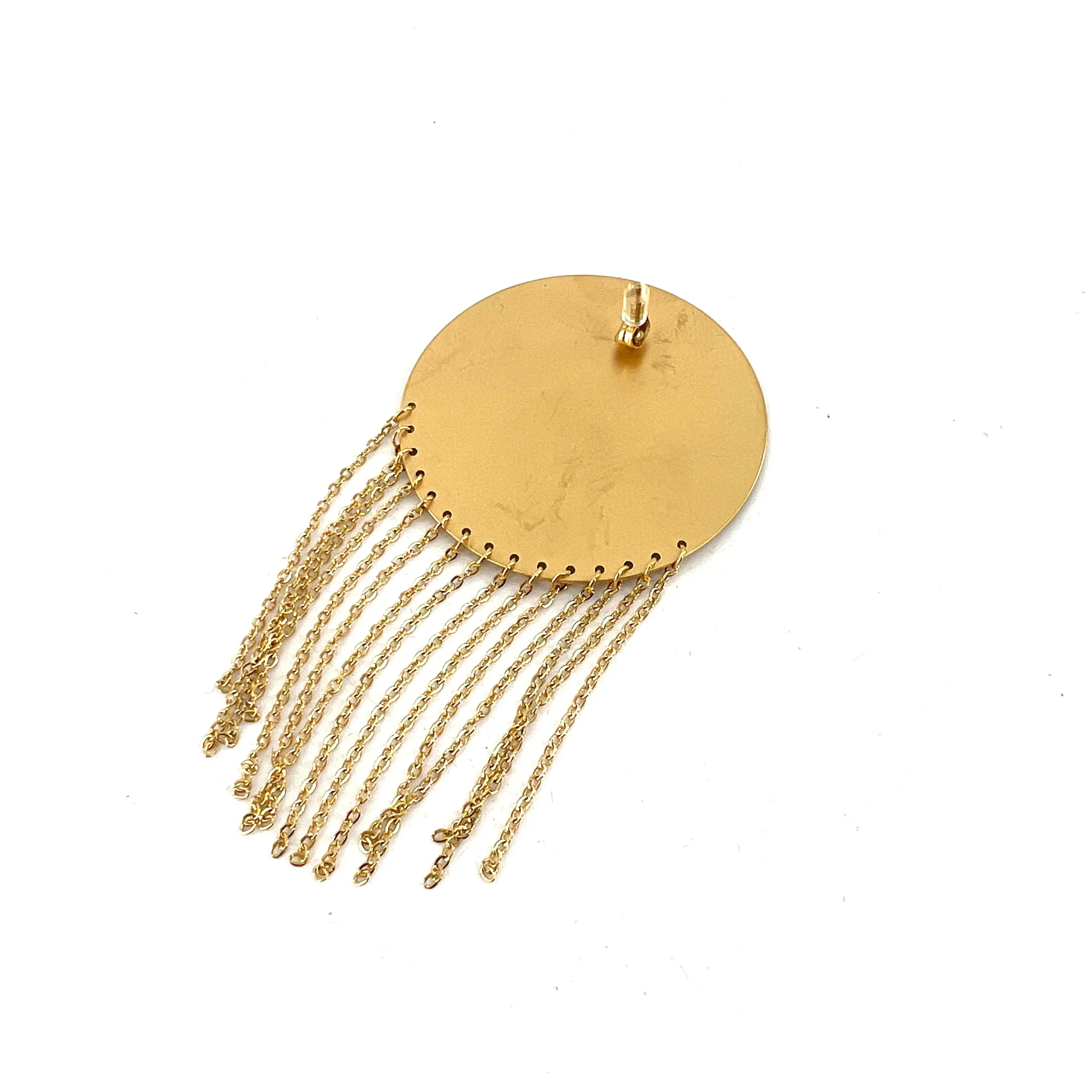 Ces boucles, dorées à l’Or fin 24 carats, sont aussi spectaculaires qu’élégantes. On aime l’association de la moderne et design plaque ronde mate, à la fluidité des 15 brins de chaines. Longueur totale de la boucle : 8 cm Diamètre Plaque : 4,5 cm Fabriqué à la main à Paris.