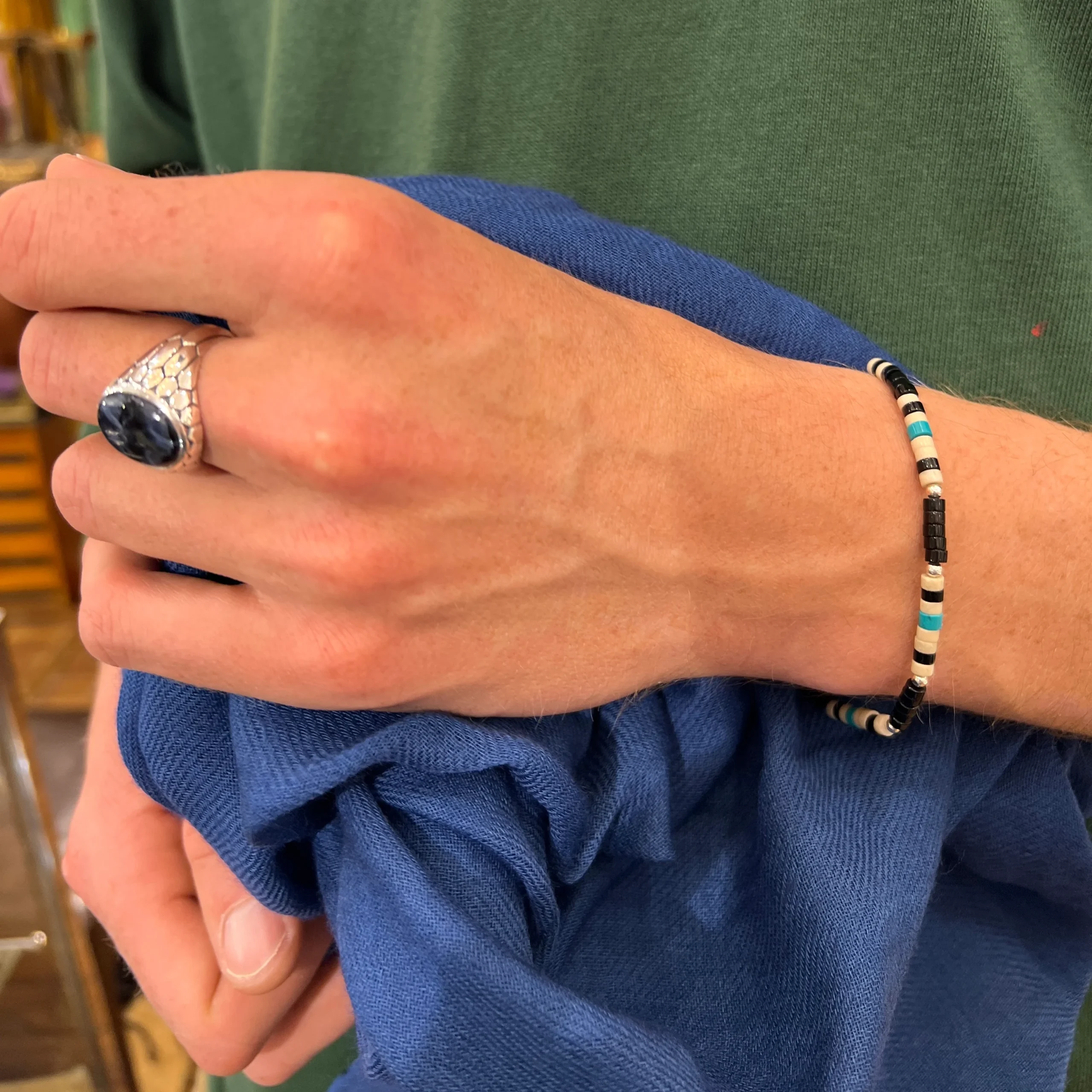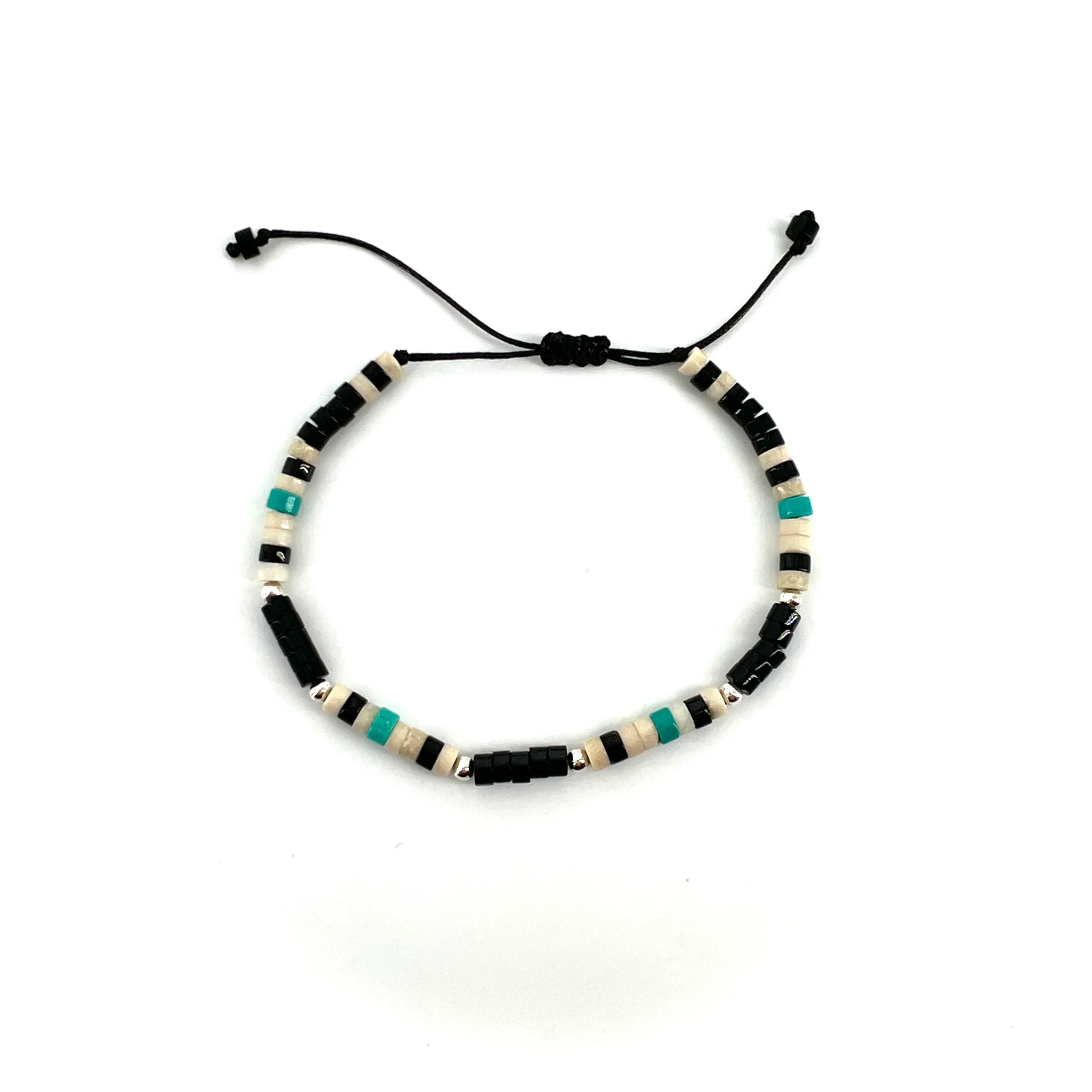 Bracelet, fil ciré coton, agrémenté de pierres naturelles (onyx, howlite, et coquillage), finitions Argent 925.