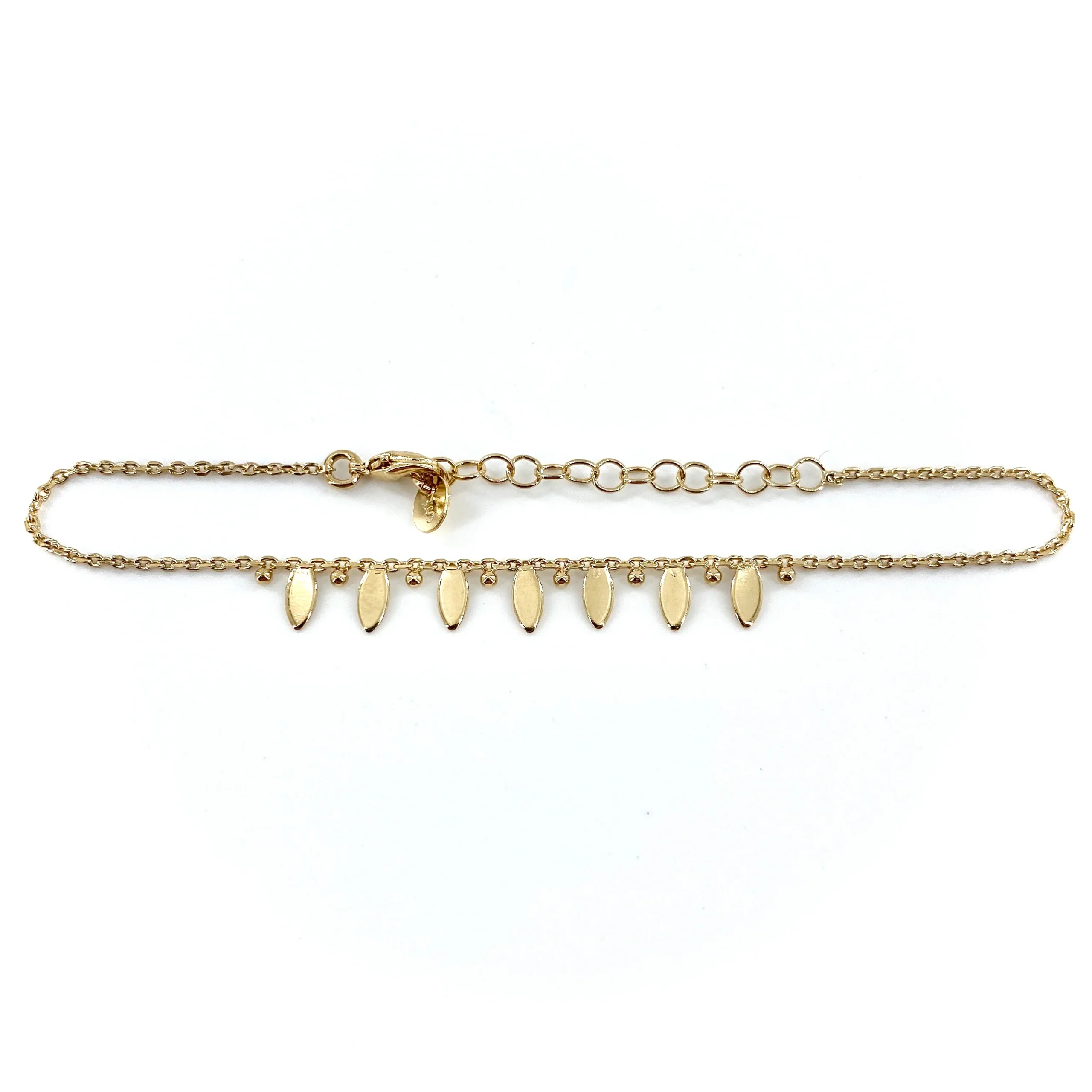 Ce bracelet, en maille fine ,est agrémenté de billes et minis « feuilles » lisses dorées. Subtil et lumineux grâce à ses motifs qui captent la lumière, il se porte seul ou en accumulation. Plaqué Or 3 microns Fabriqué à la main à Paris.