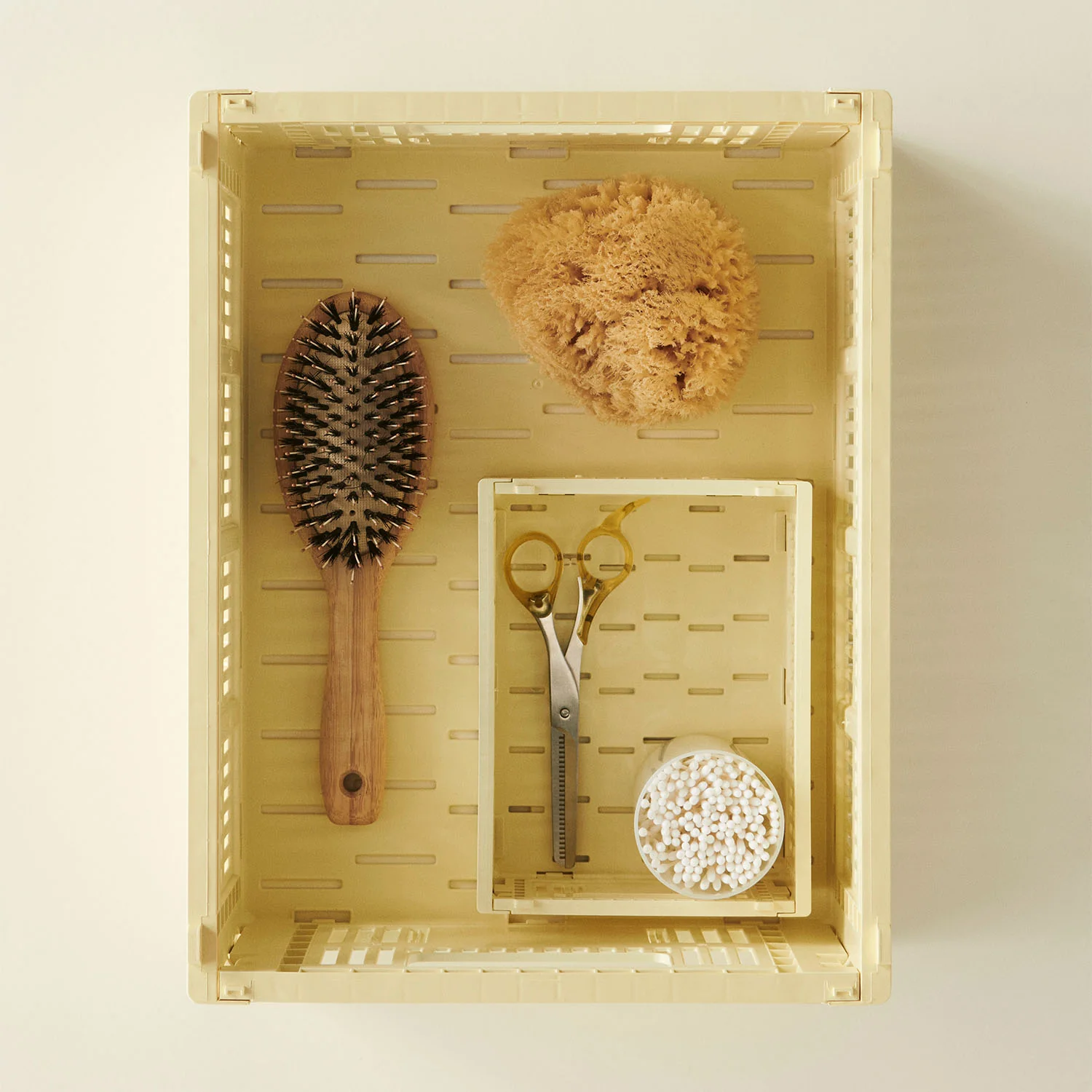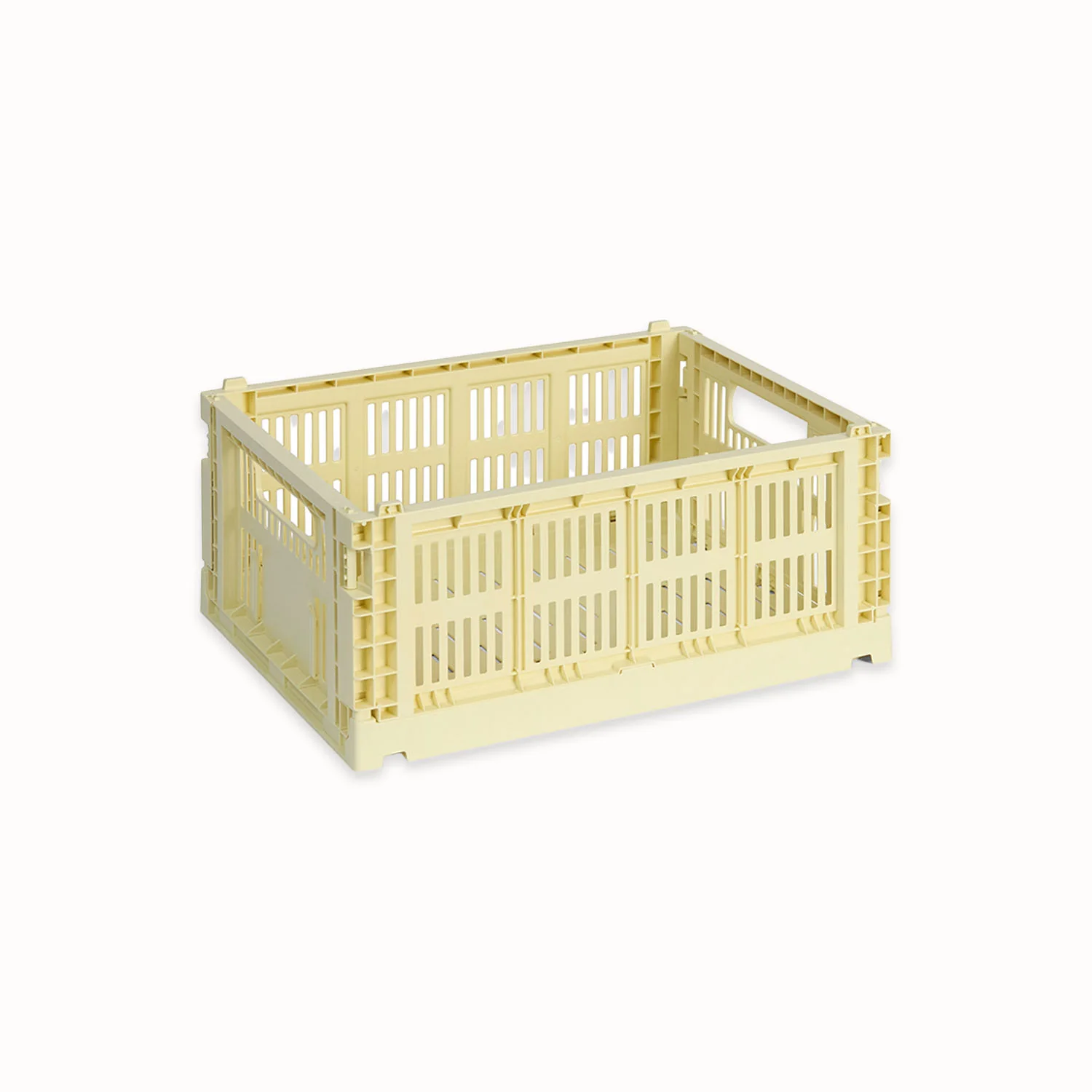 La cagette HAY se pare de nouvelles couleurs ! Fabriquée en plastique 100 % recyclé, elle est robuste, empilable et se replie à plat pour gagner de la place. Disponible en plusieurs tailles et couleurs, elle s’adapte à tous les usages : jouets dans la chambre, fruits et légumes dans la cuisine, accessoires de bureau ou linge dans la salle de bain. Un accessoire malin, polyvalent et esthétique, qui transforme le rangement en vraie touche déco.