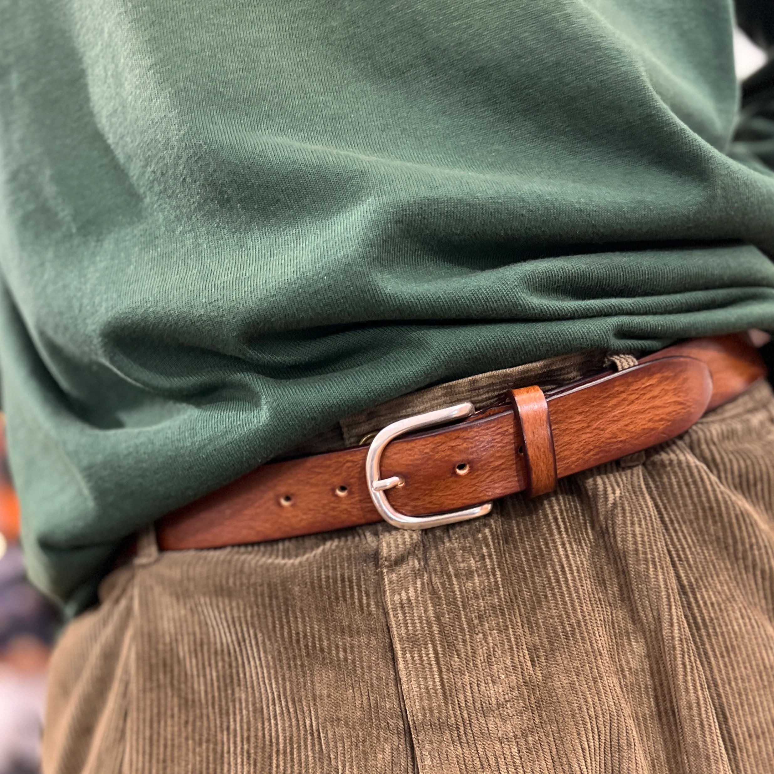 Cette ceinture, en Cuir Cognac veiné, bord franc est à la fois chic et racée.