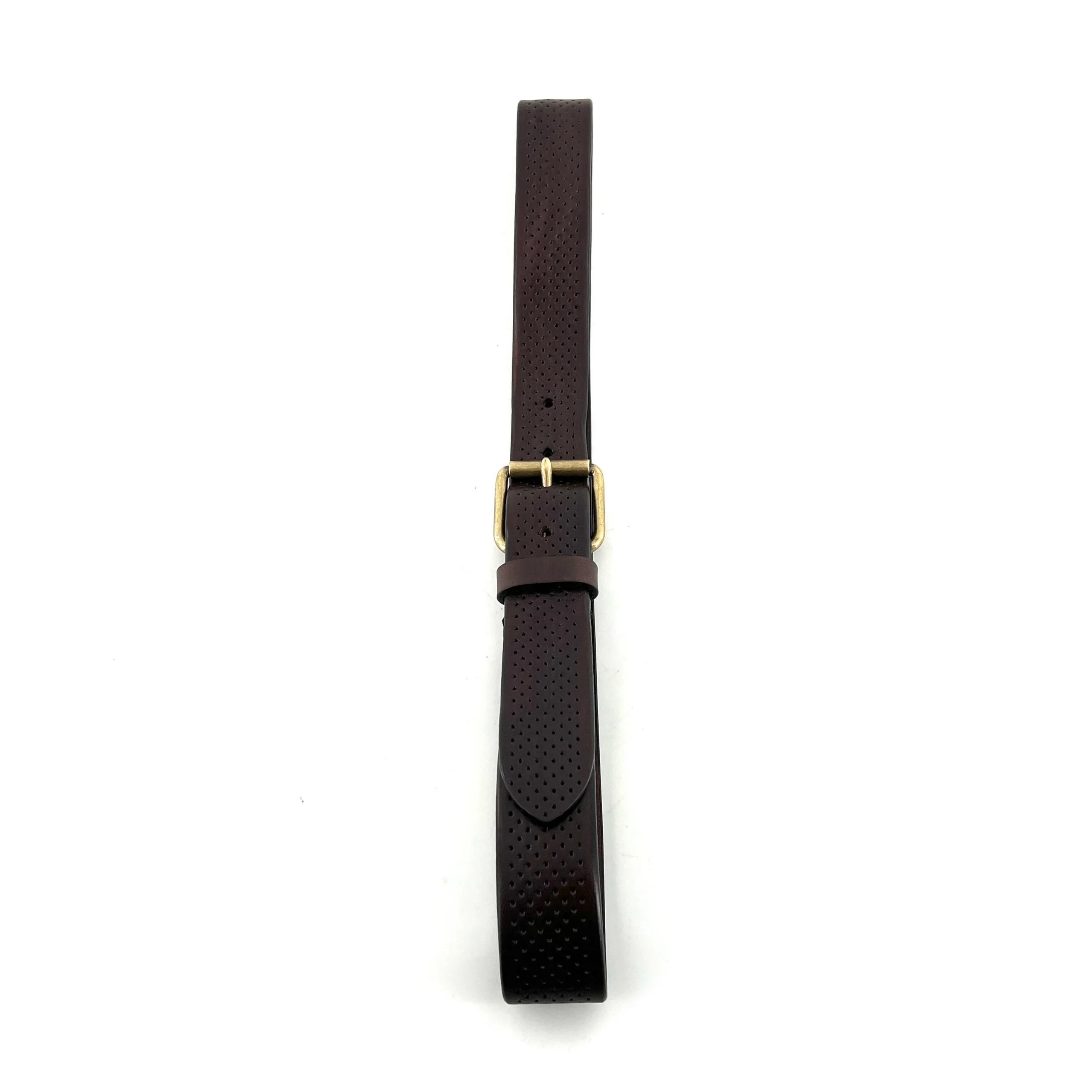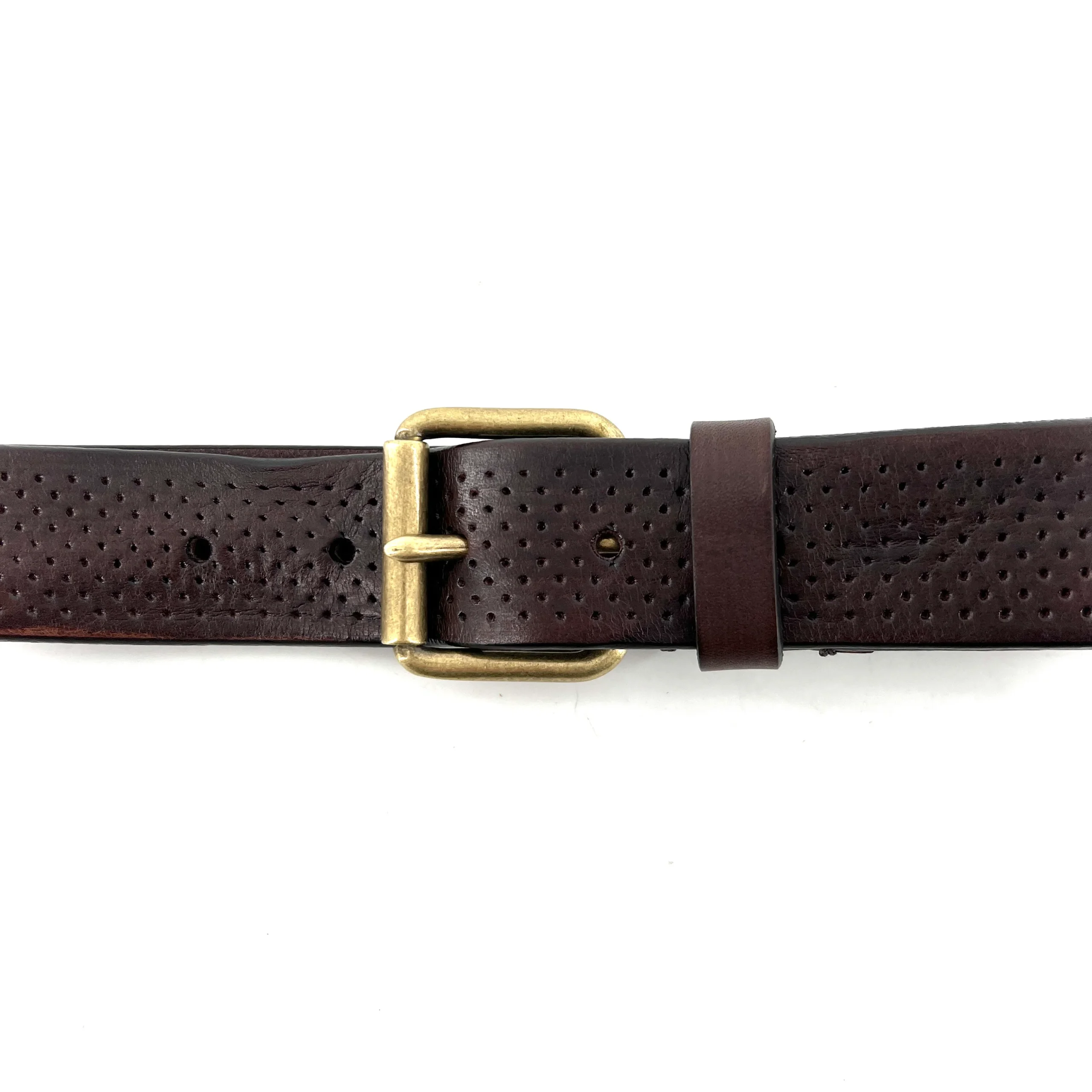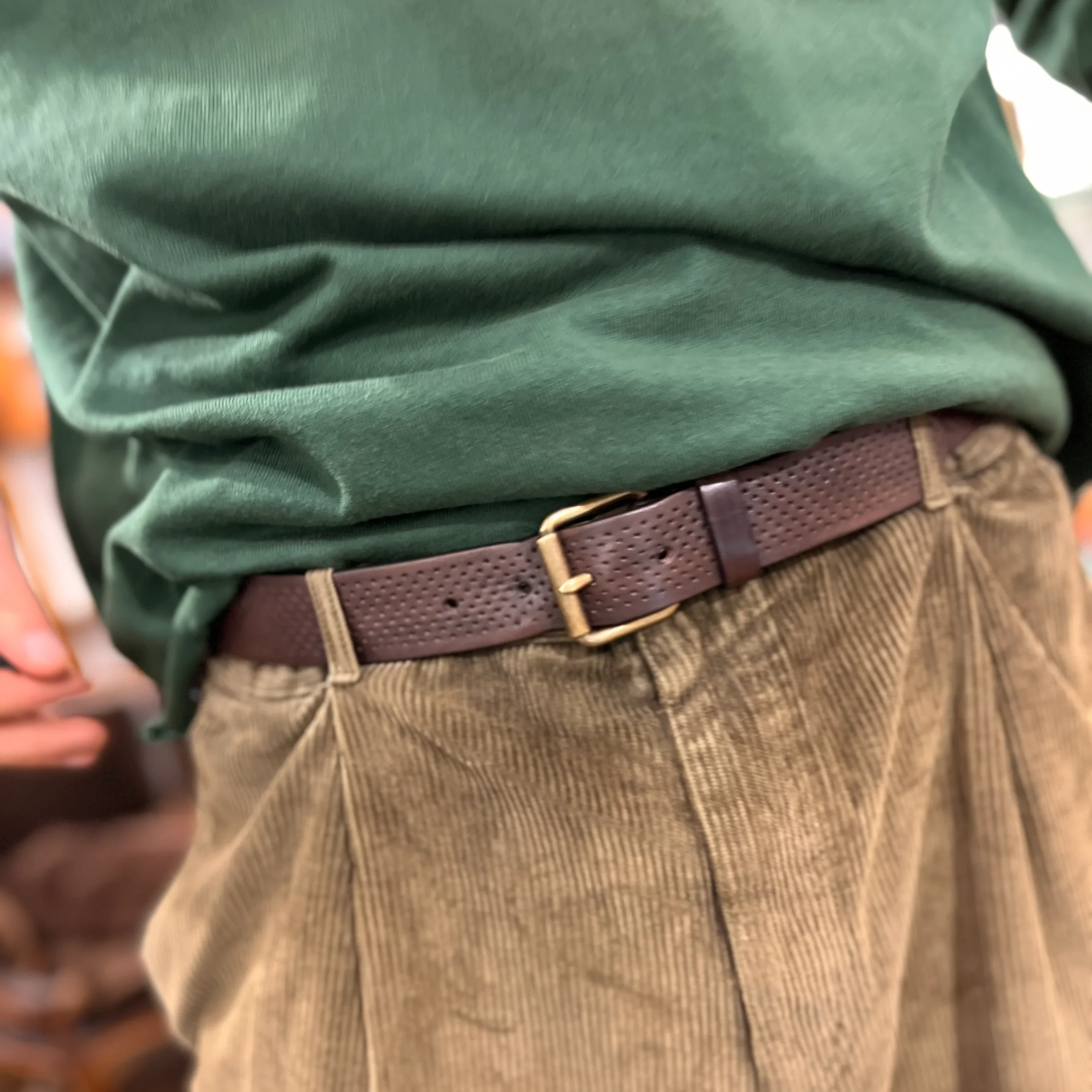 Cette ceinture en cuir perforé marron, boucle ardillon vieil or, se porte en jean ou en chino.