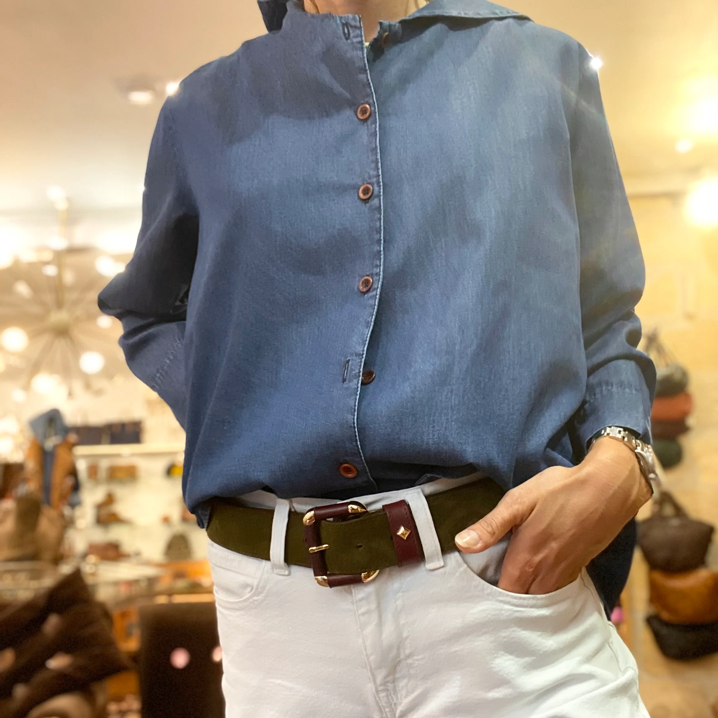 Cette ceinture, en croûte de cuir velours, est un vrai accessoire grâce à ses détails bijouterie dorés, et son bi-matière, dégaine, un poil sophistiquée. Existe aussi en Velours Tobacco et cuir caramel. Largeur: 4.5cm Fabriqué en France, à Fougères en Bretagne.