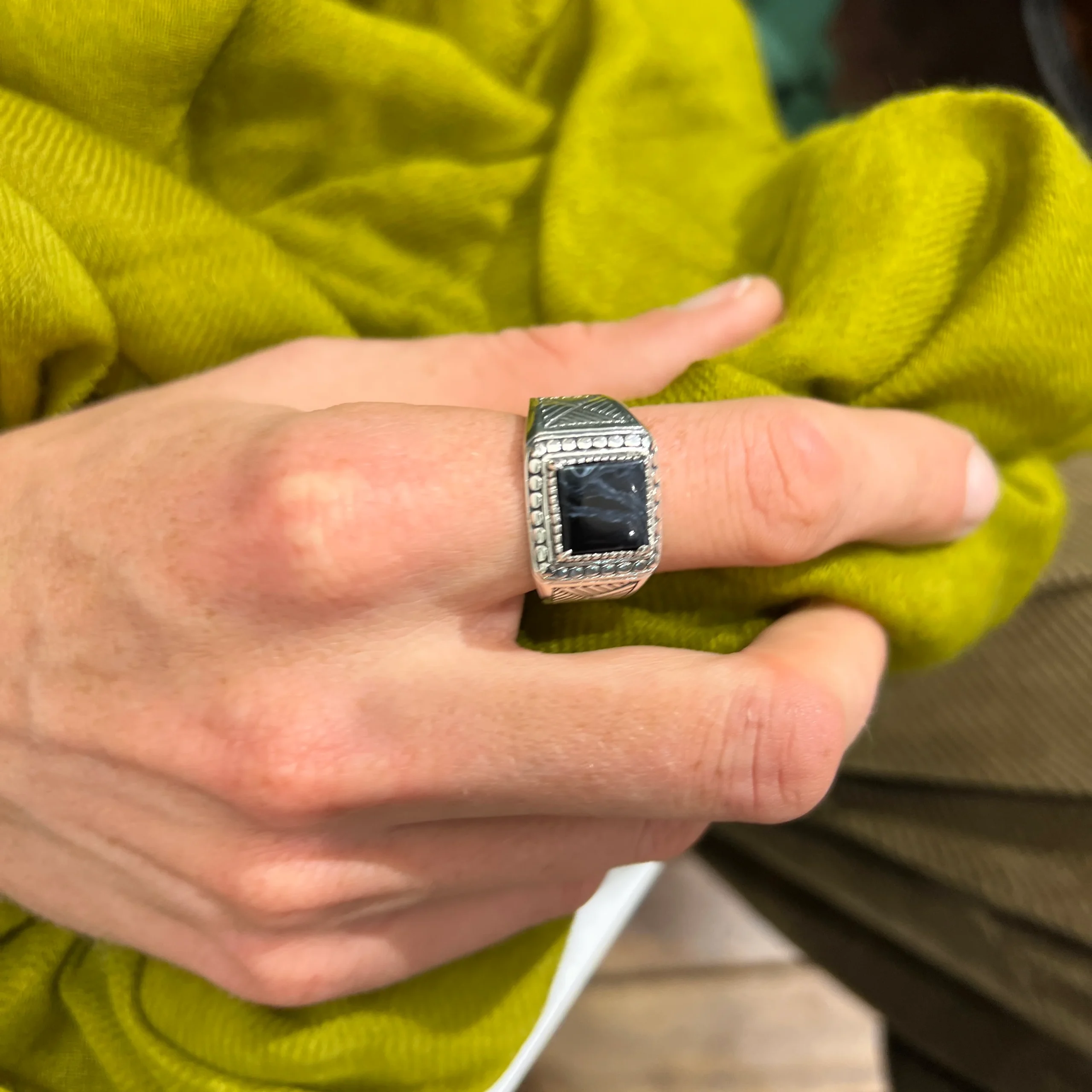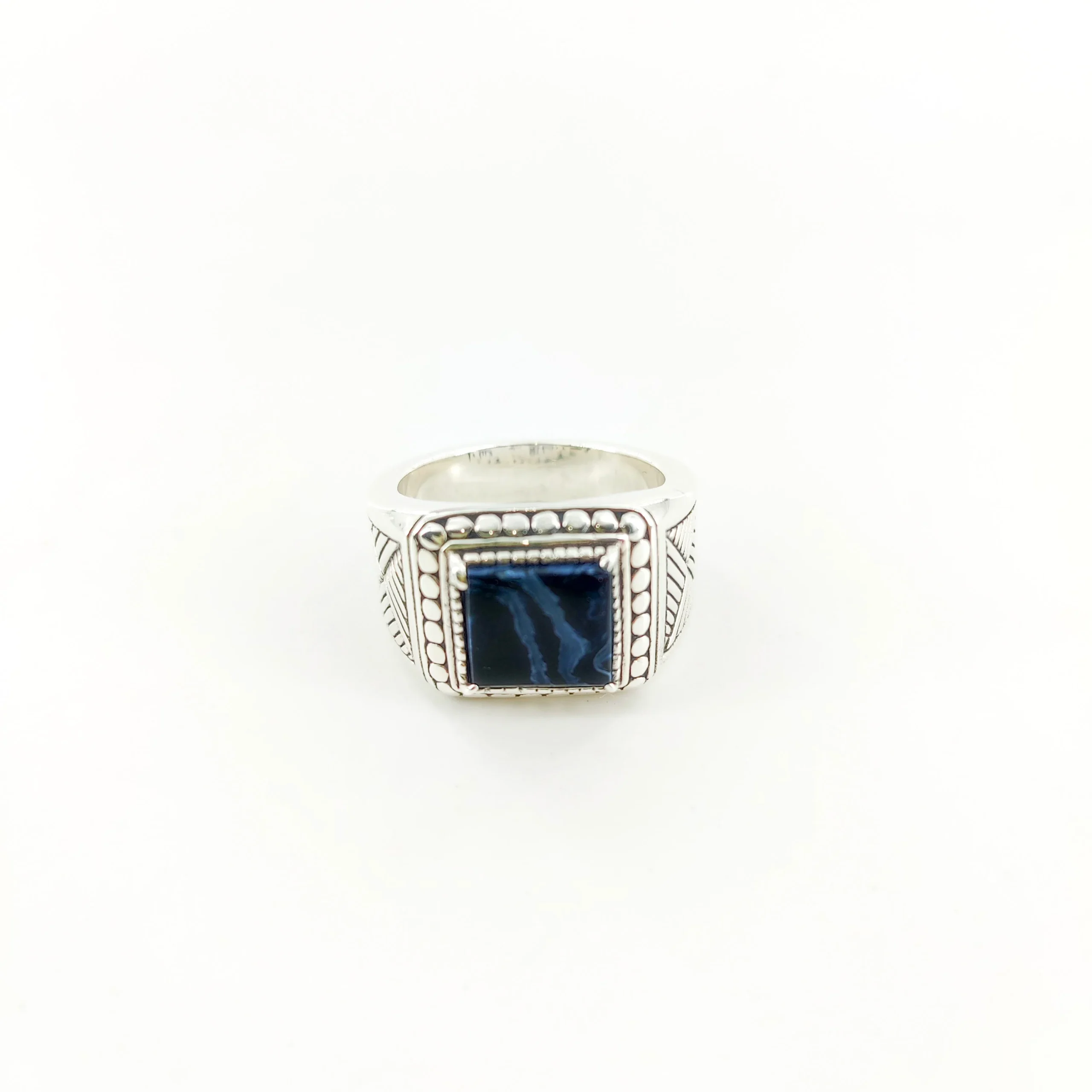 Chevalière en Argent 925 travaillé, sertie d’une Piétersite Bleue. Chaque pierre est unique, sa couleur peut varier ce qui en fait sa rareté.