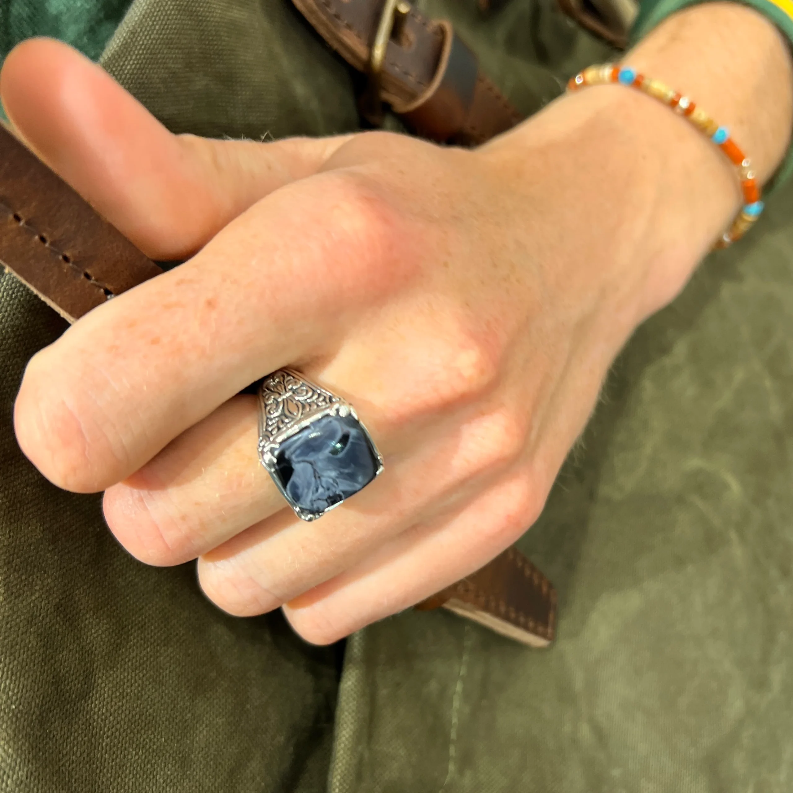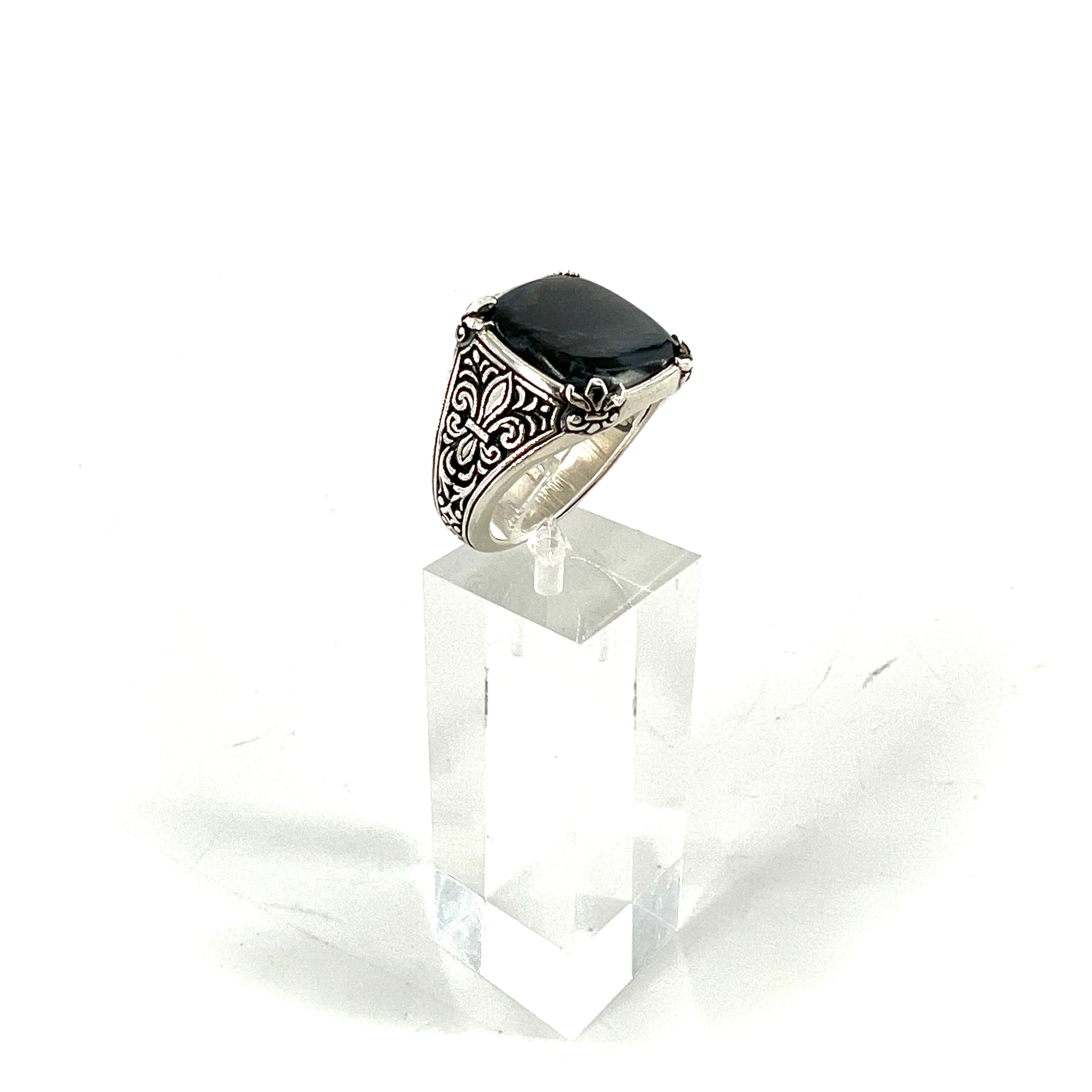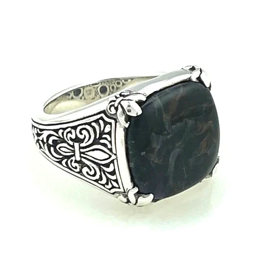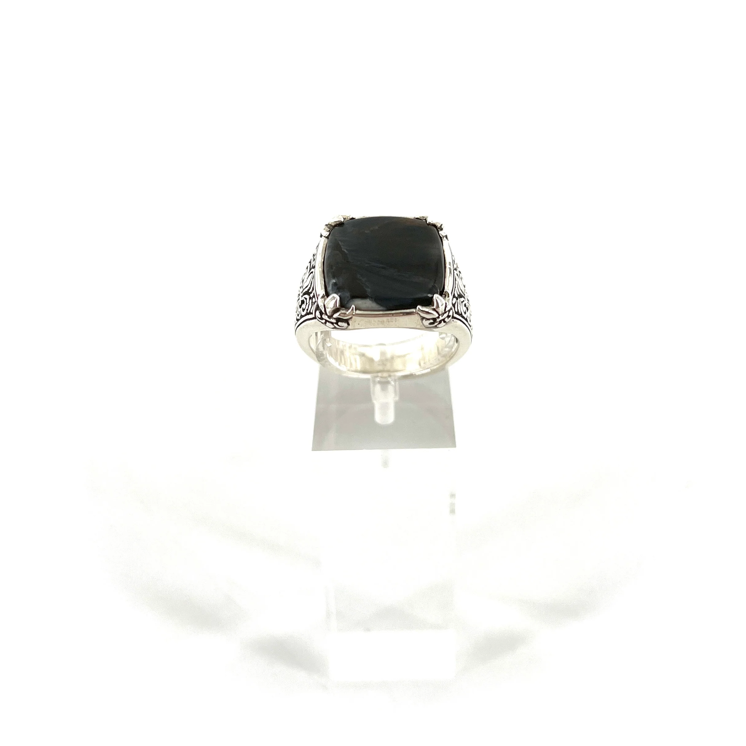 Chevalière en Argent 925 travaillé, sertie d’une Piétersite Bleue. Chaque pierre est unique, sa couleur peut varier ce qui en fait sa rareté.