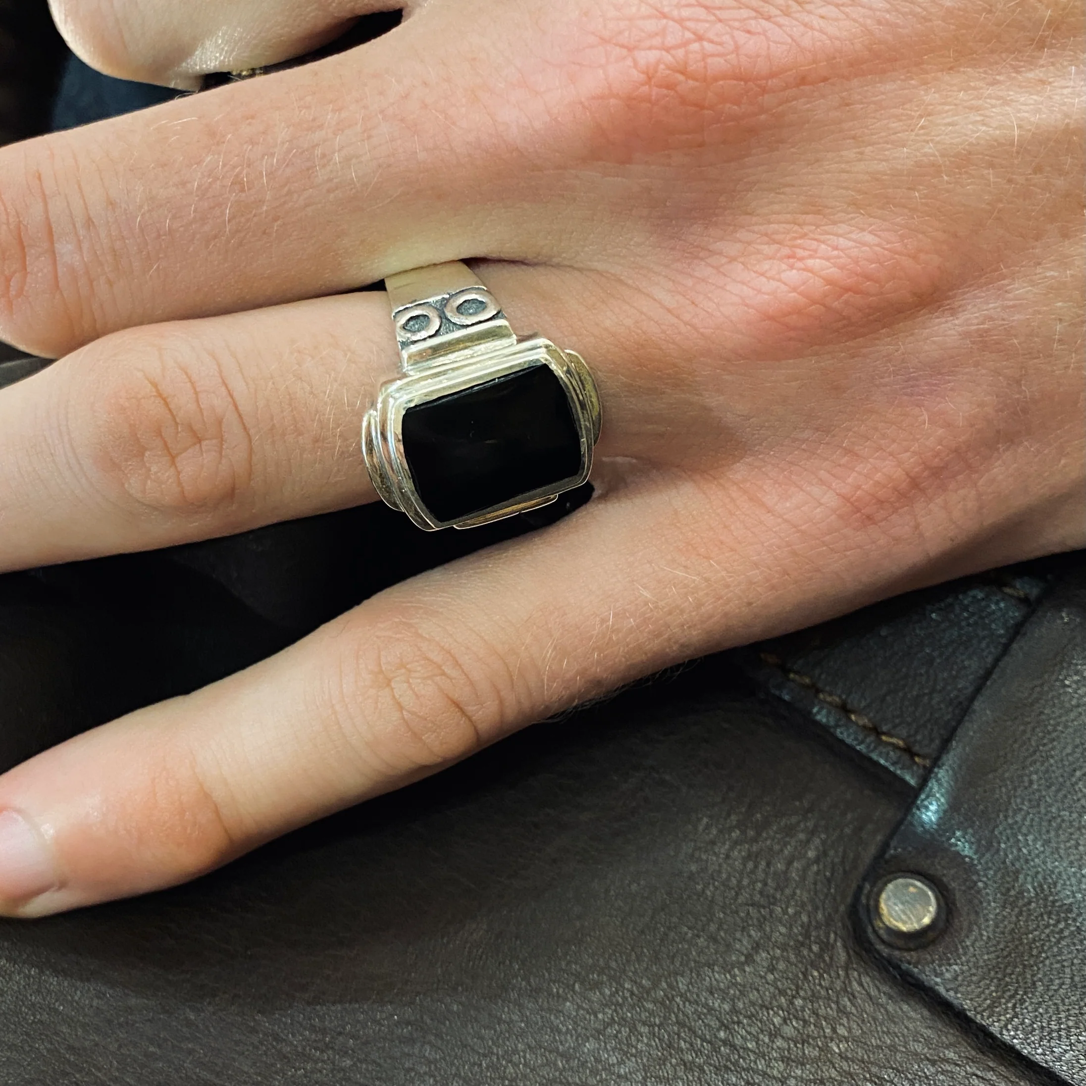 Chevalière Rectangulaire en Argent 925 gravée sertie d’un Onyx noir. Chaque pierre est unique, sa couleur peut varier ce qui en fait sa rareté. Existe aussi en Oeil de Tigre et en Turquoise.