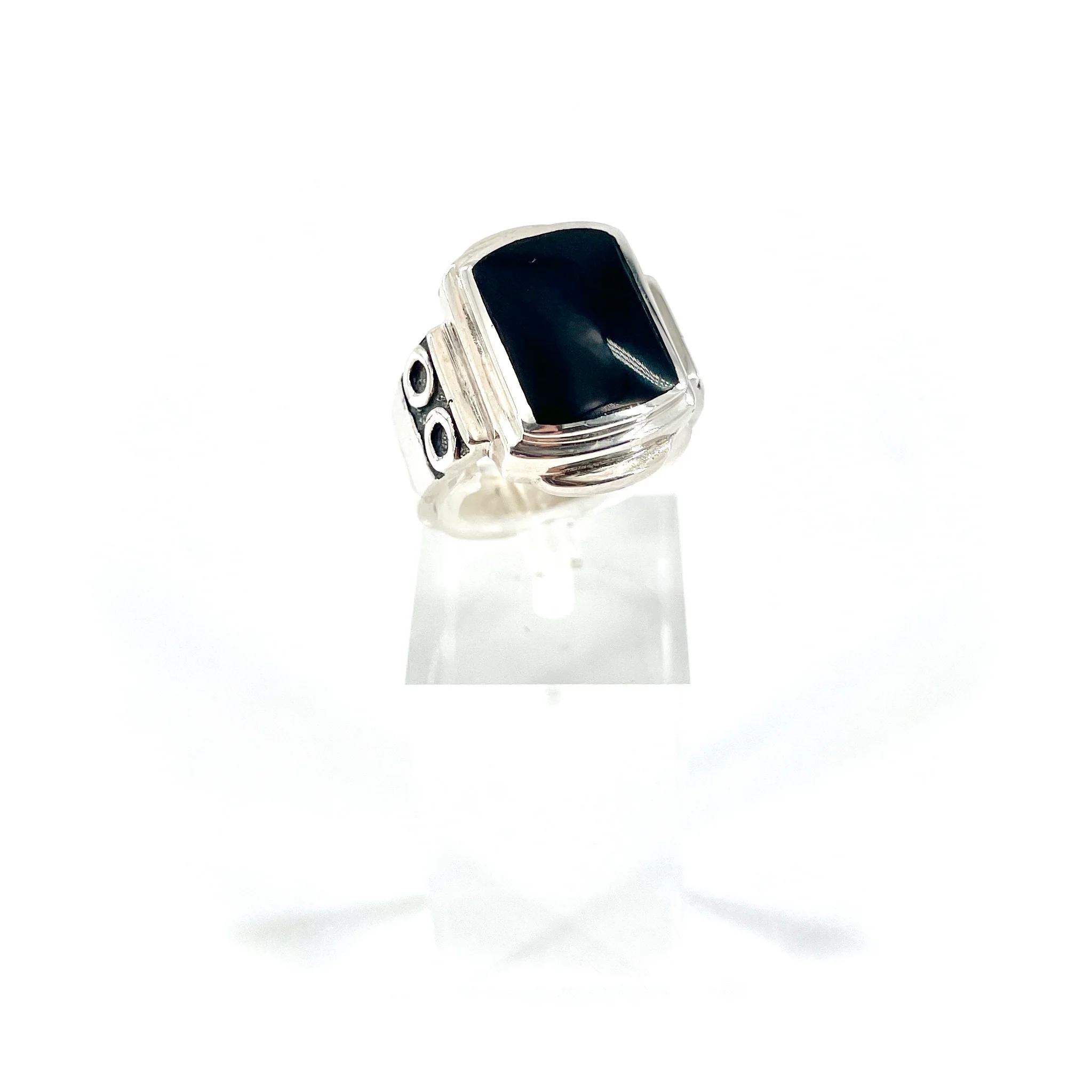 Chevalière Rectangulaire en Argent 925 gravée sertie d’un Onyx noir.
