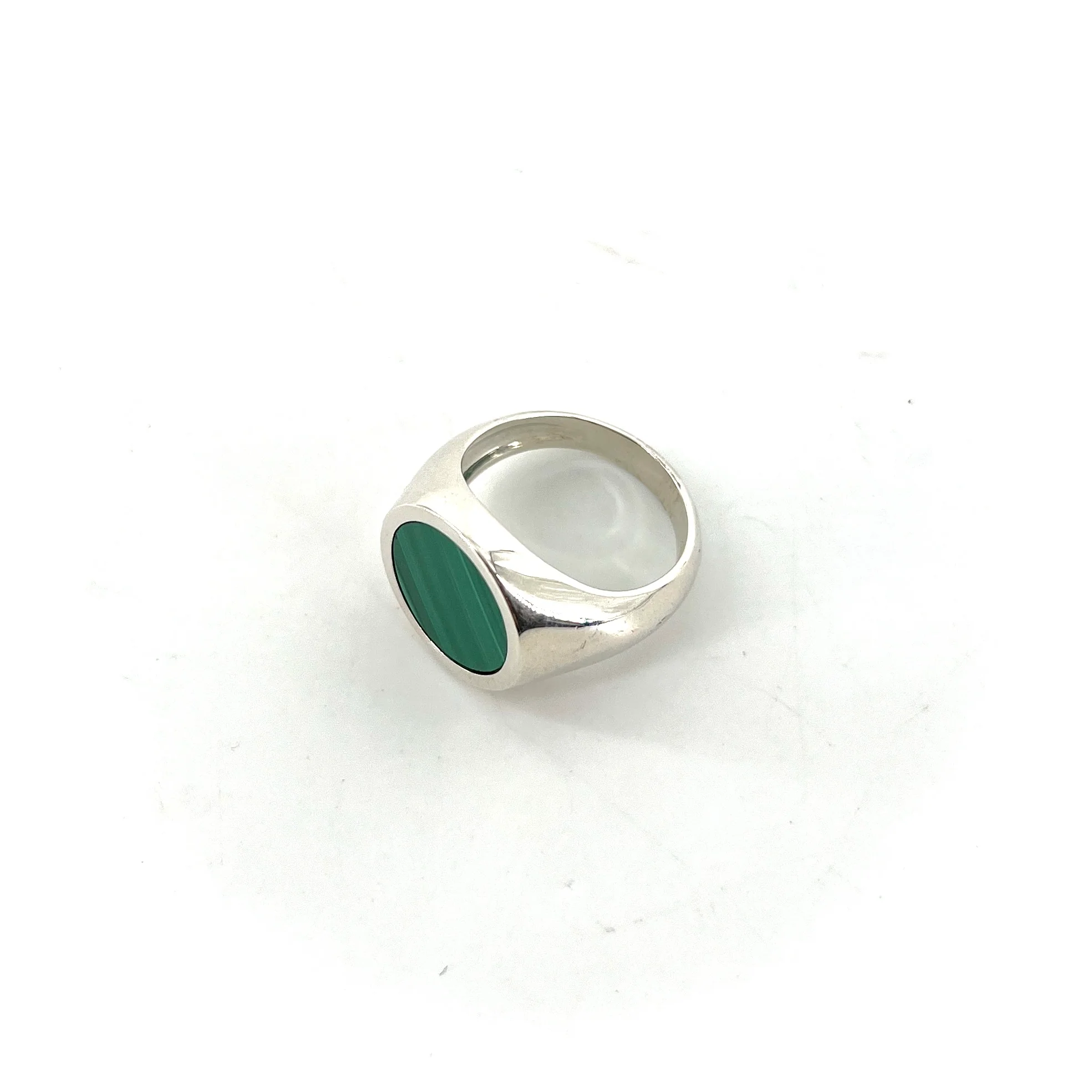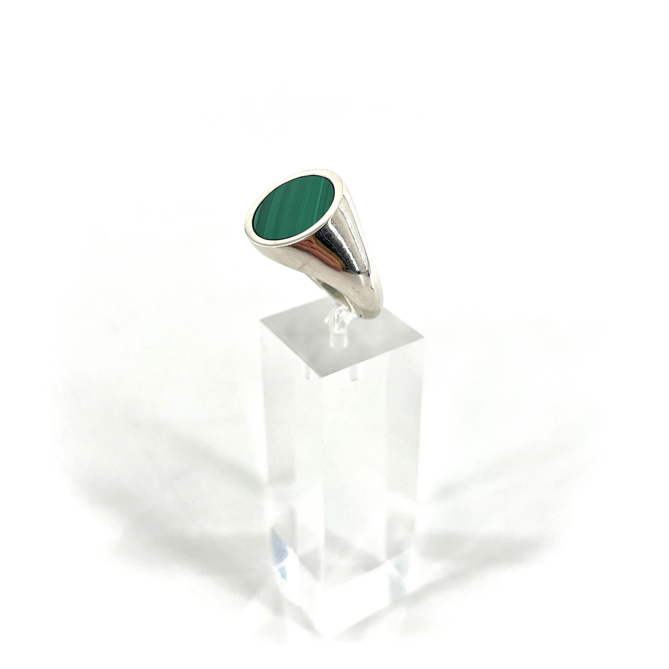 Chevalière ronde en argent 925 lisse, sertie d’une malachite.
