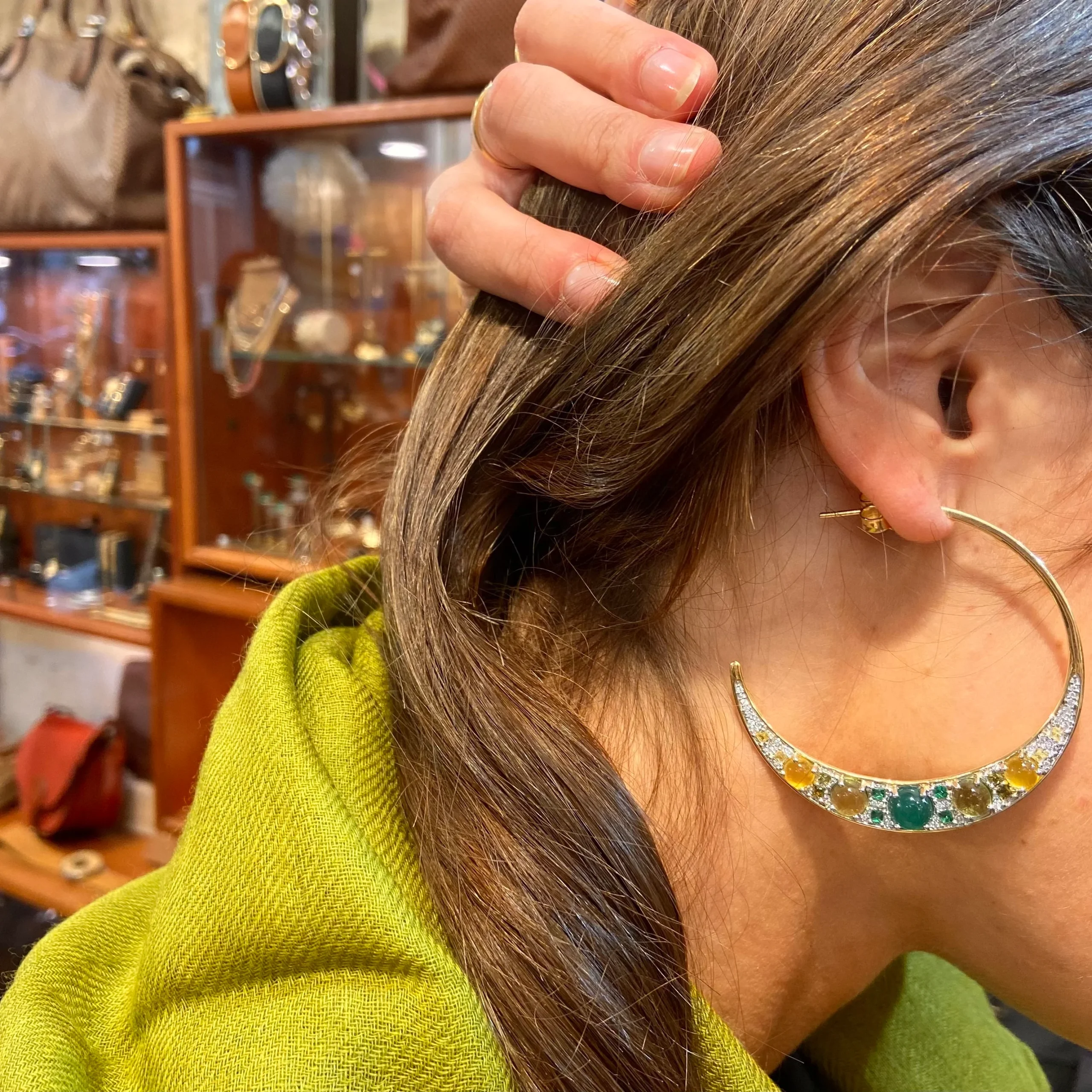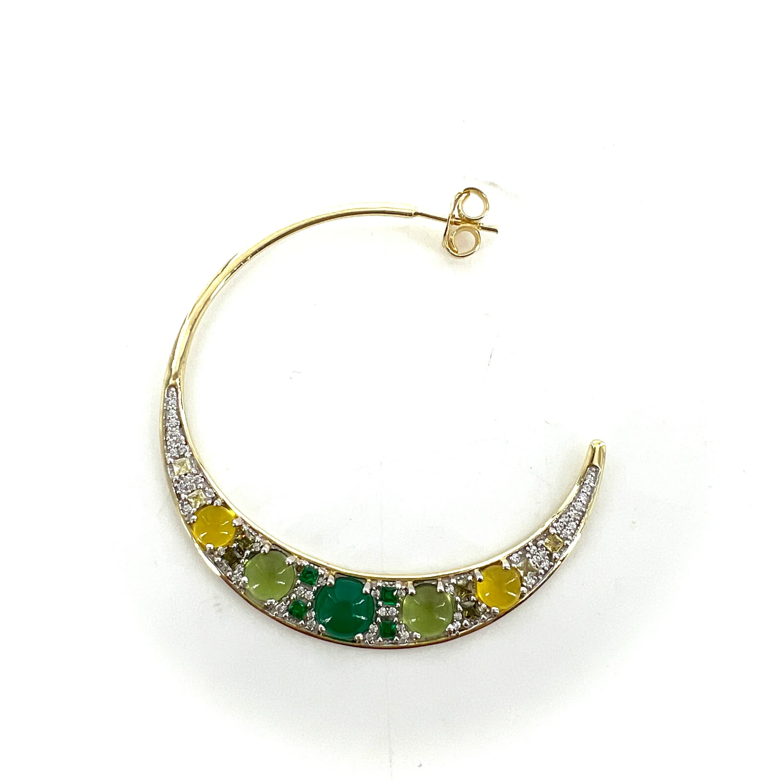 Ces grandes créoles, tige oreille percée, se composent de cabochons d’Onyx Vert, de Prehnite et de Citrine, agrémentés de zirconiums.Ultra-présente, à porter avec tout en toutes circonstances! Diamètre: 5.5cm Doré à l’Or fin 18 carats.Chaque pierre est unique, sa couleur peut varier ce qui en fait sa rareté.