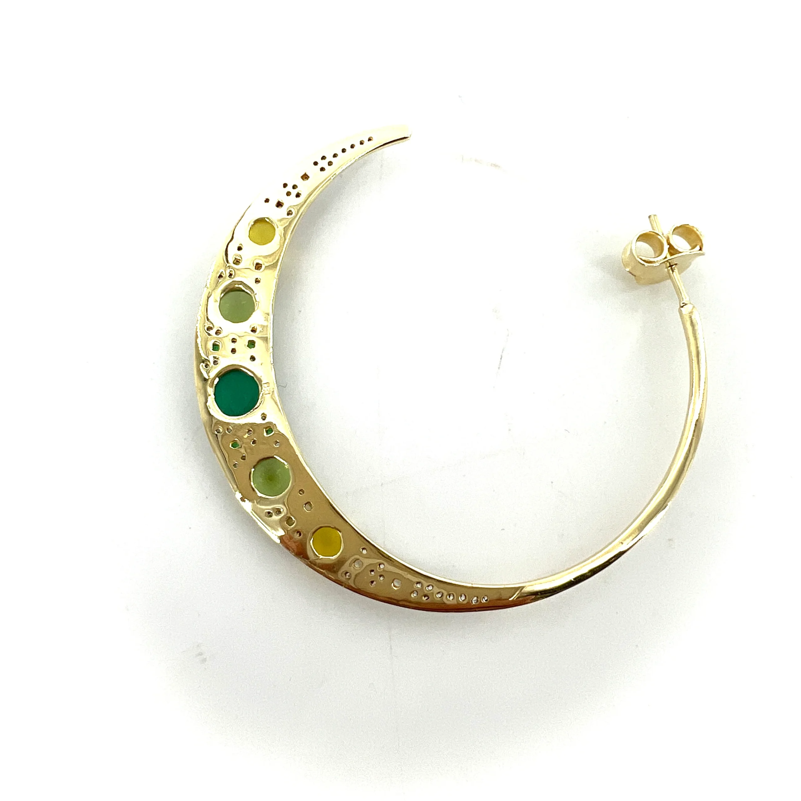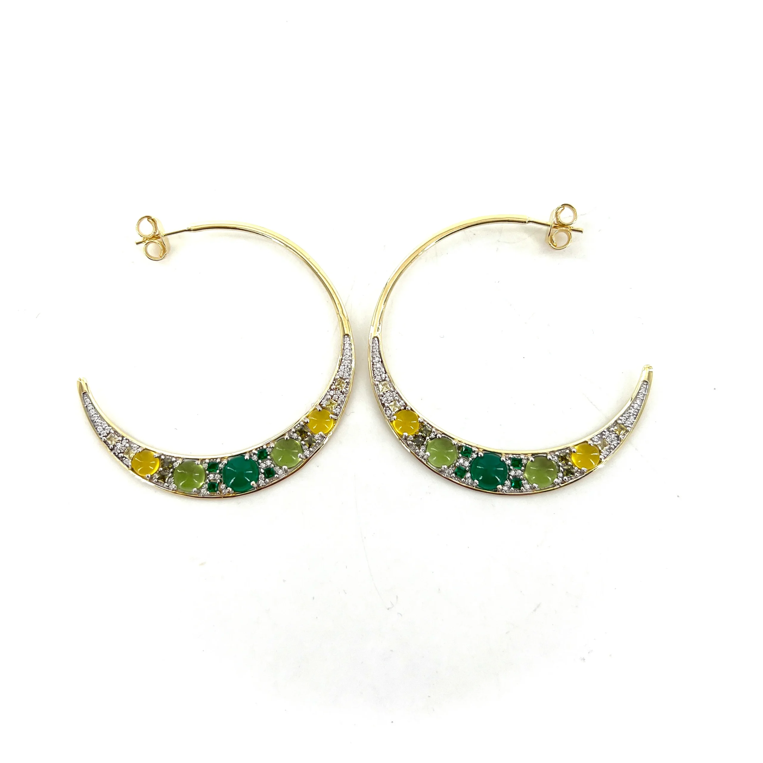 Ces grandes créoles, tige oreille percée, se composent de cabochons d’Onyx Vert, de Prehnite et de Citrine, agrémentés de zirconiums.