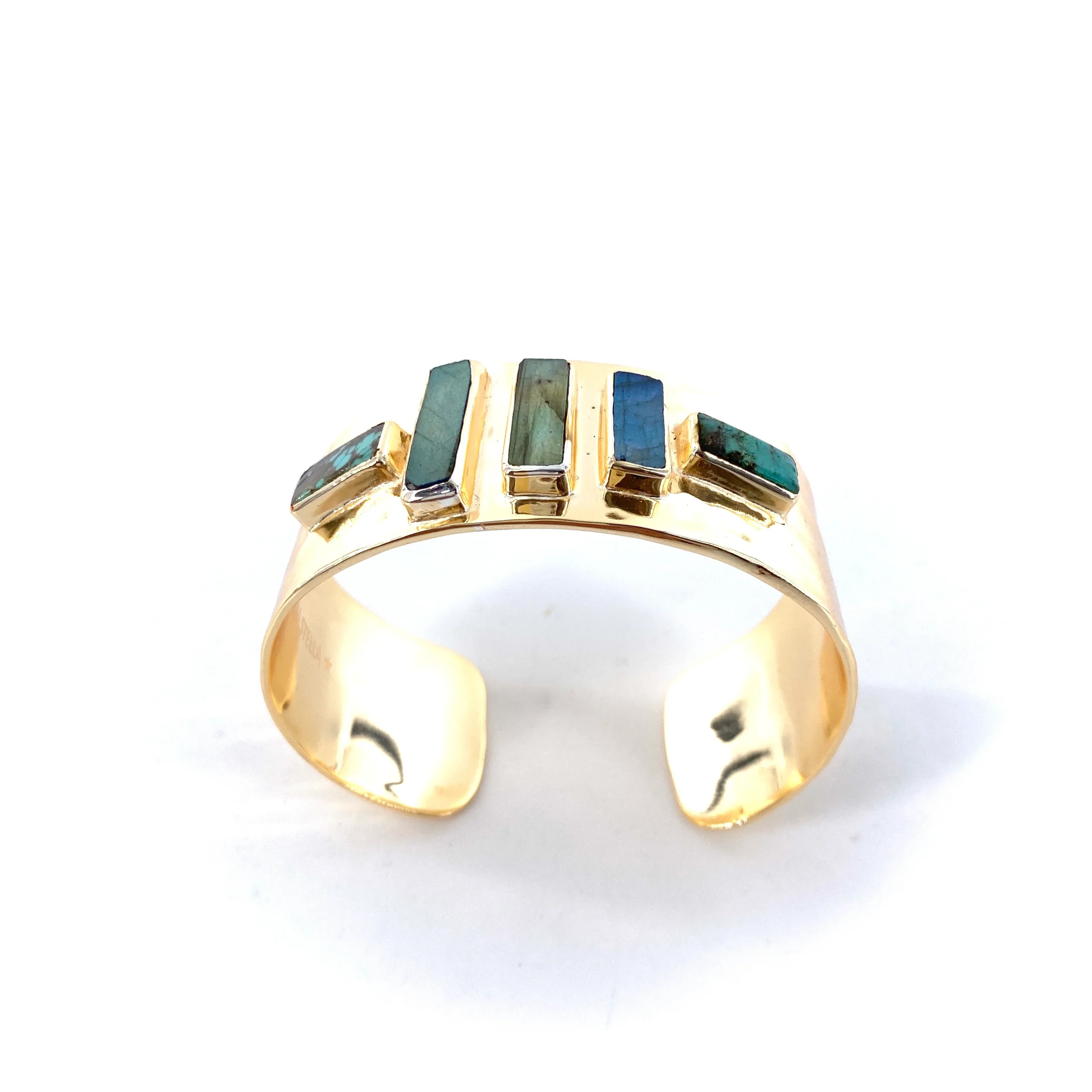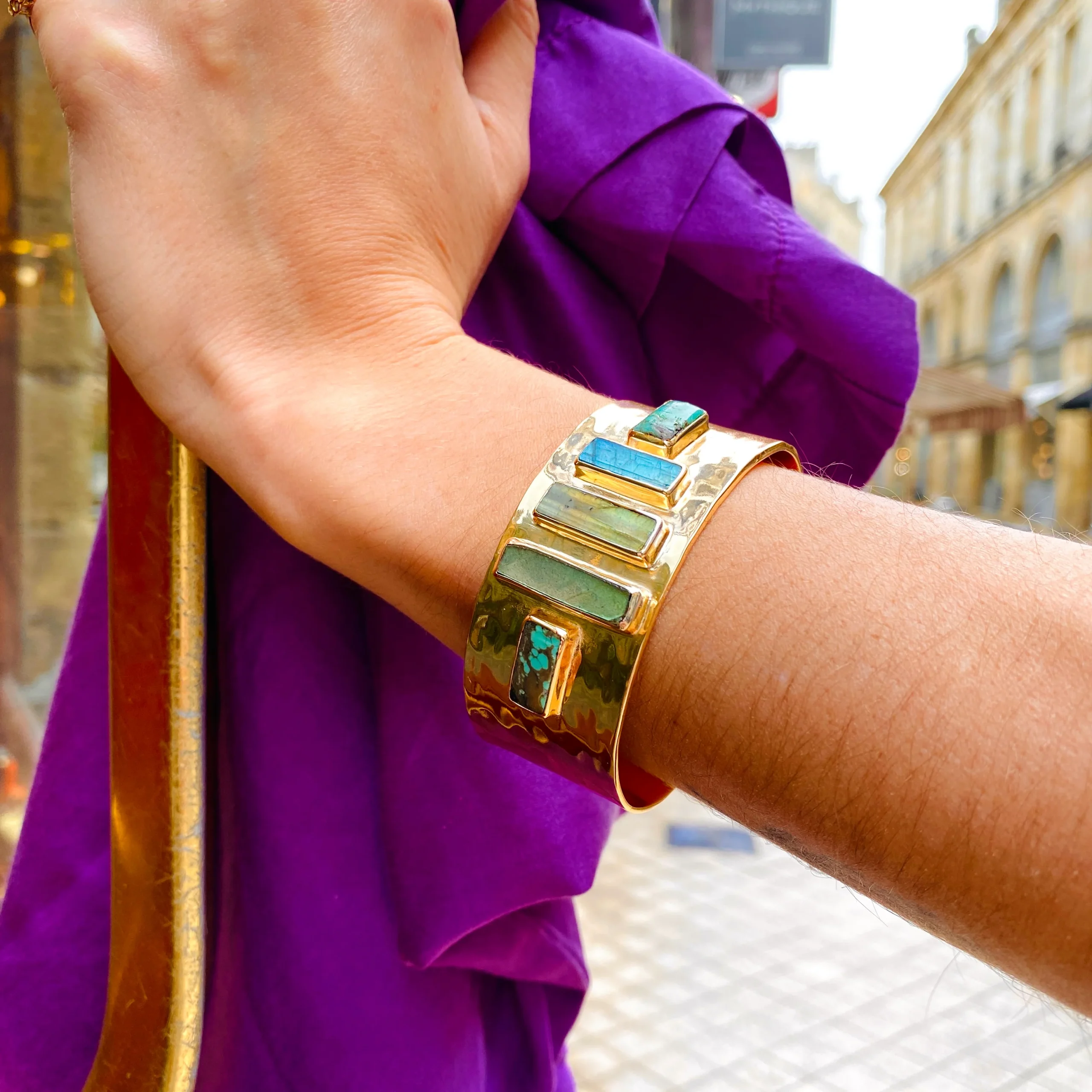 Large manchette, en plaqué Or martelé, ornée de deux turquoises encadrant trois labradorites rectangulaires.Ce jonc large, et présent, s’adapte à tous les poignets.Plaqué Or.Pierres semi-précieuses sélectionnées en Inde.Chaque pierre étant unique sa couleur peut varier, ce qui en fait sa rareté.