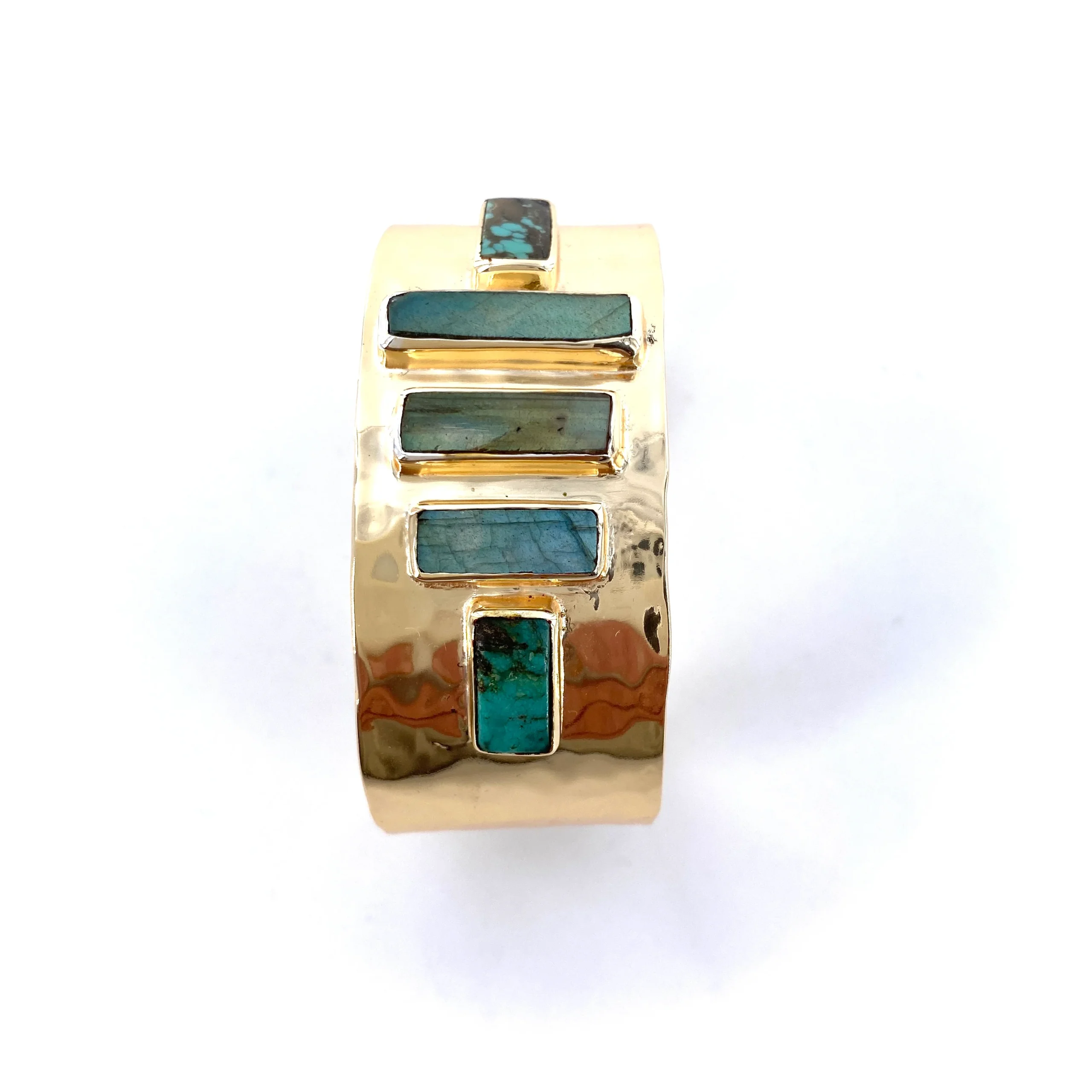 Large manchette, en plaqué Or martelé, ornée de deux turquoises encadrant trois labradorites rectangulaires.