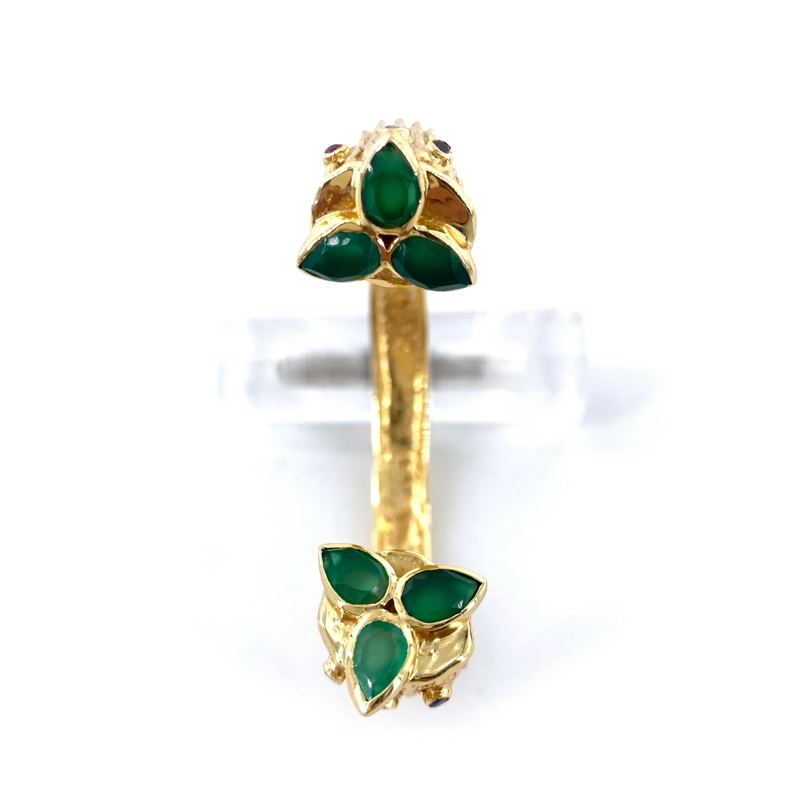 Ce jonc, en plaqué Or, est orné de Tourmalines aux couleurs différentes sur les côtés, et de deux fleurs en Onyx vert sur les deux extrémités.